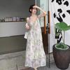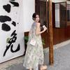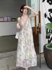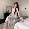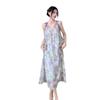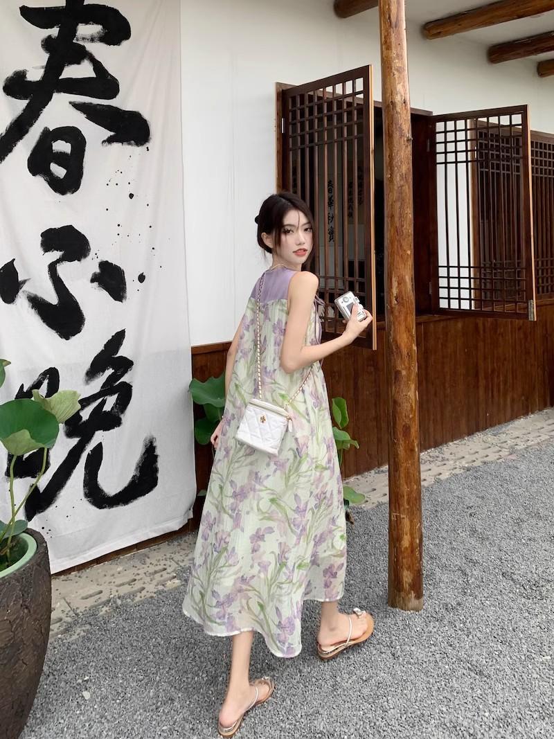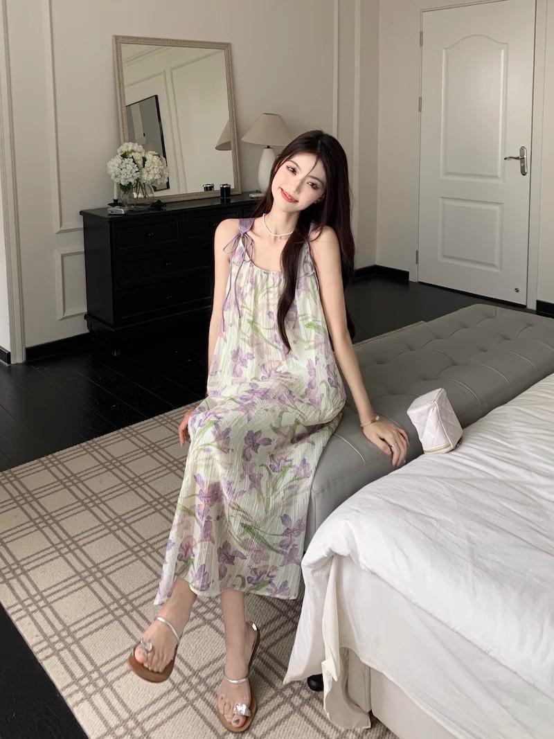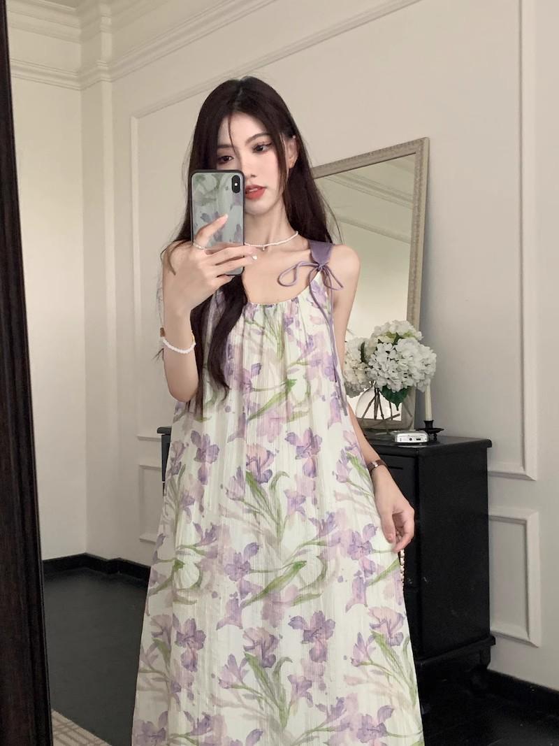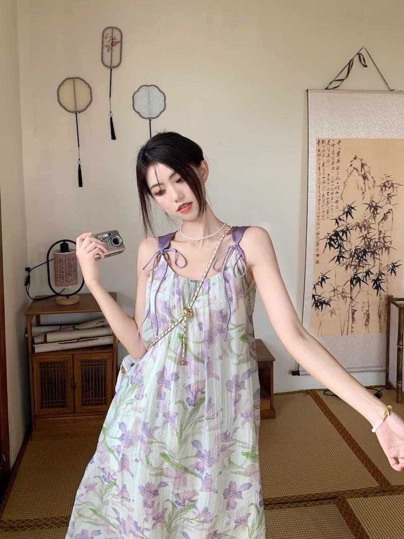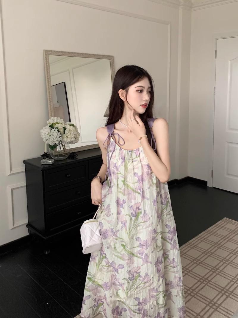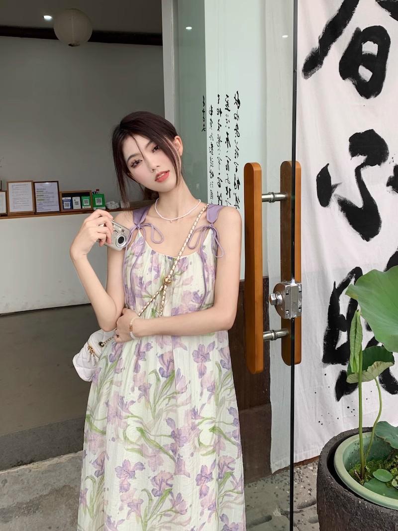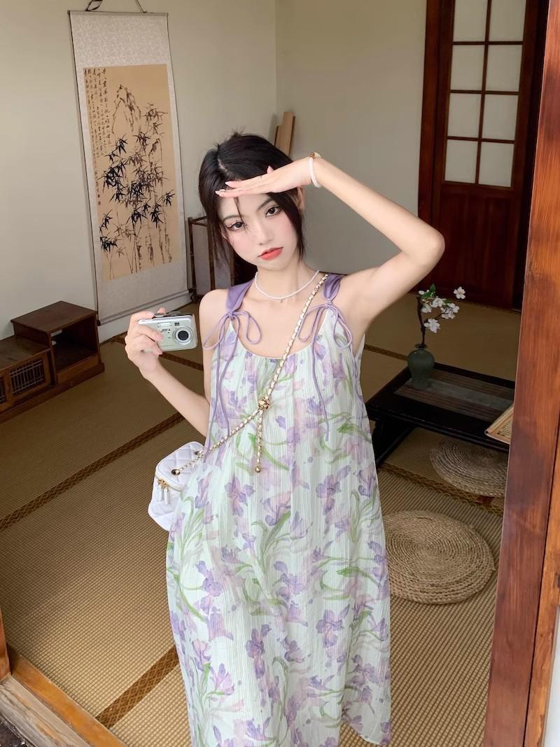 (con interior) Vestido largo elegante de verano con tirantes finos y estampado floral morado para mujer, estilo festivo y suave.