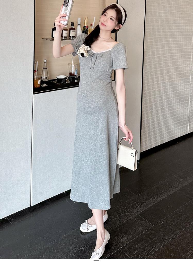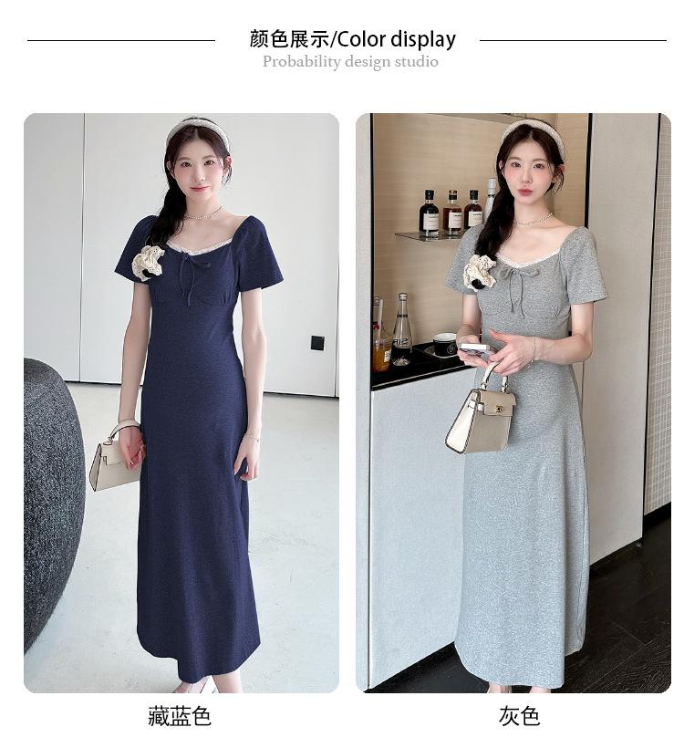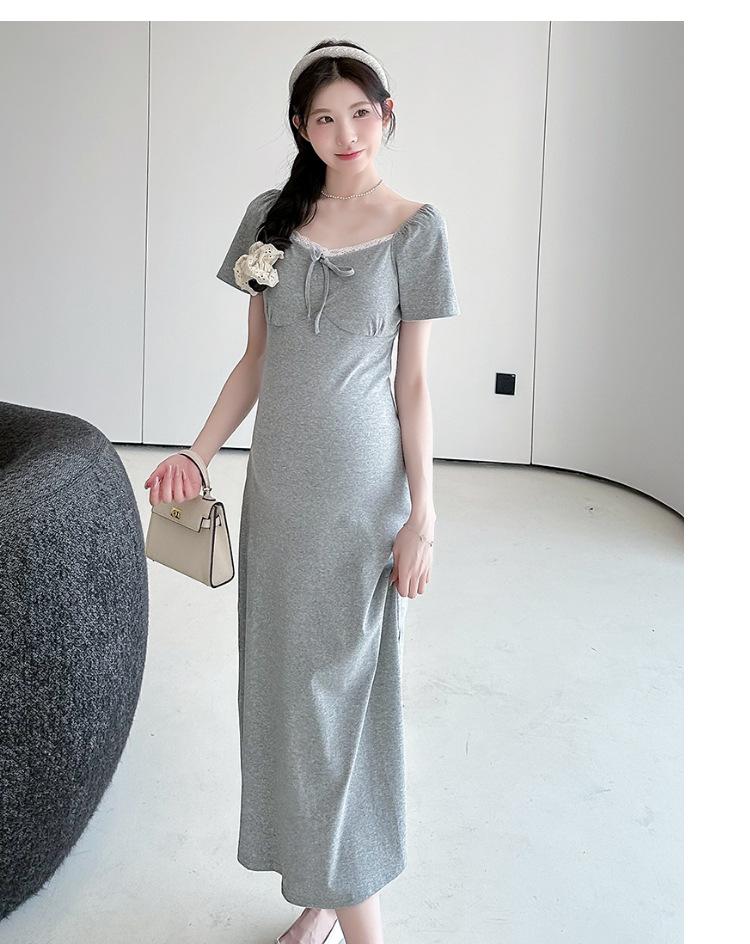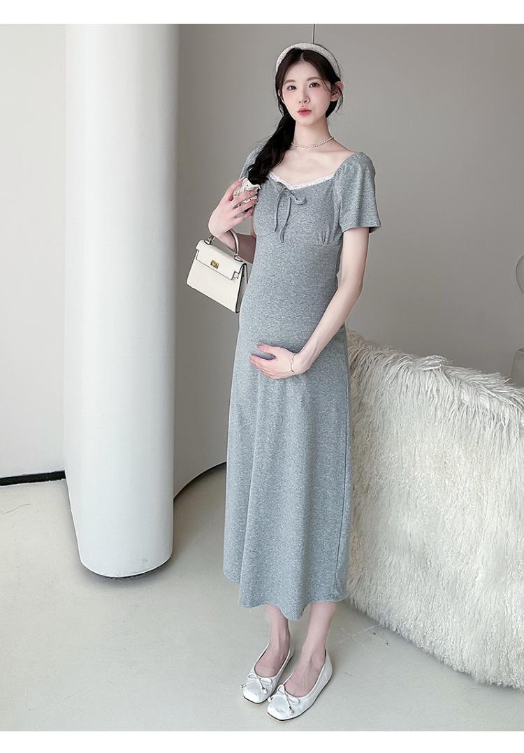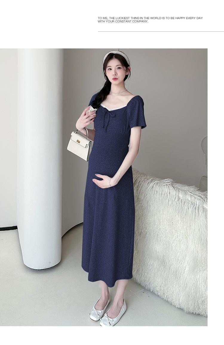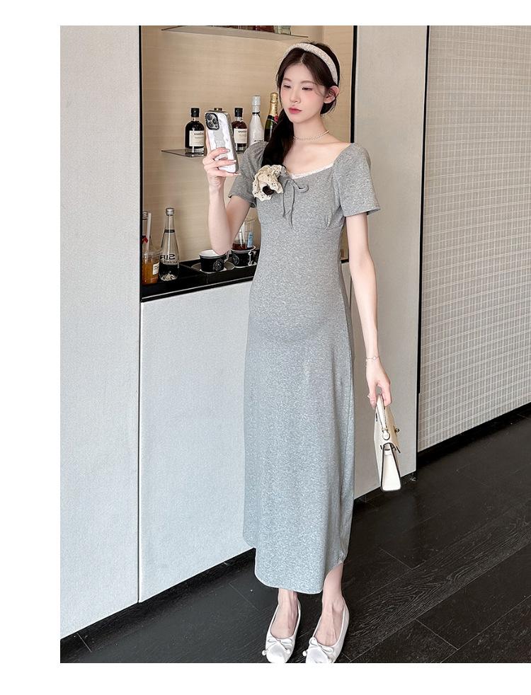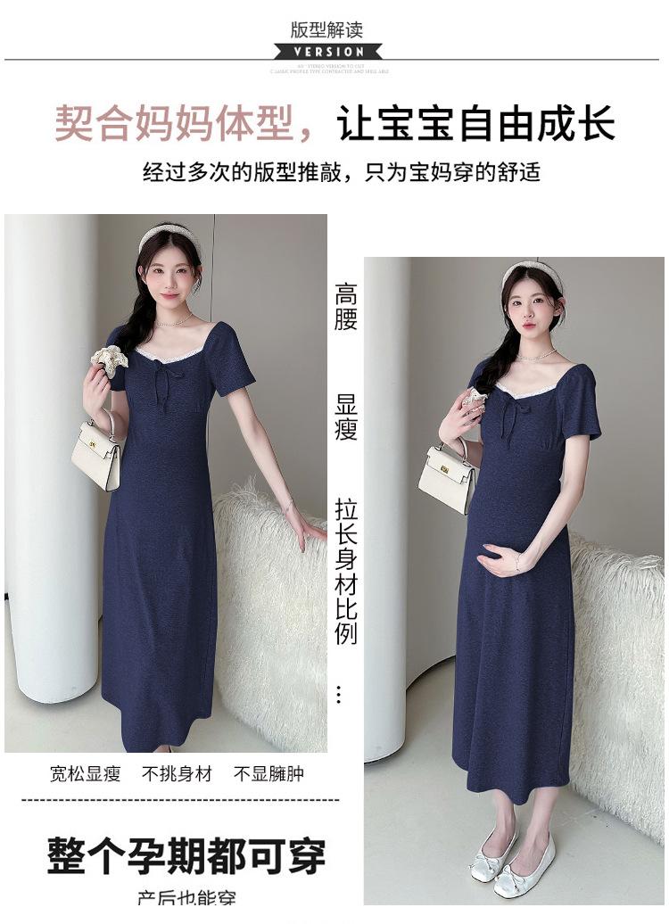 Vestido de maternidad de verano 2025 con lazo de encaje y costuras, elegante, adelgazante y de talla grande para embarazadas.