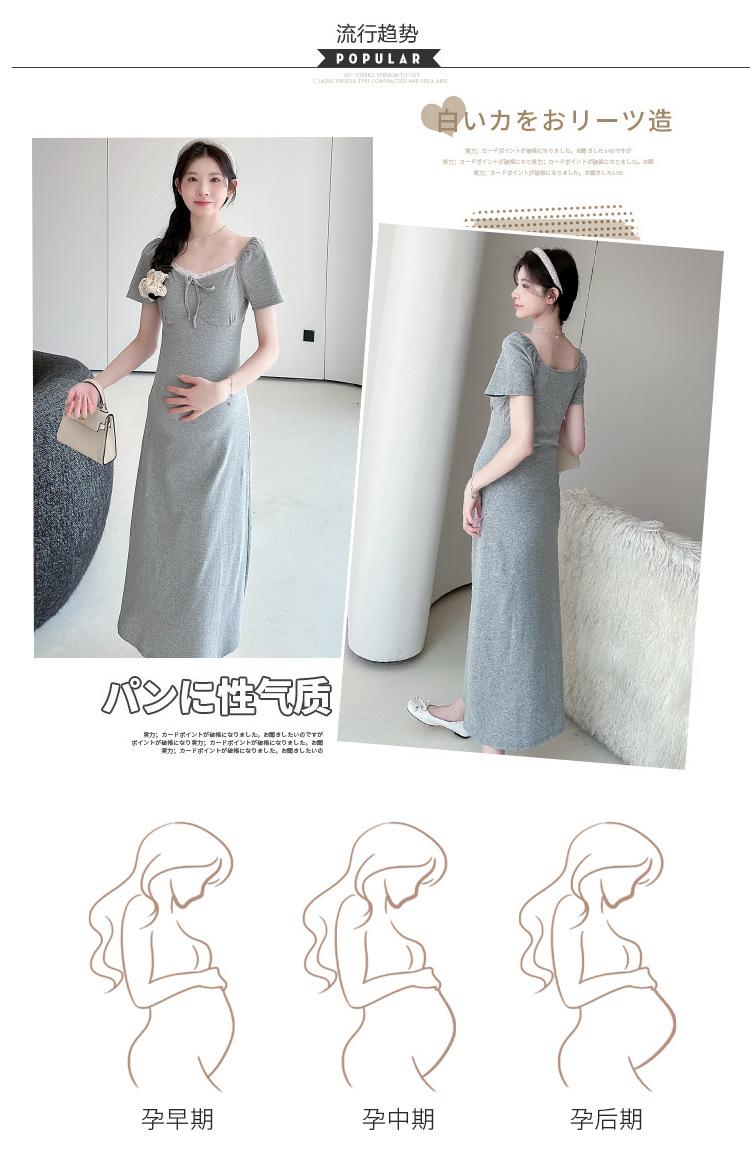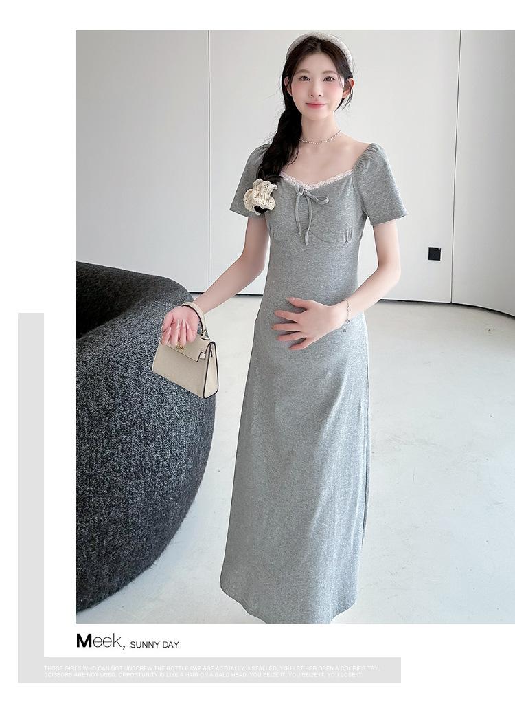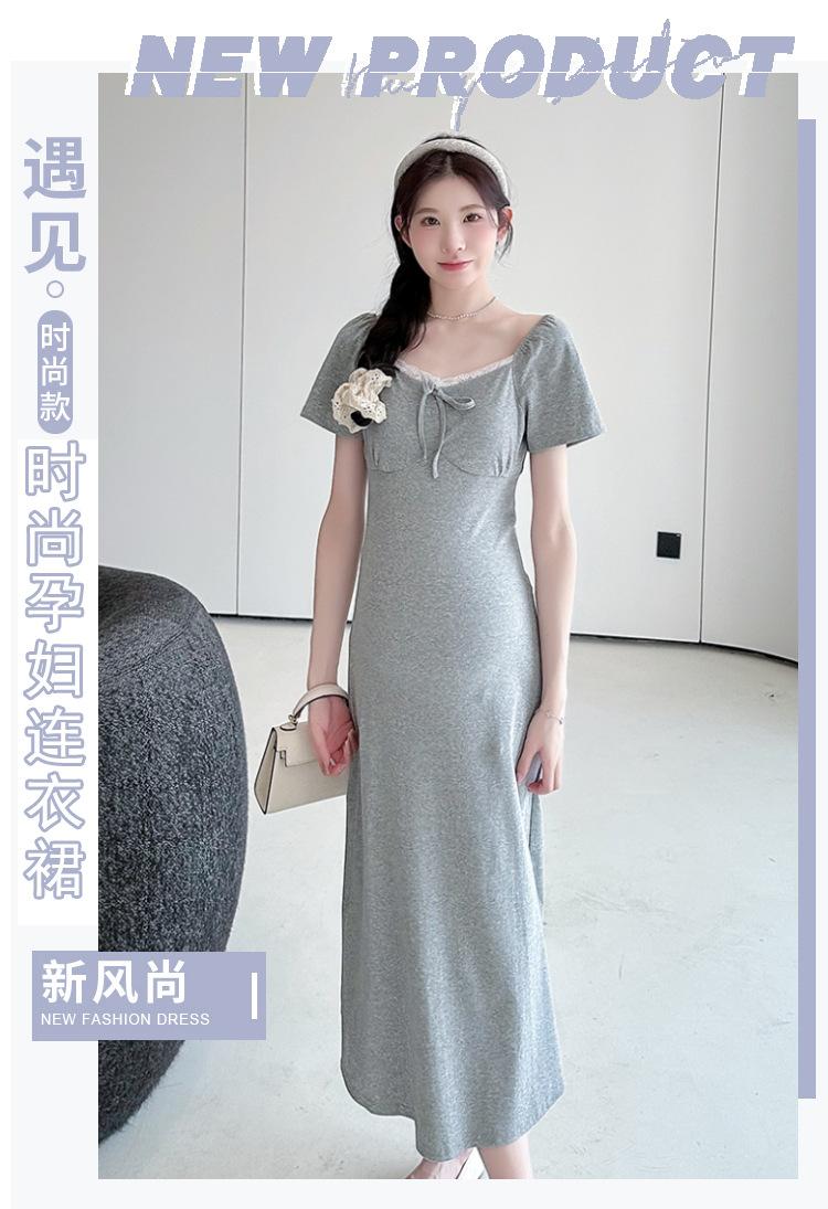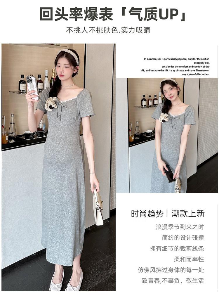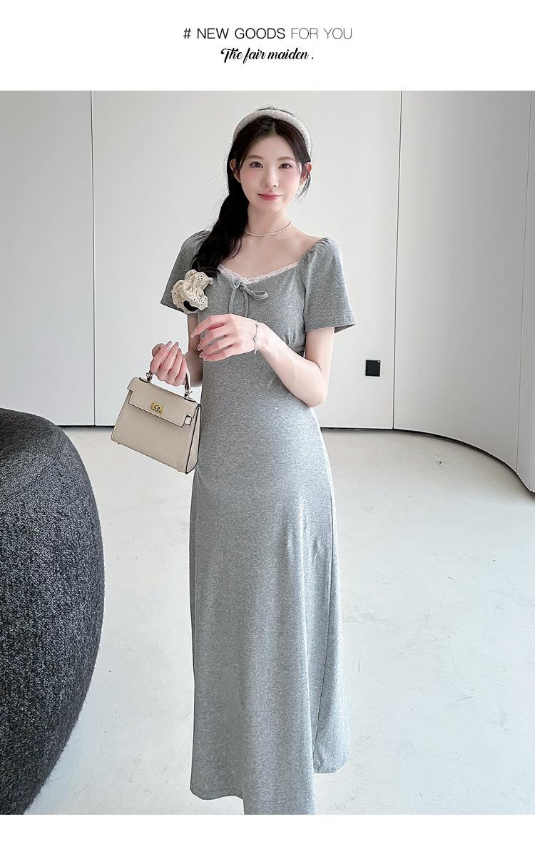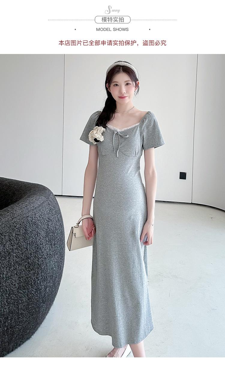 Vestido de maternidad de verano 2025 con lazo de encaje y costuras, elegante, adelgazante y de talla grande para embarazadas.