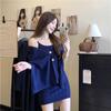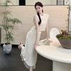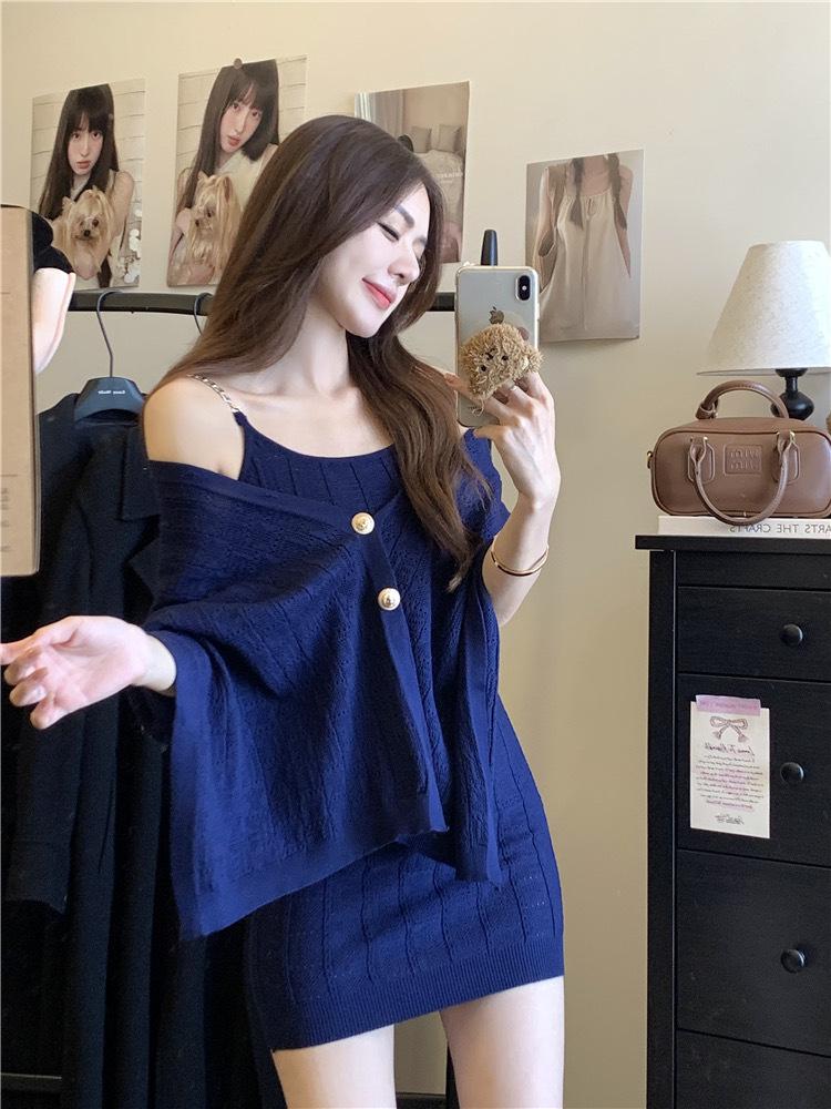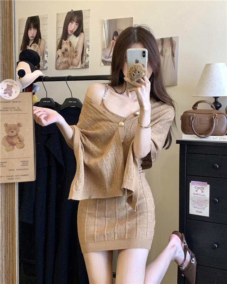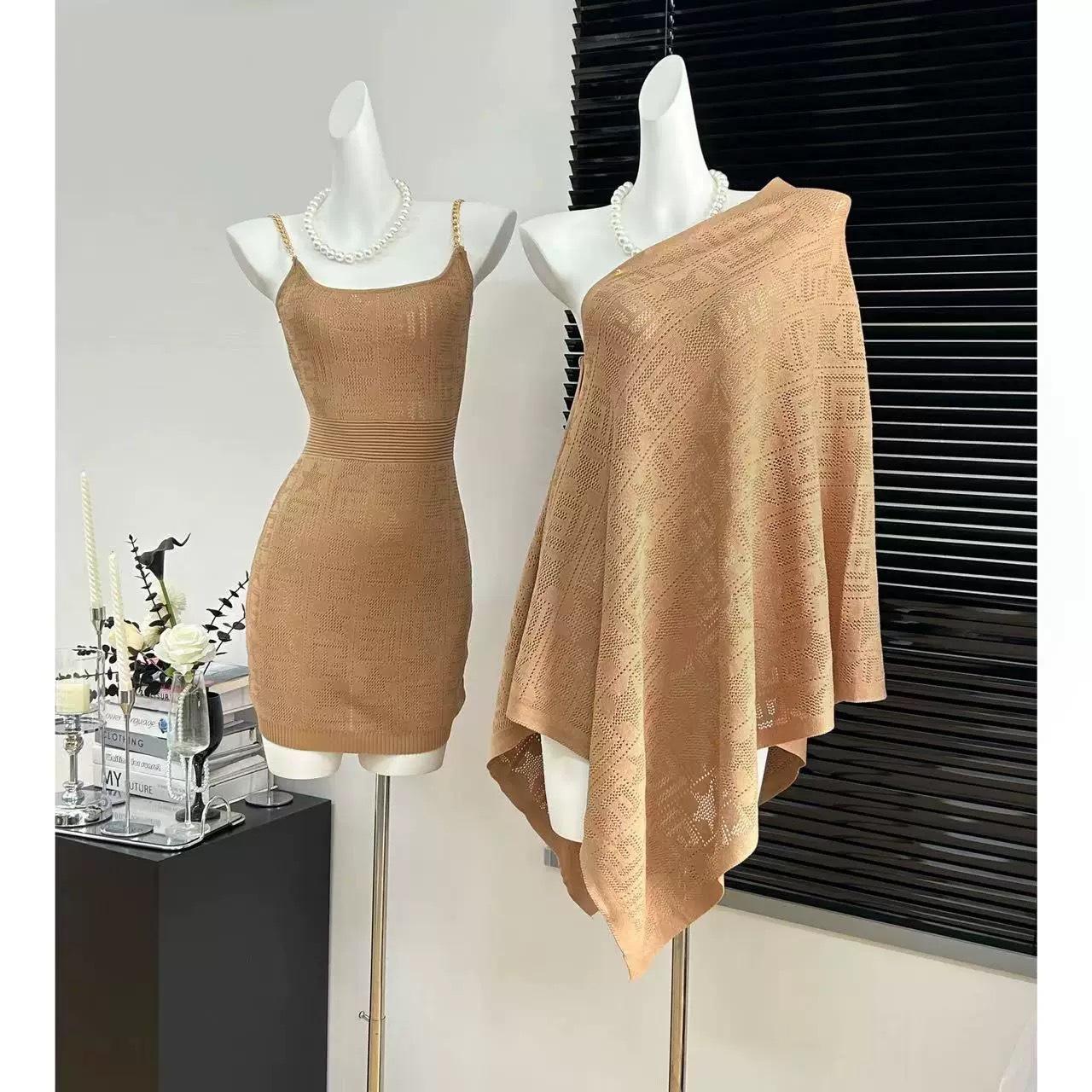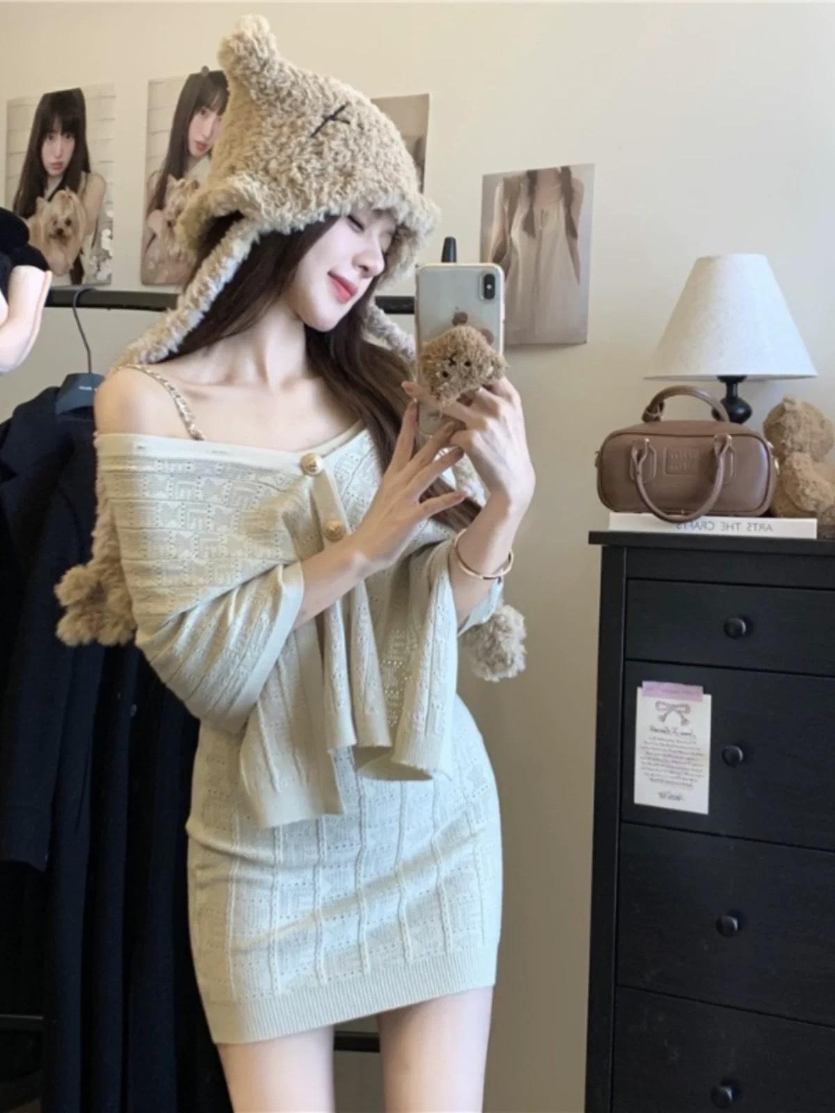 Pure Lust Elegante Estilo Dama Traje de Punto para Mujer Otoño 2025 Nuevo Vestido con Tirantes Capa Chal Conjunto de Dos Piezas