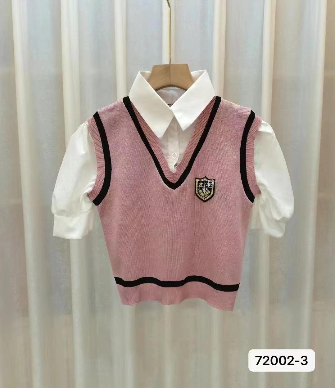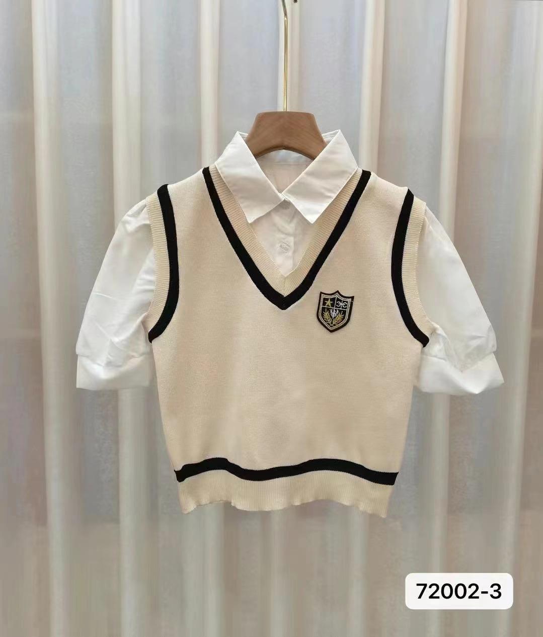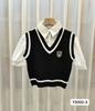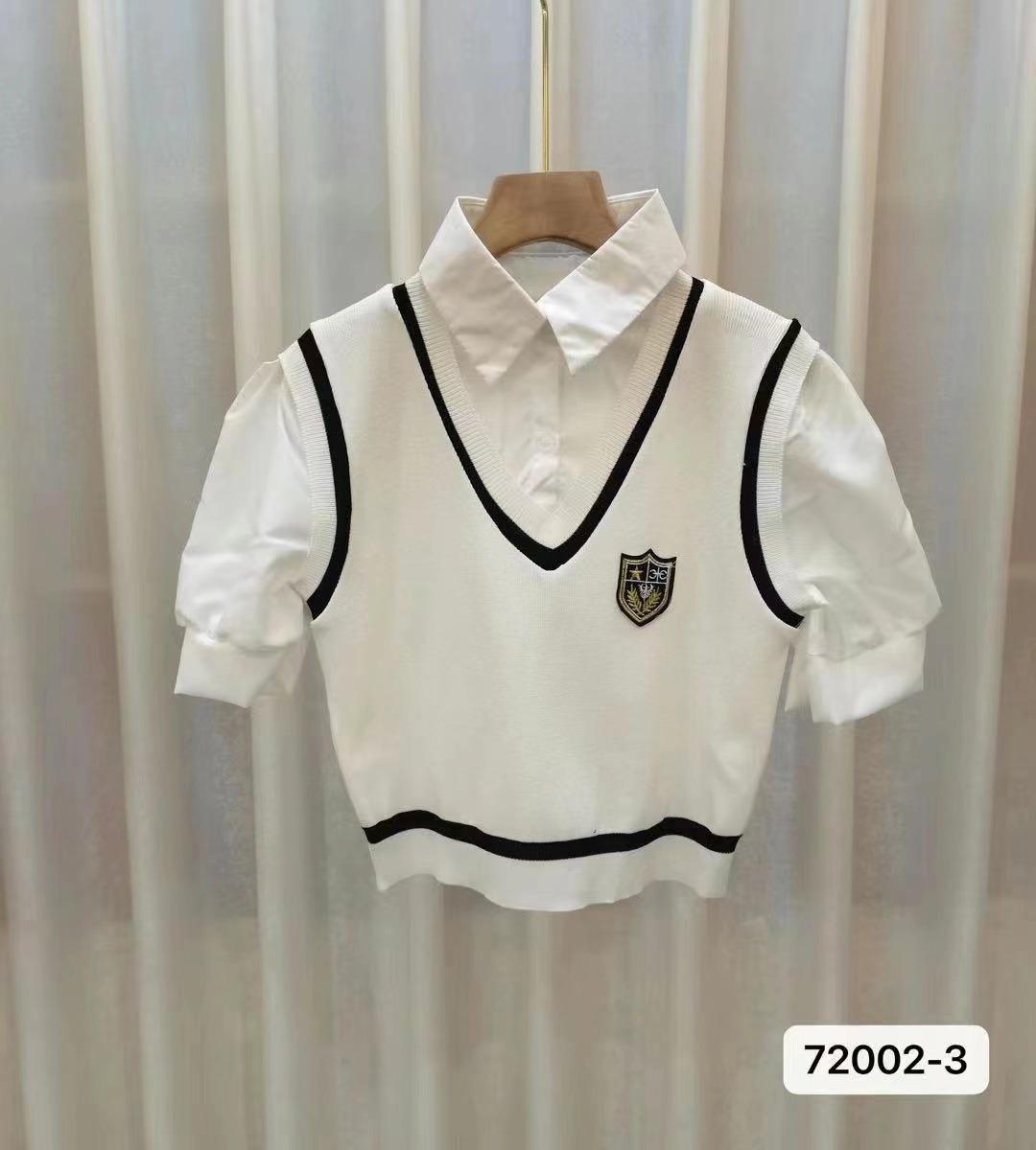 Estilo preppy estilo coreano cuello de camisa tejido color de contraste 2023 nuevo costuras diseño de manga corta de dos piezas falsas top para mujer