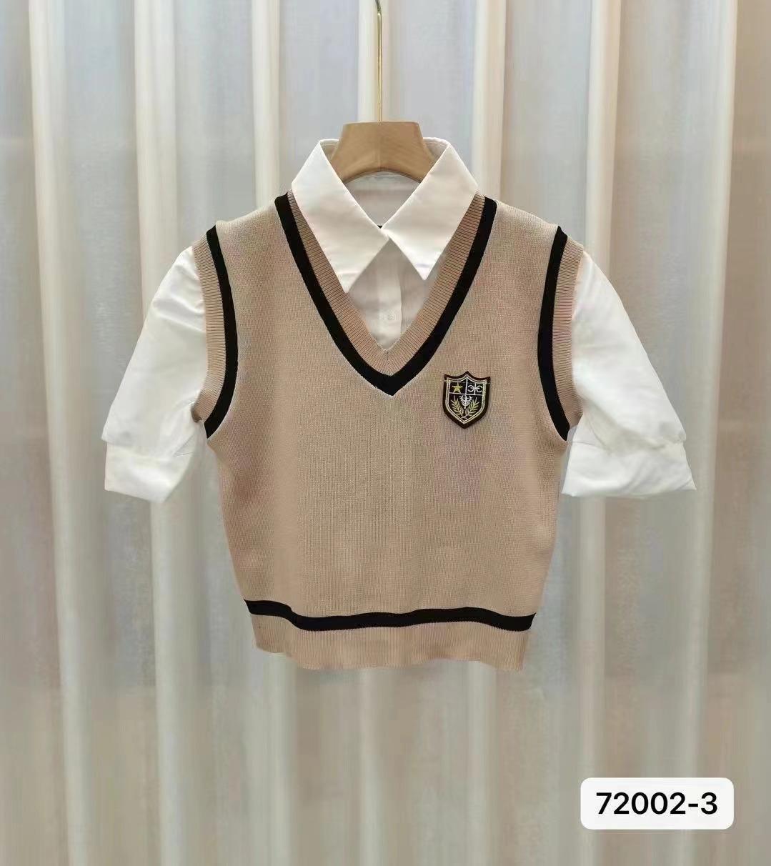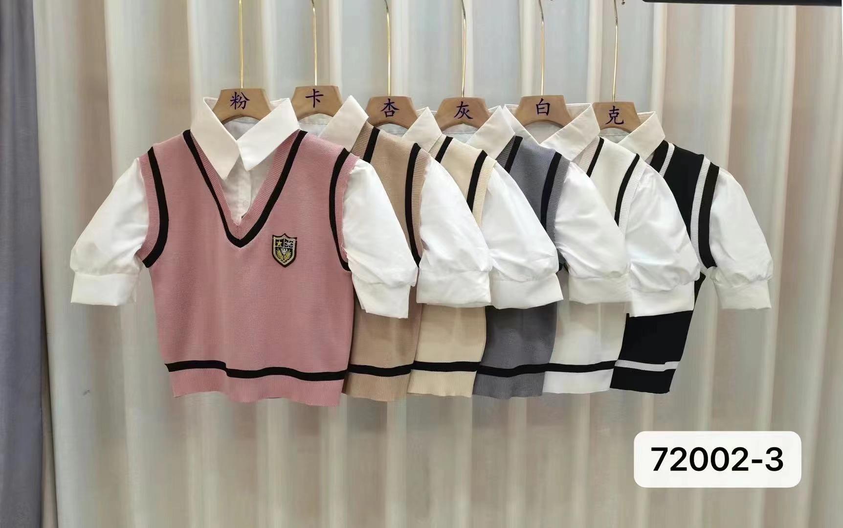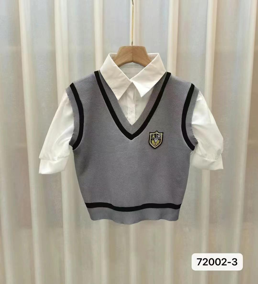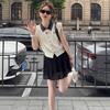 Estilo preppy estilo coreano cuello de camisa tejido color de contraste 2023 nuevo costuras diseño de manga corta de dos piezas falsas top para mujer