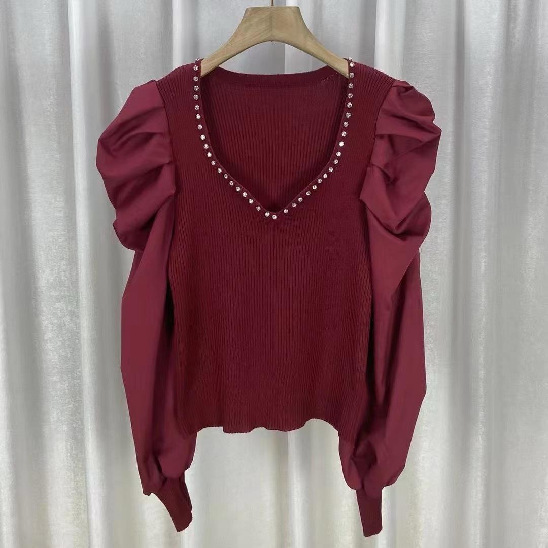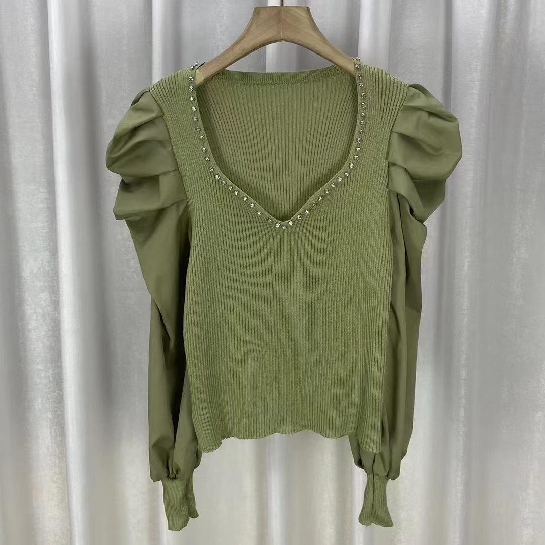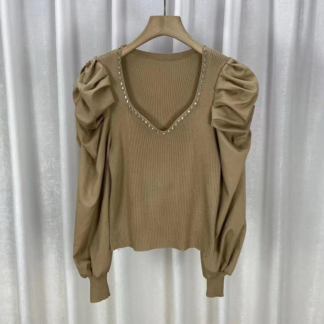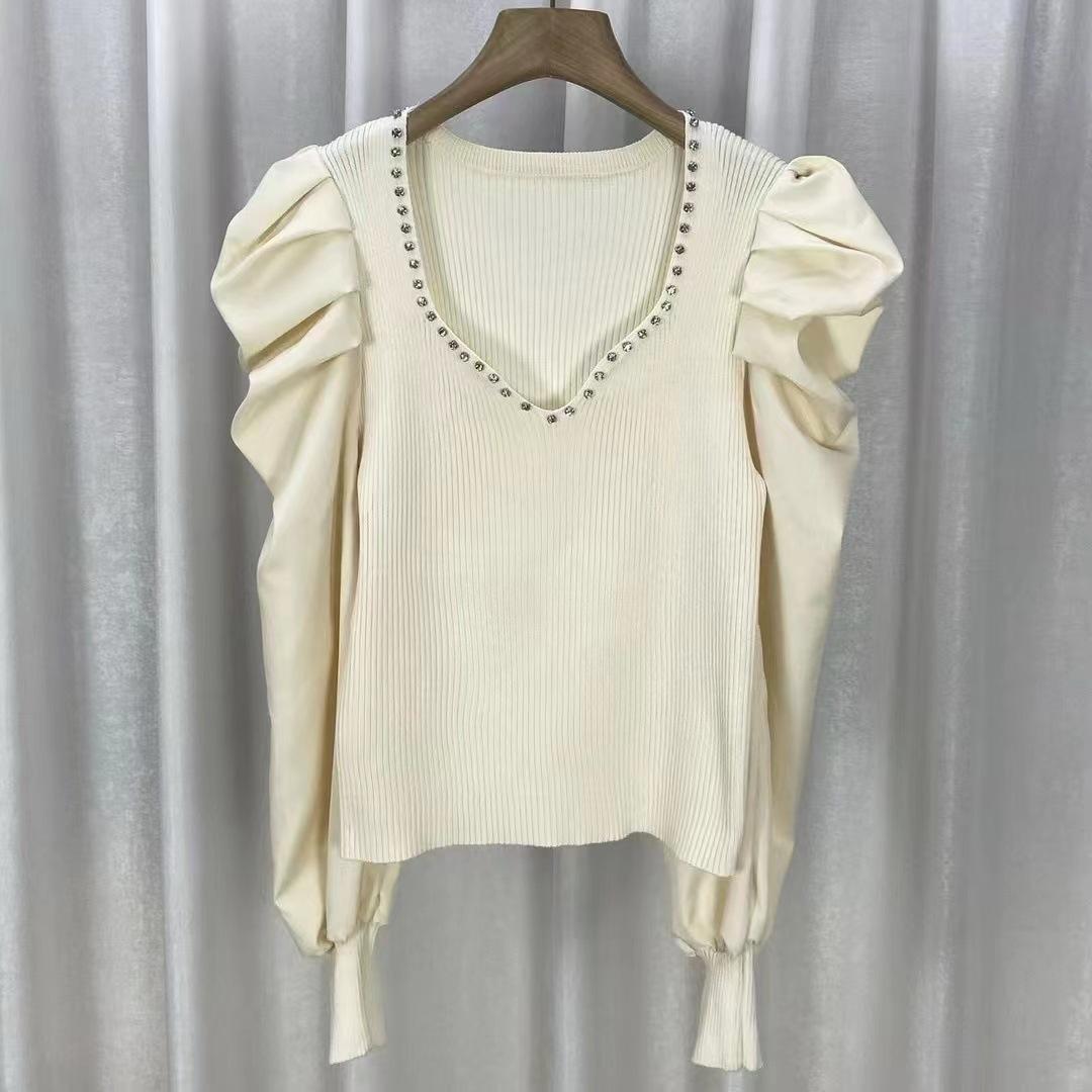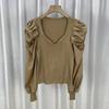 Suéter elegante de manga larga con cuello en V y estilo francés para mujer, top de punto con mangas abullonadas y corte entallado de otoño 2023