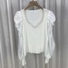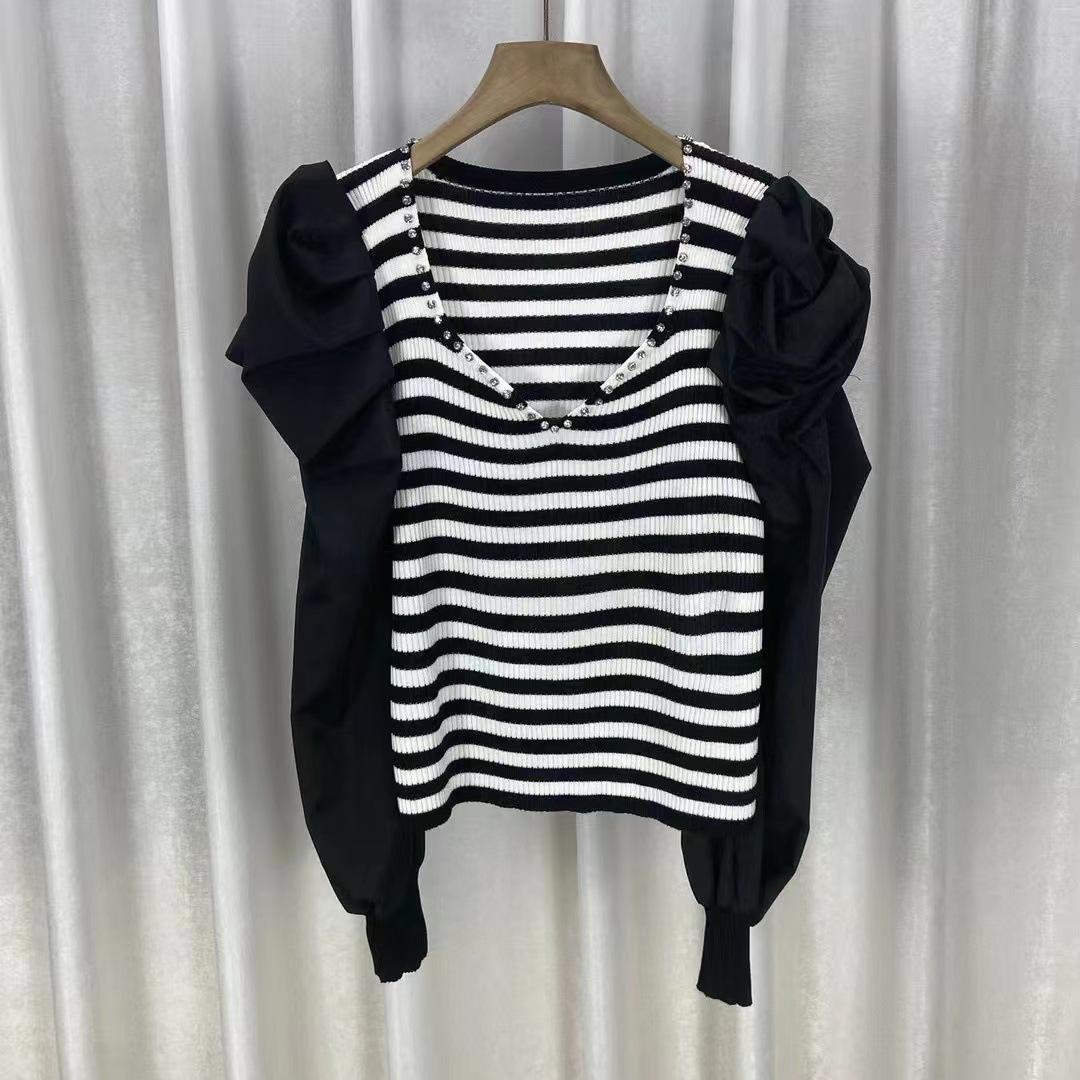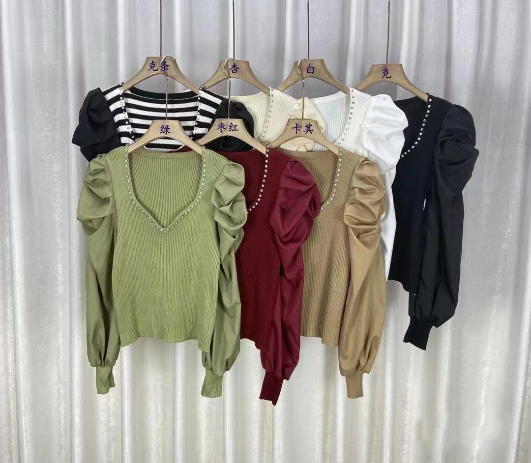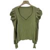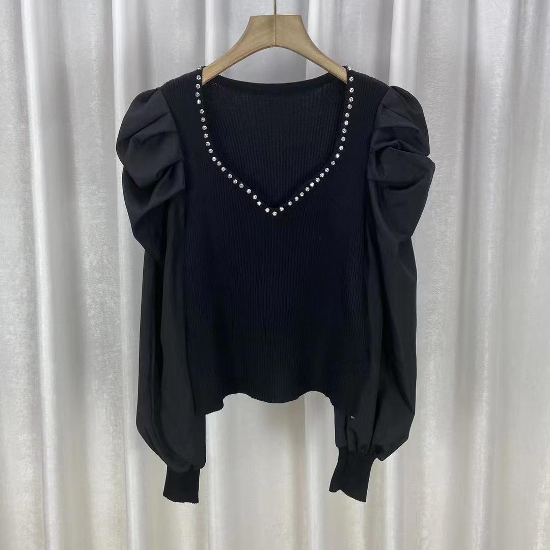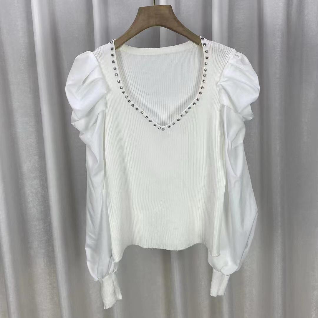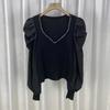 Suéter elegante de manga larga con cuello en V y estilo francés para mujer, top de punto con mangas abullonadas y corte entallado de otoño 2023