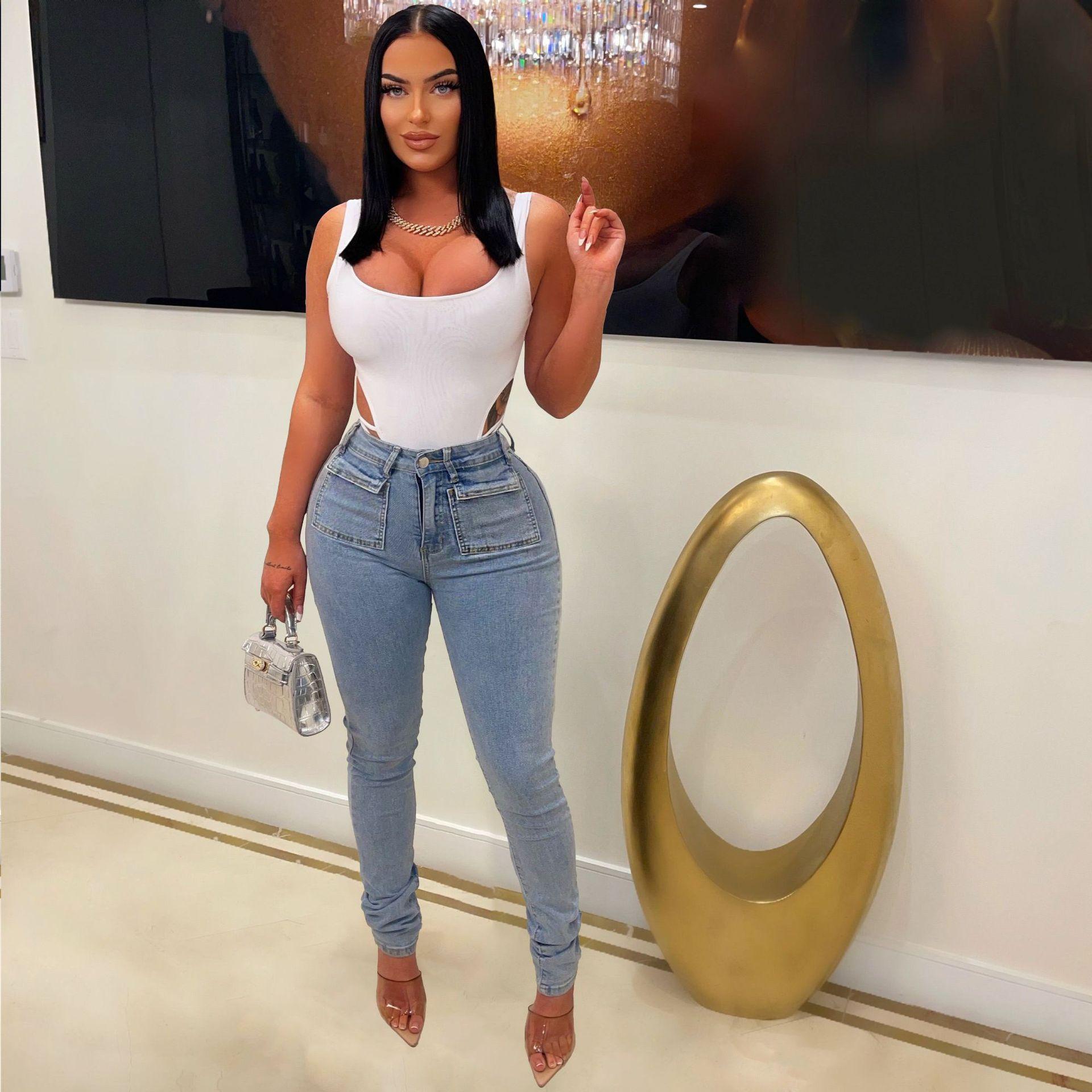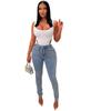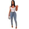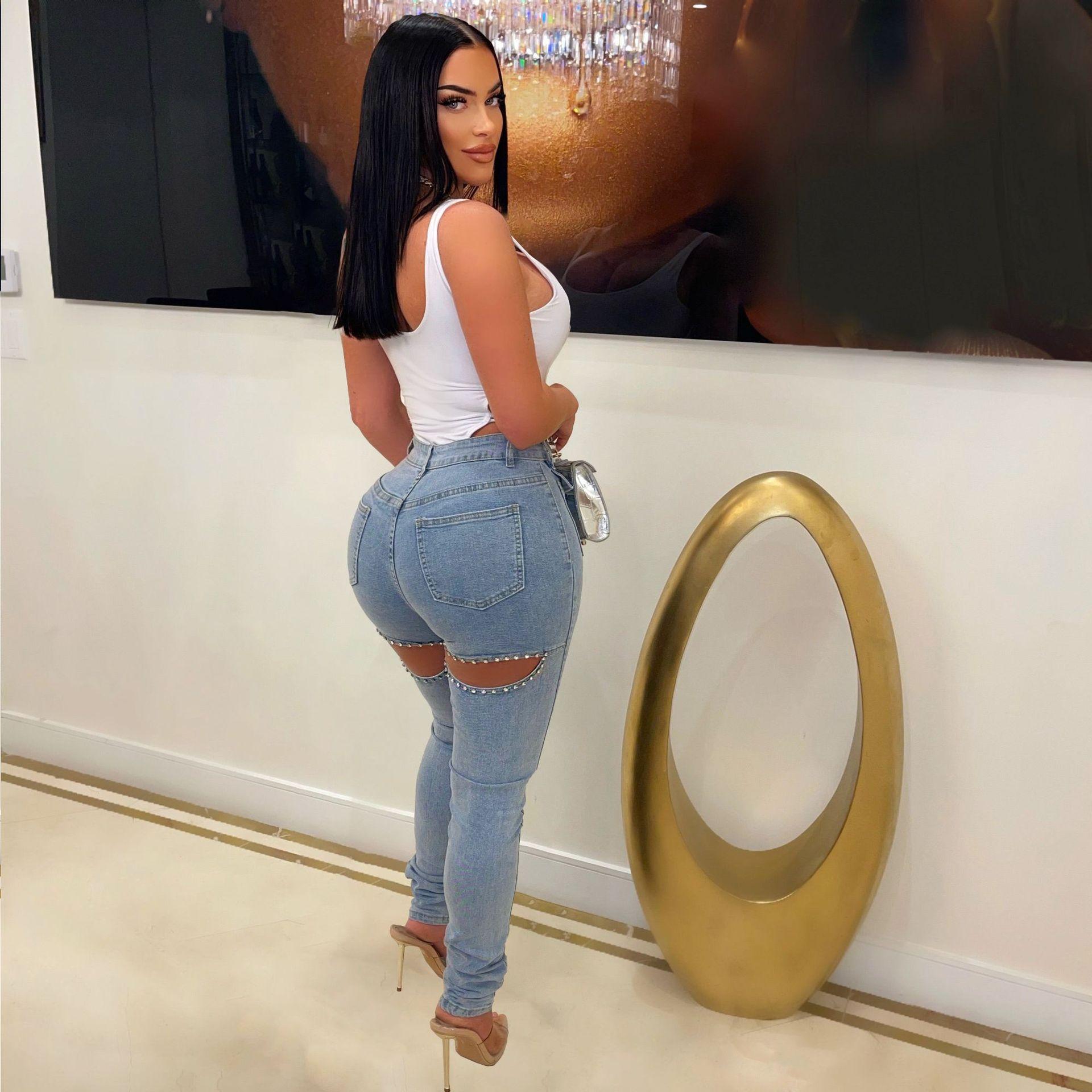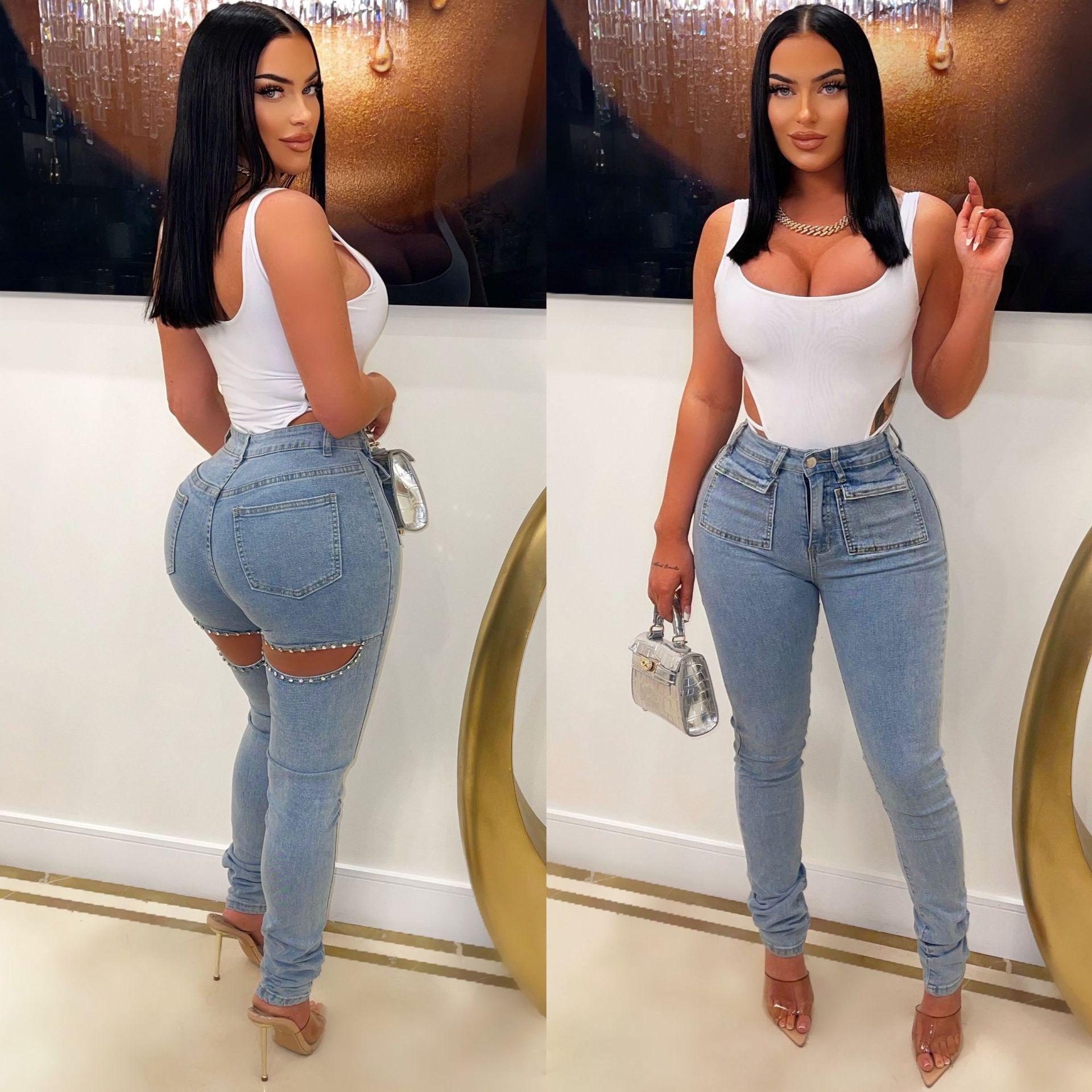 Vaqueros ajustados de alta calidad, elásticos y transpirables, de Amazon, para mujer, de Europa y América, con agujeros para el tiempo libre, lavados con agua y perlas.