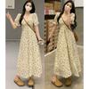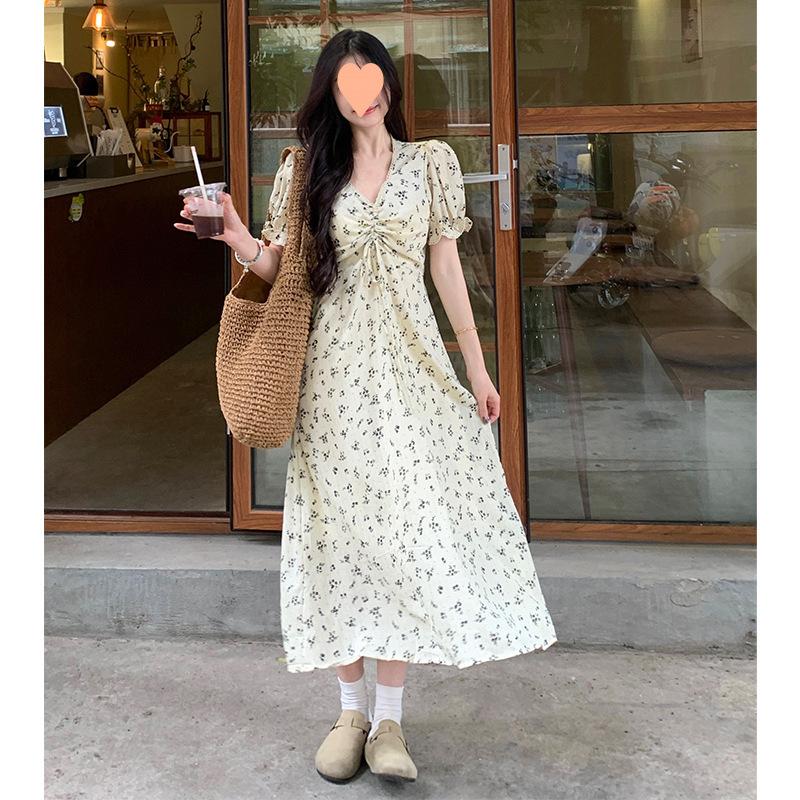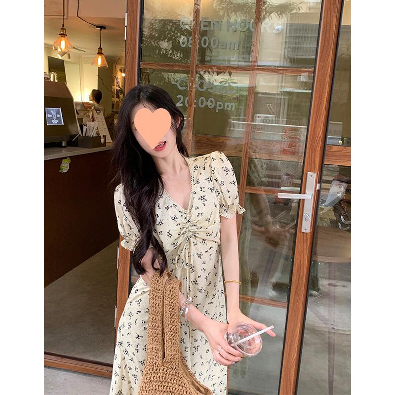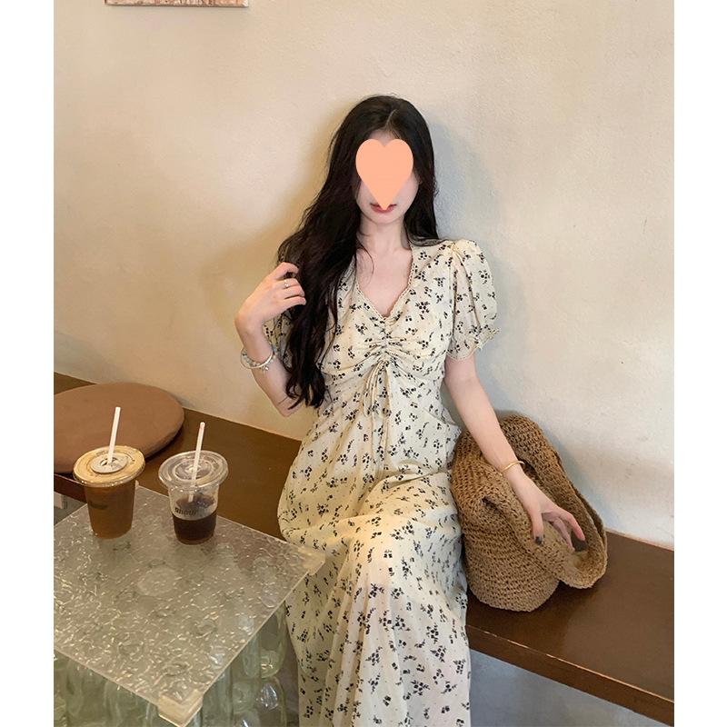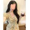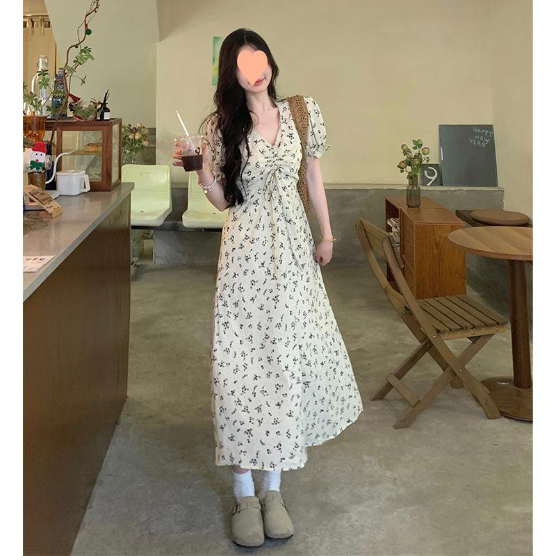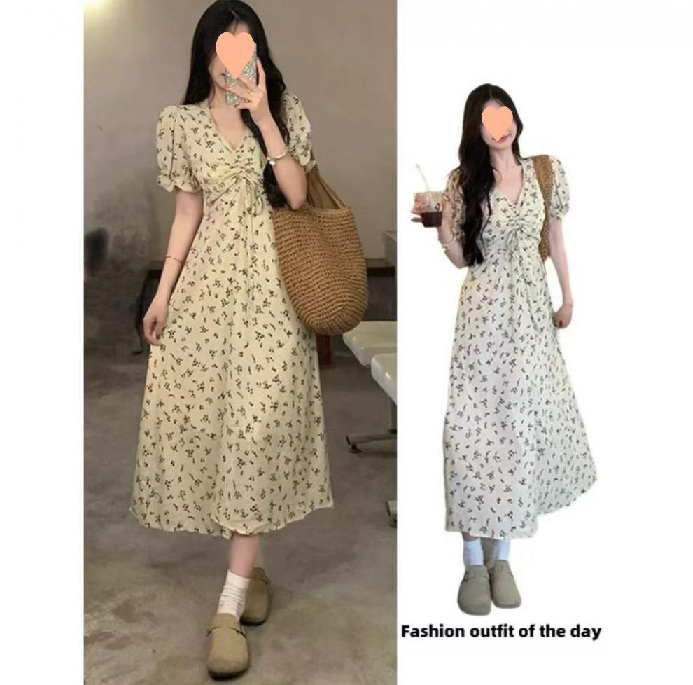 Vestido Floral Francés de Cuello en V y Manga Corta para Mujer 2025 Estilo Verano Aspecto Adelgazante de Cintura y Cubre-Carnes Falda Larga Elegante