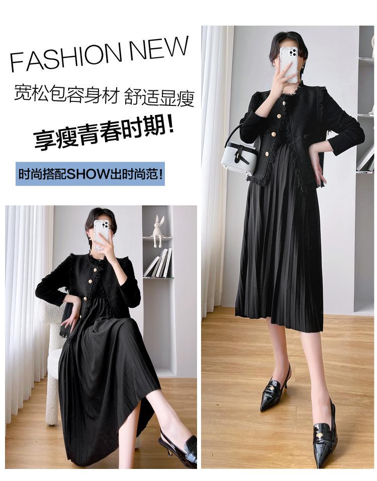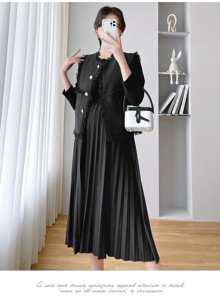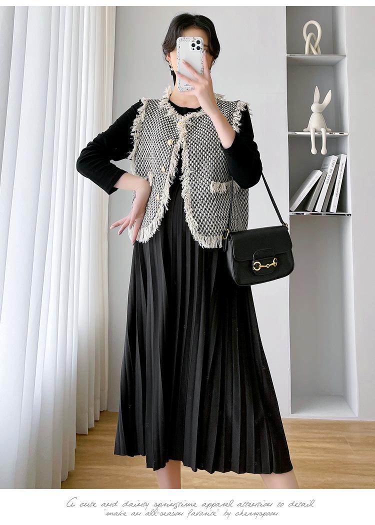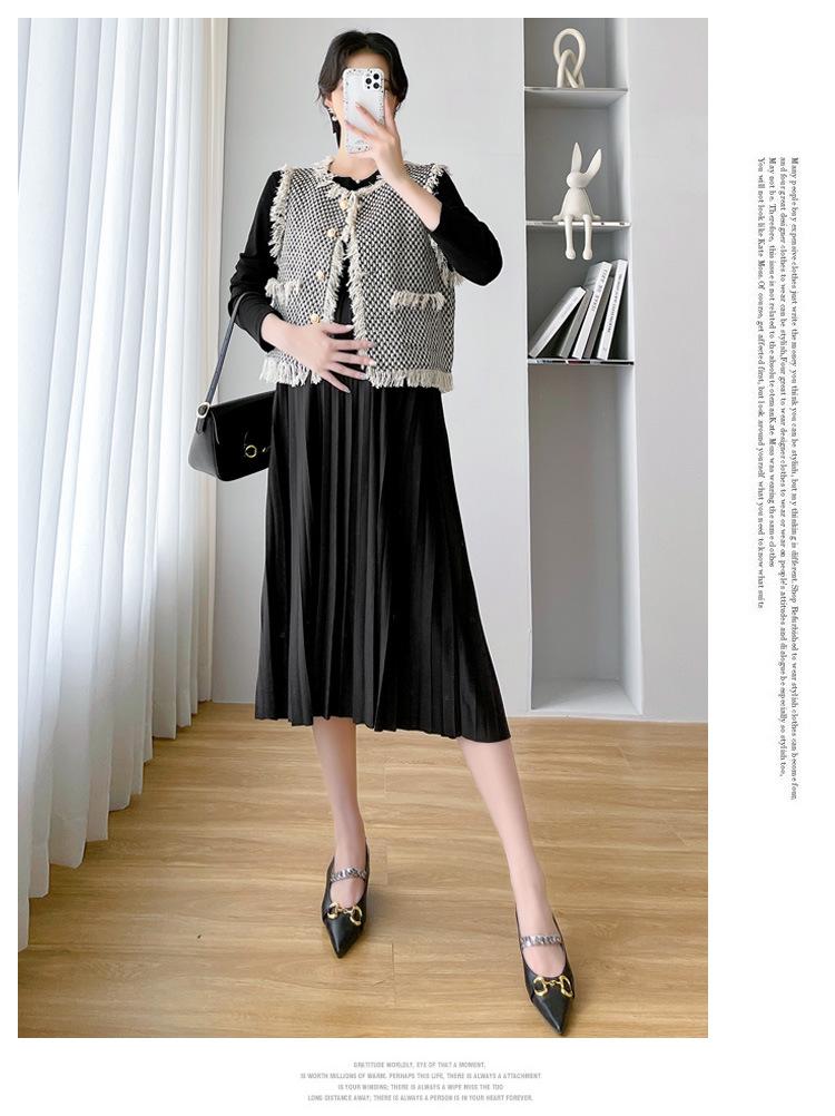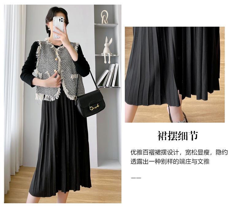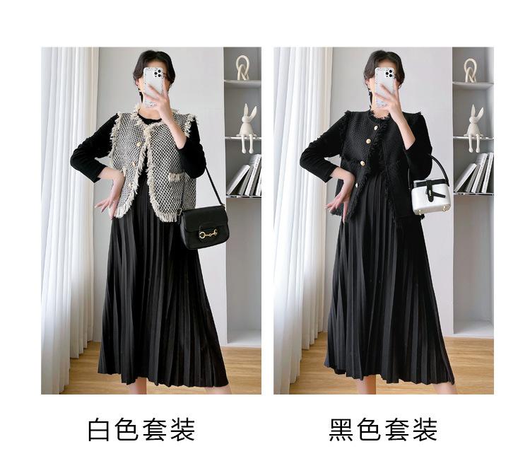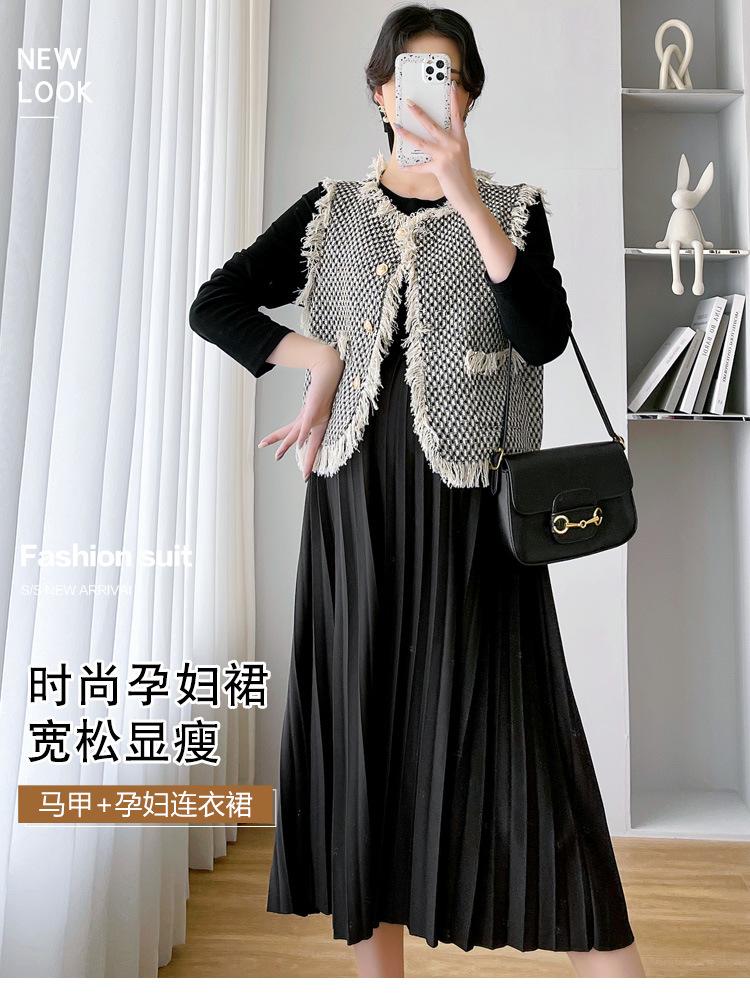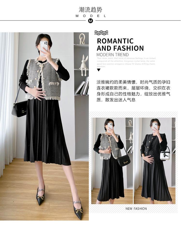 Vestido para Mujer Embarazada Primavera y Otoño Nuevo Estilo Estilo Fragante Traje para Mujer Embarazada Talla Grande Falda Base Plisada Vestido de Dos Piezas