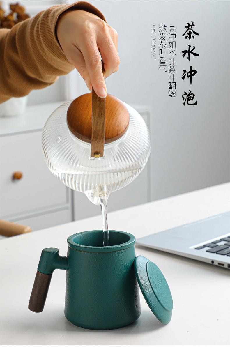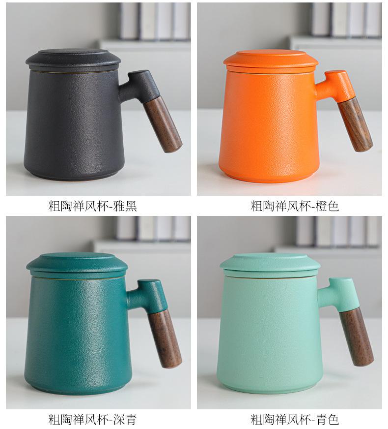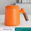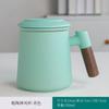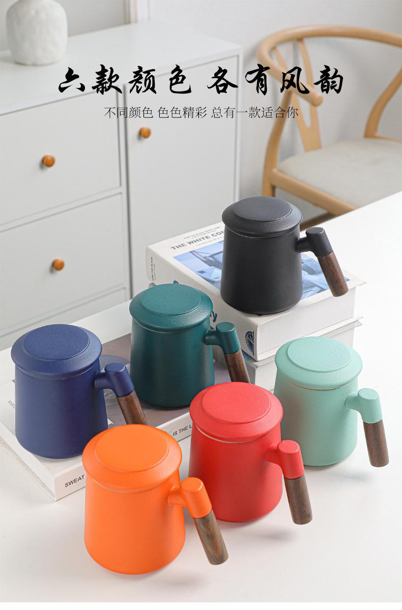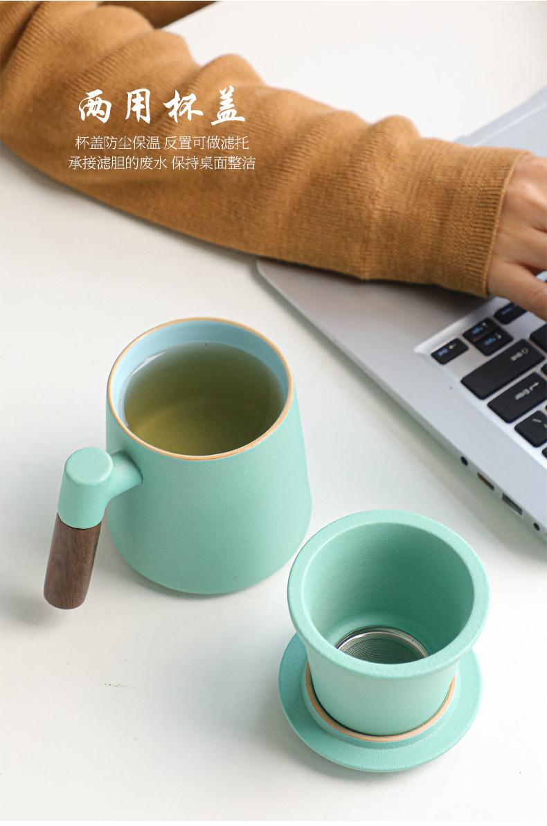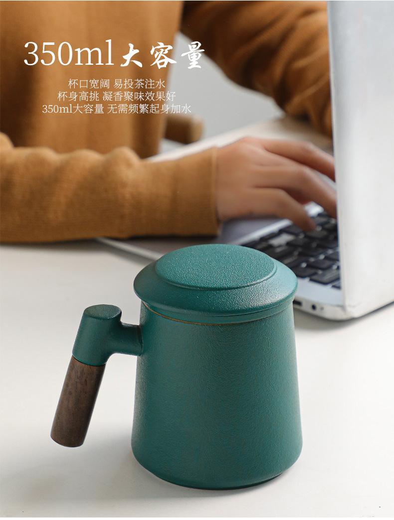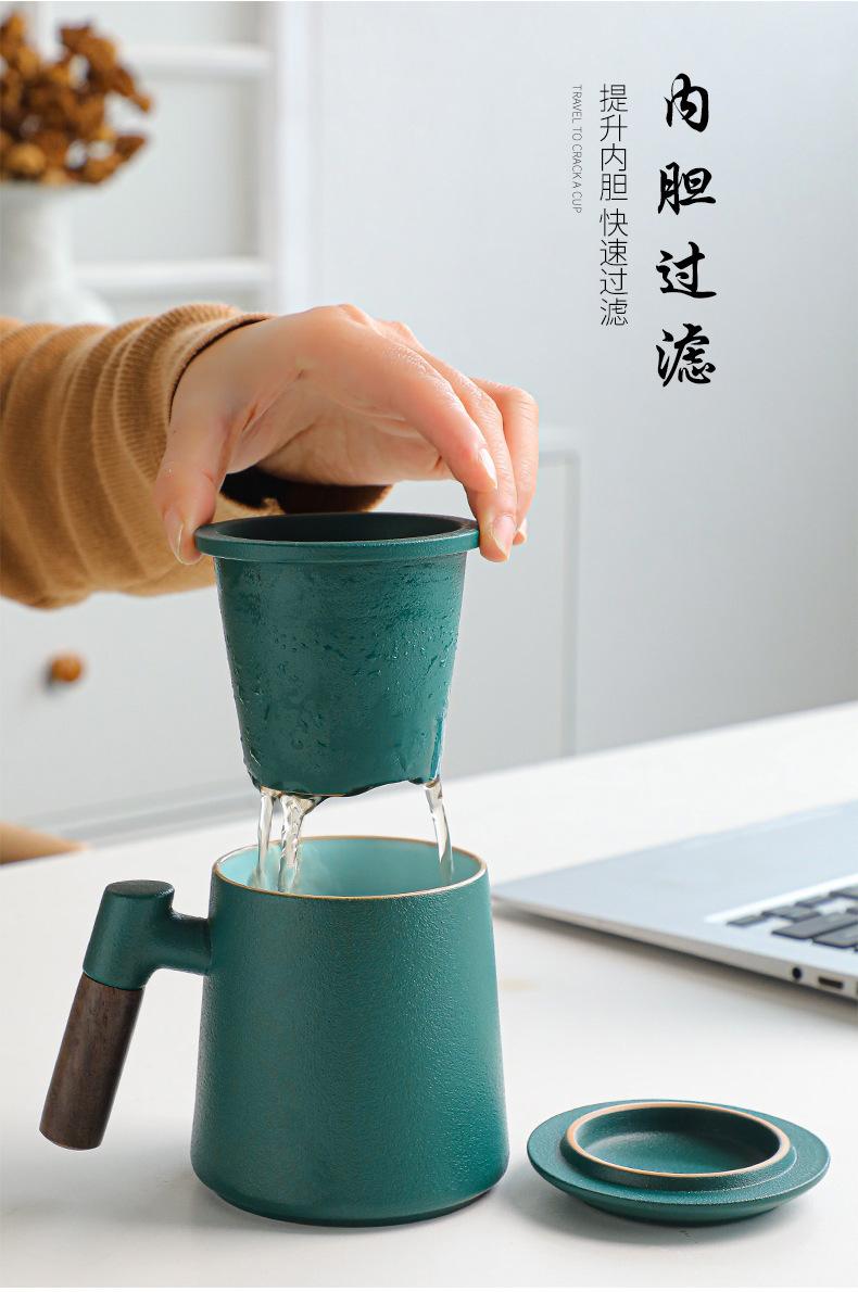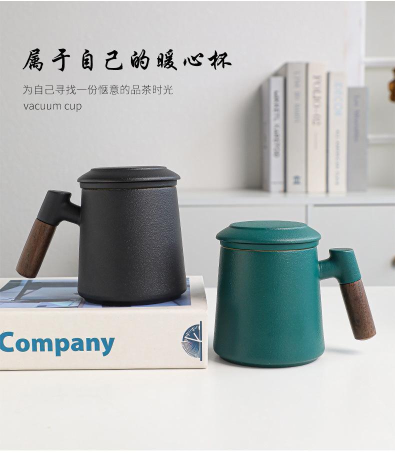 Taza de cerámica al por mayor con tapa, taza separadora de agua para té, taza de té con filtro, taza de oficina con mango de madera, taza creativa de alta calidad
