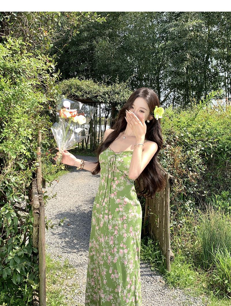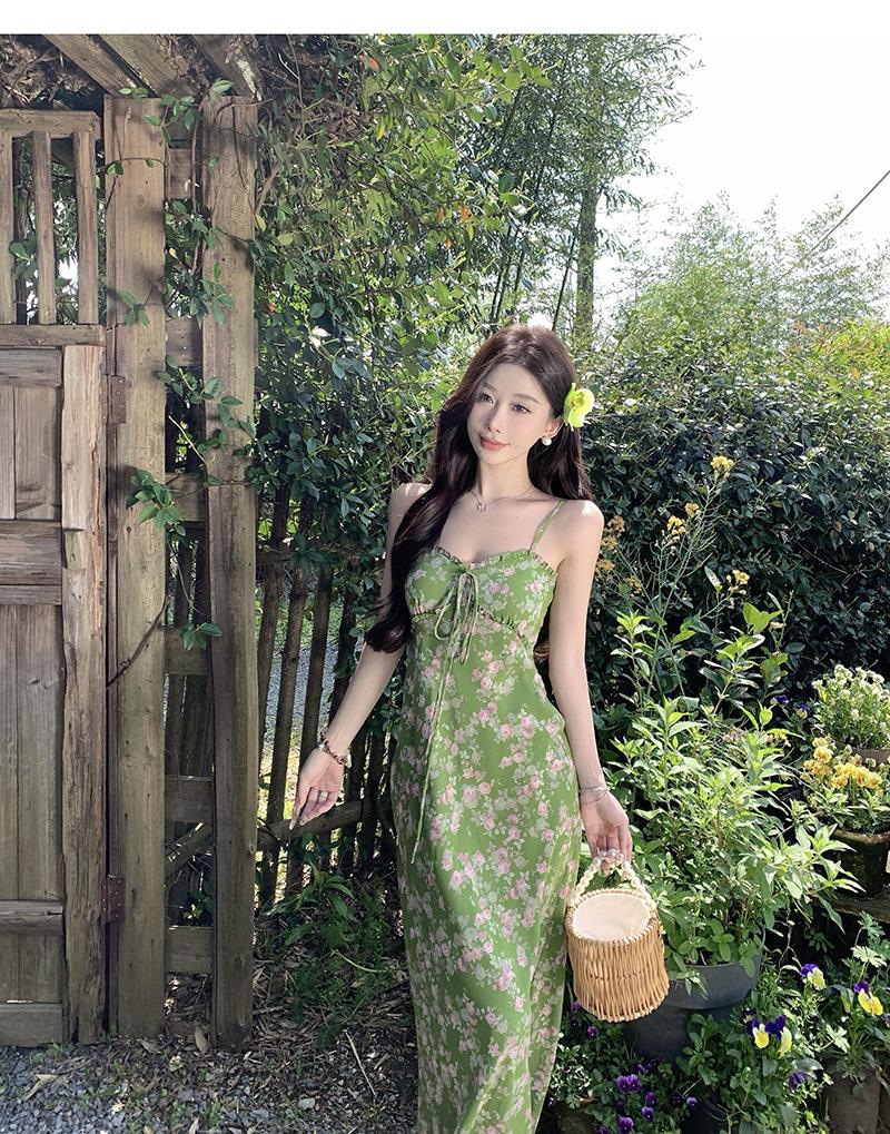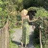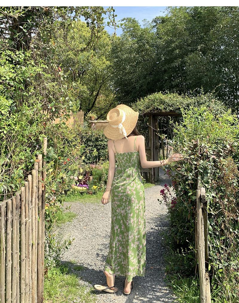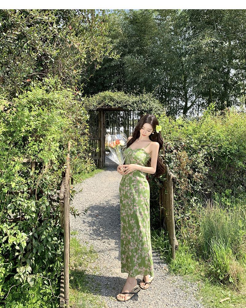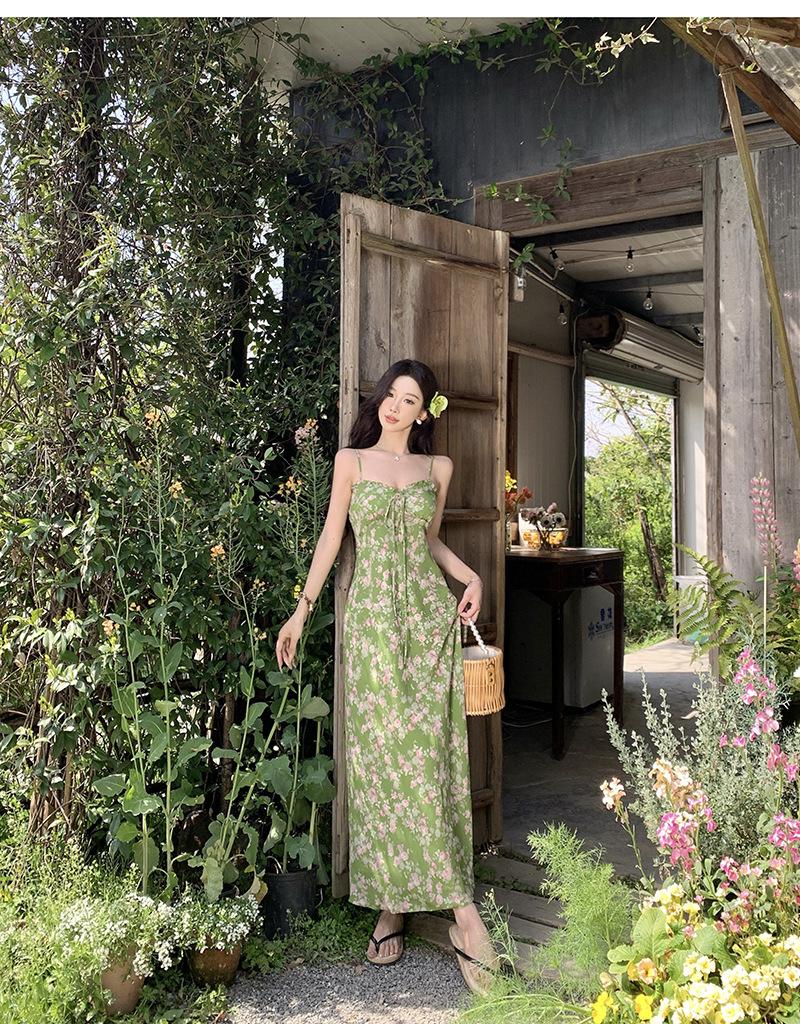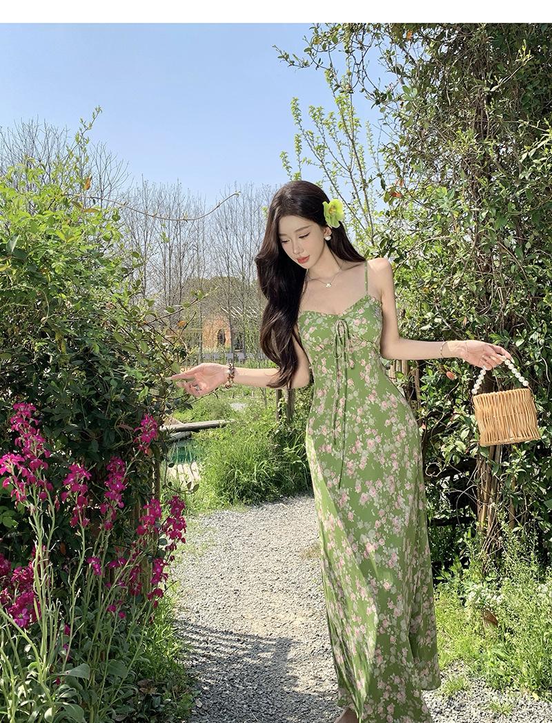 Estilo Vacacional Pastoral Elegante Cintura Ceñida Adelgazante Vestido Largo con Tirantes Florales Verdes Hermoso Vestido con Tirantes