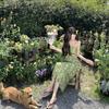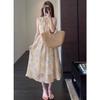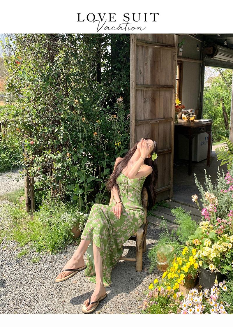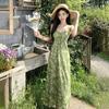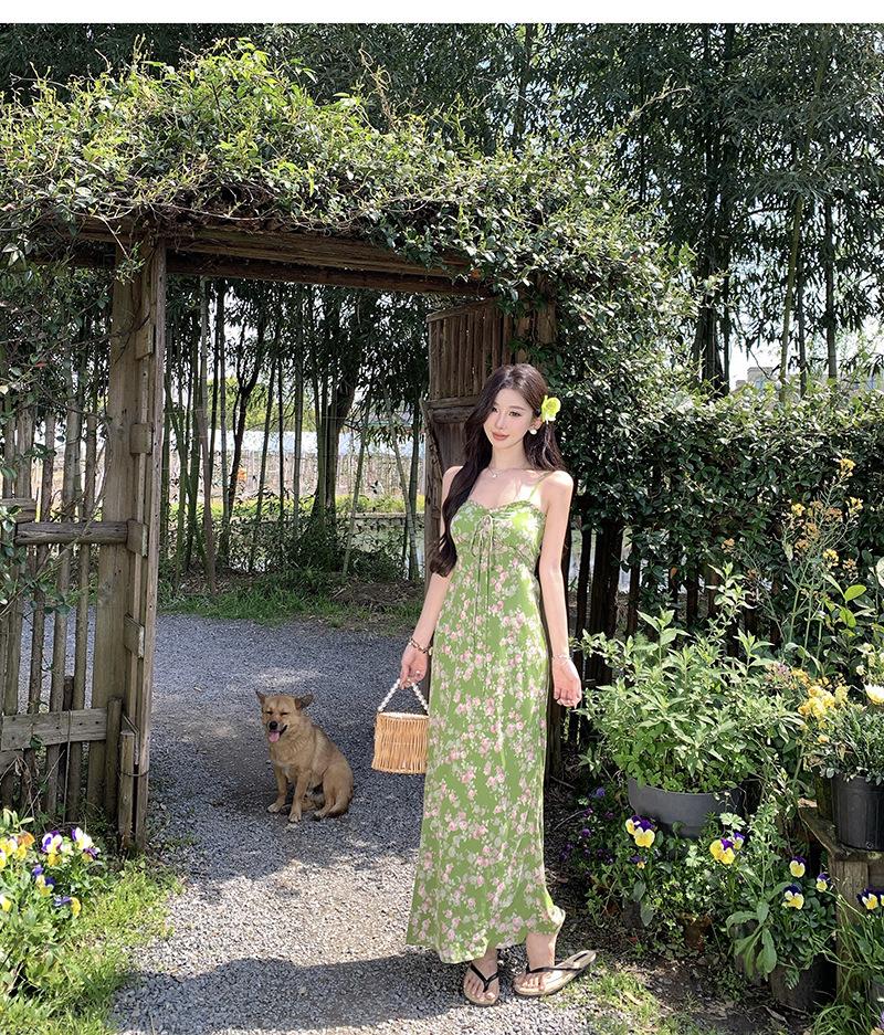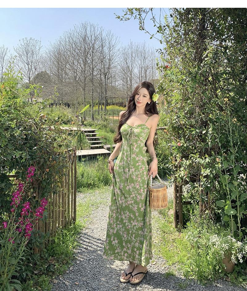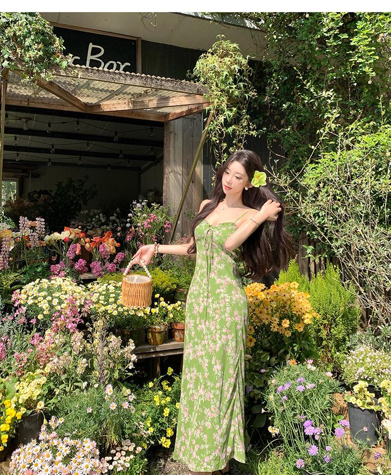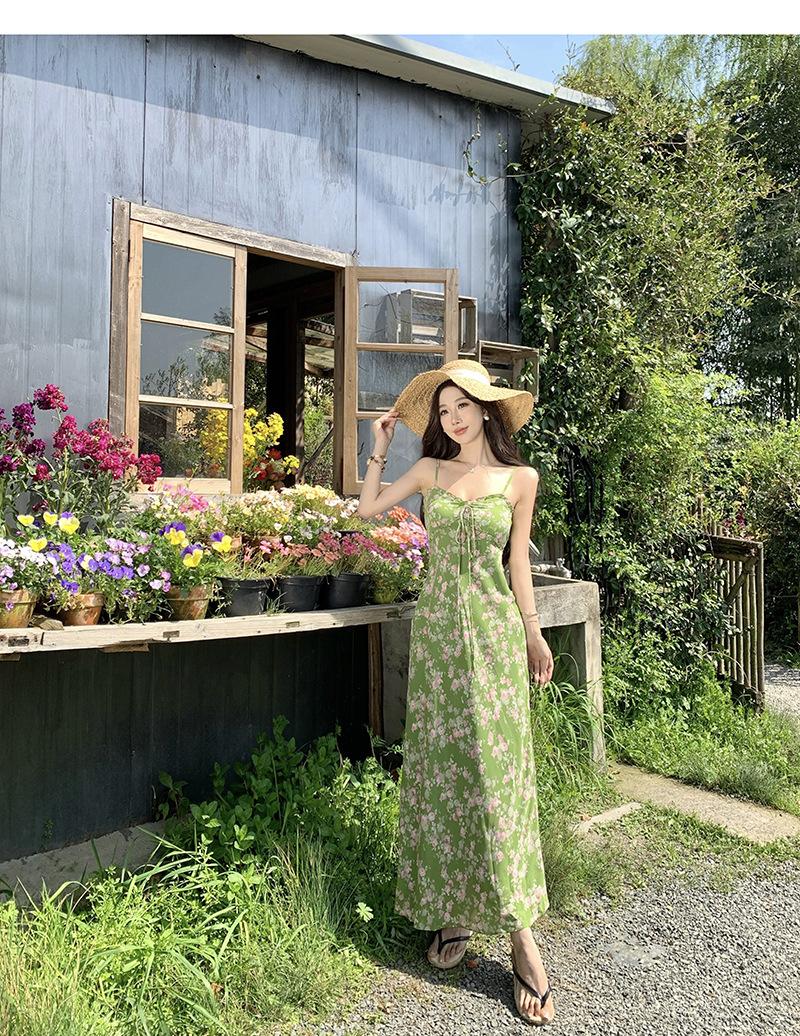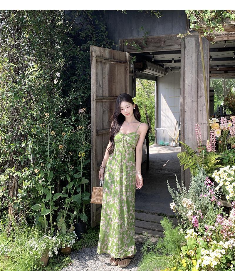 Estilo Vacacional Pastoral Elegante Cintura Ceñida Adelgazante Vestido Largo con Tirantes Florales Verdes Hermoso Vestido con Tirantes