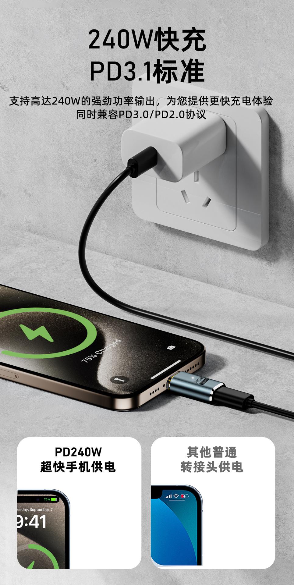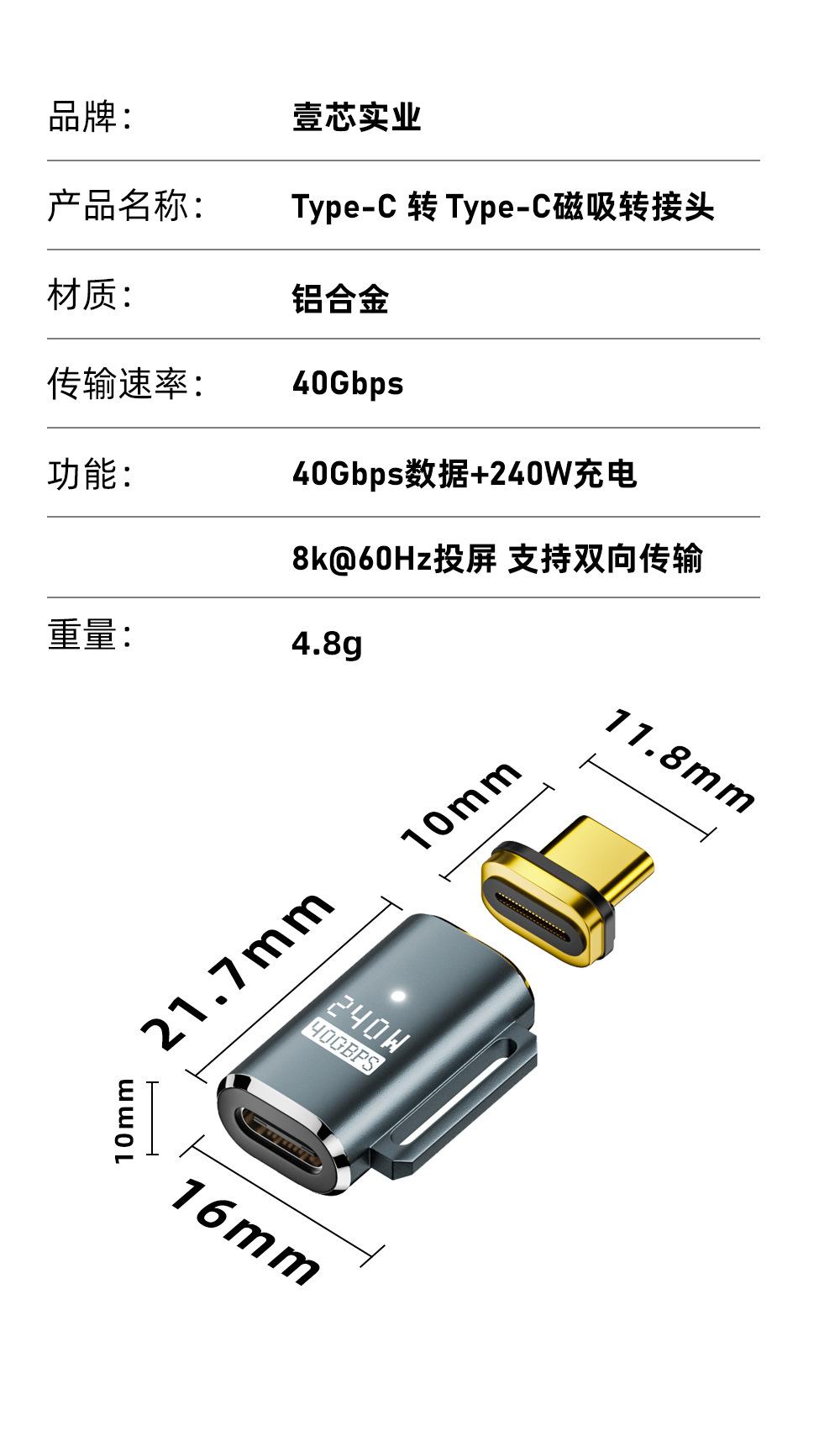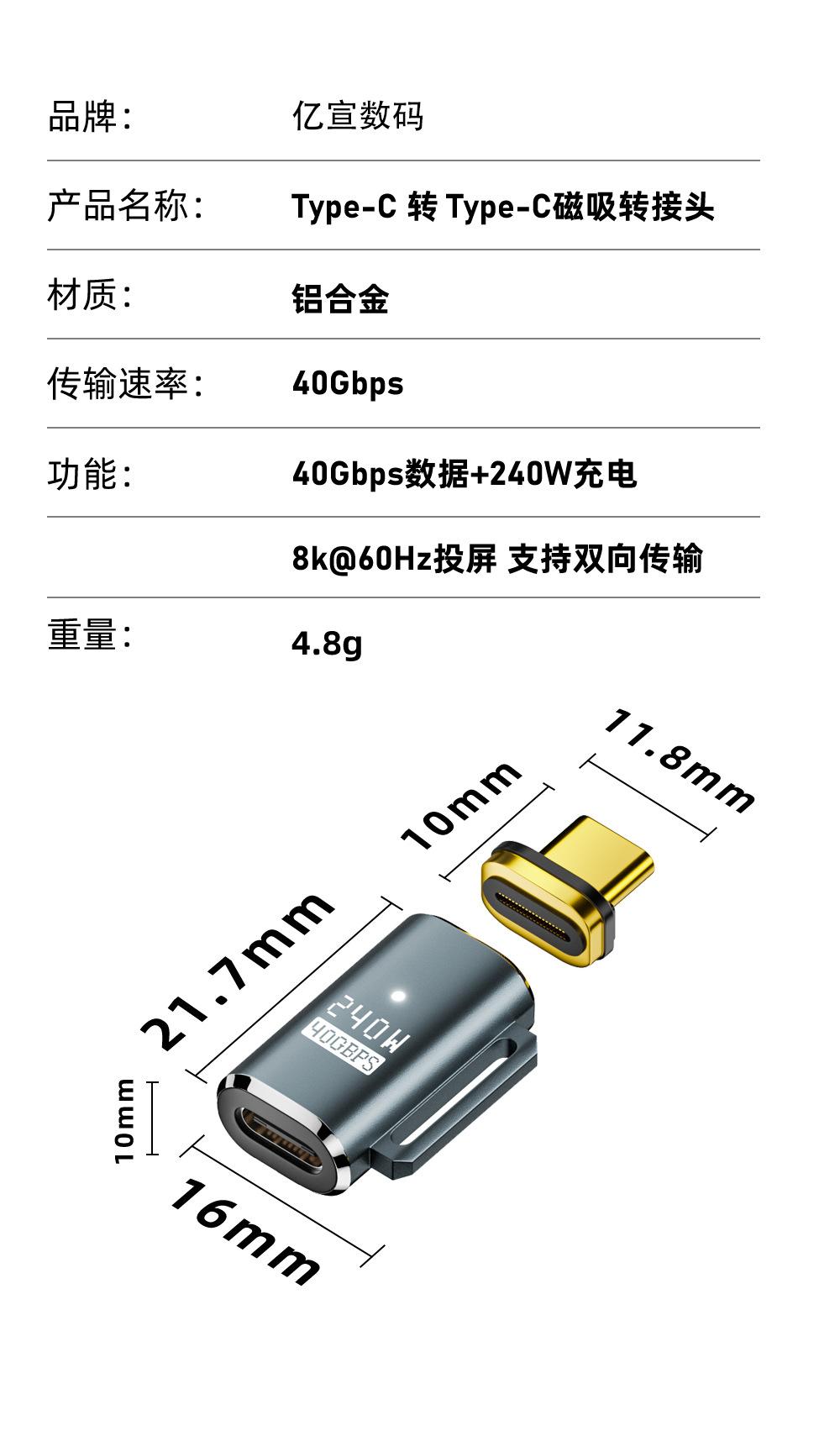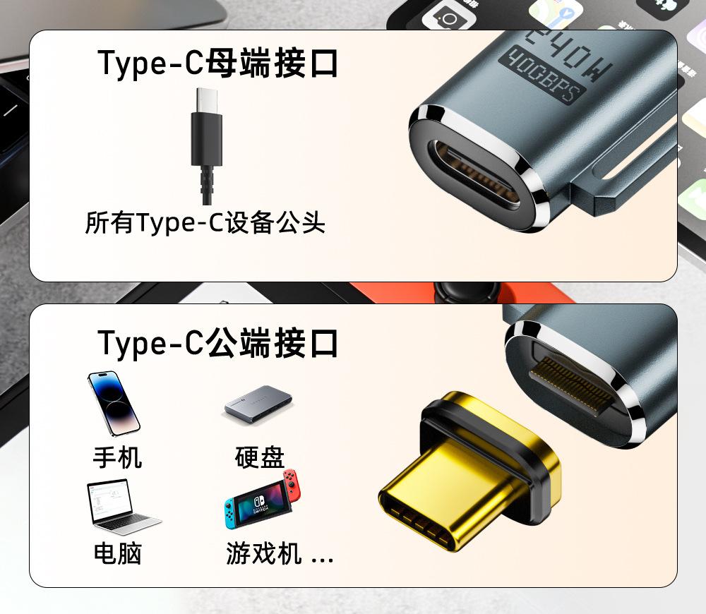 Adaptador magnético TYPE-C hembra a TYPE-C macho 240W aleación de aluminio 40GB adecuado para computadoras MacBook