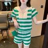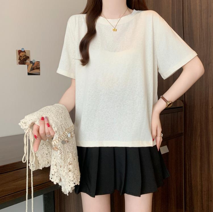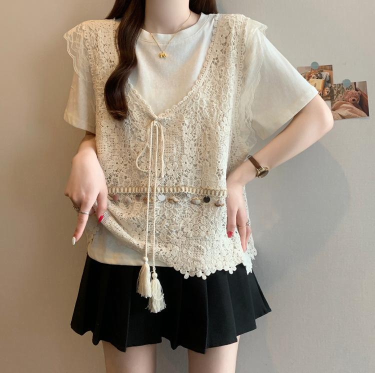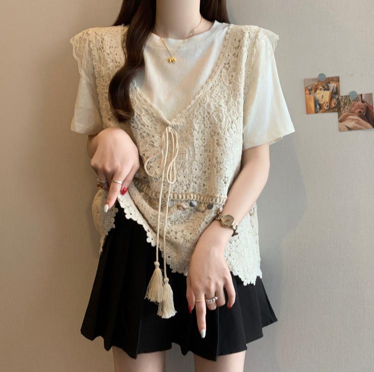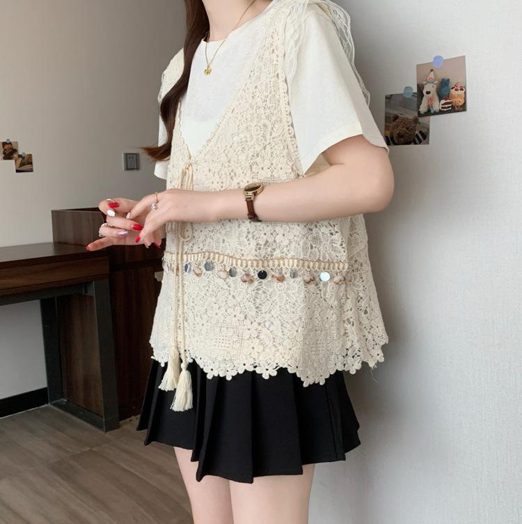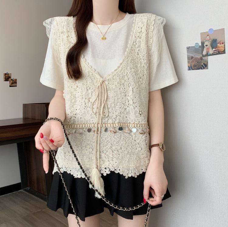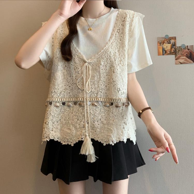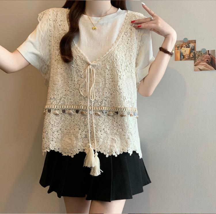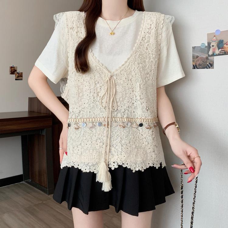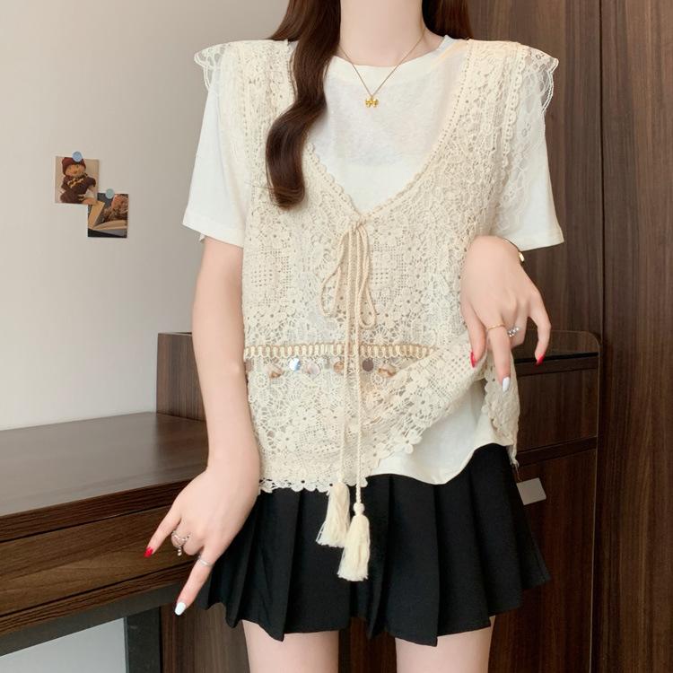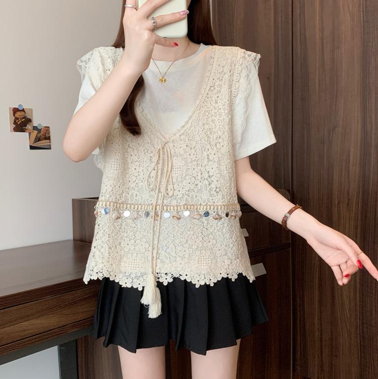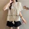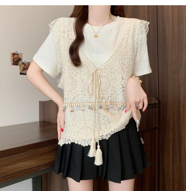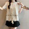 Camiseta de Manga Corta Estilo Bohemio para Mujer Verano 2025 Nuevo Top Camisola de Punto Calado Traje de Dos Piezas