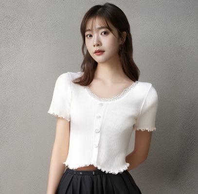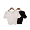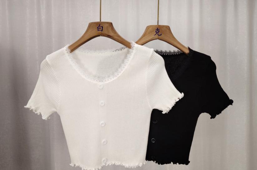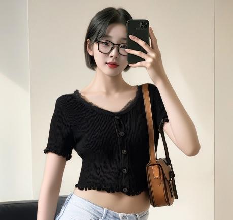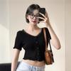 Camiseta básica de punto de nicho estilo coreano con cuello cuadrado morado para mujer, de manga corta, encaje, cintura descubierta, corte entallado, dulce y picante.