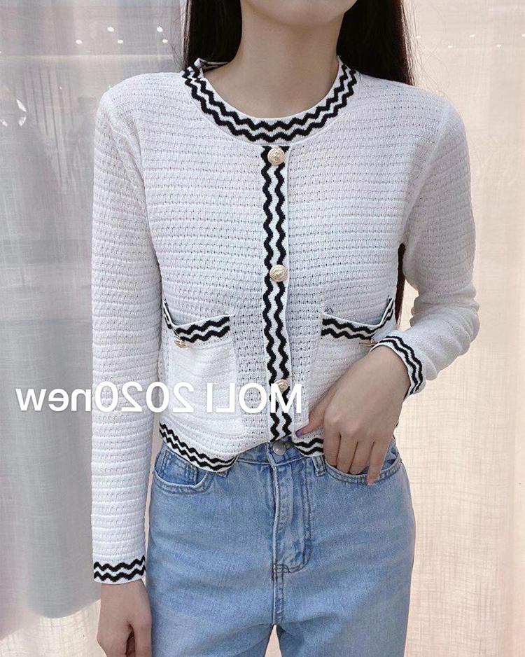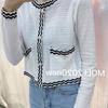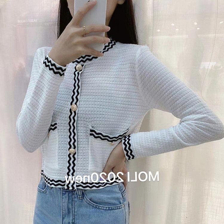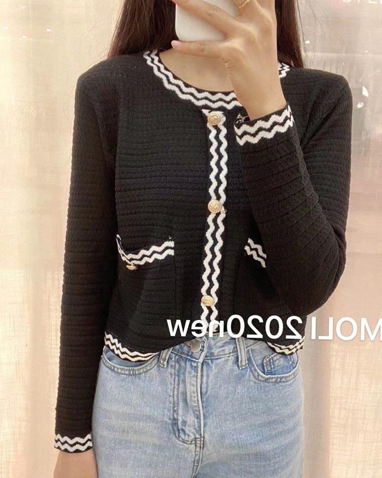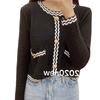 Chaqueta de punto de manga larga para mujer, estilo Chanel, estilo nuevo transfronterizo, cuello redondo fino, color en contraste, prenda exterior corta adelgazante.