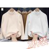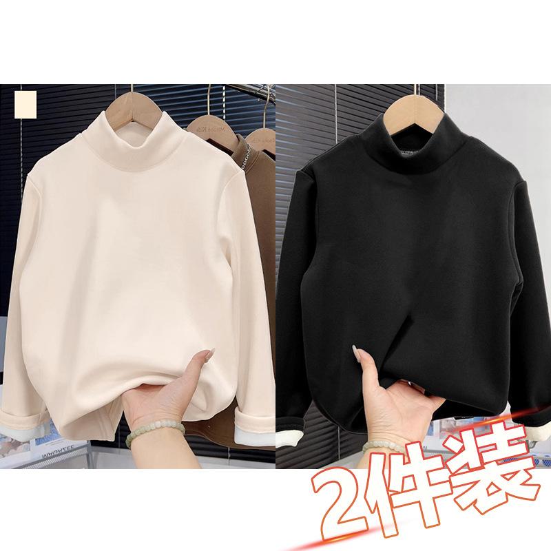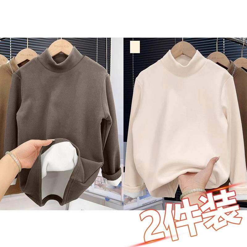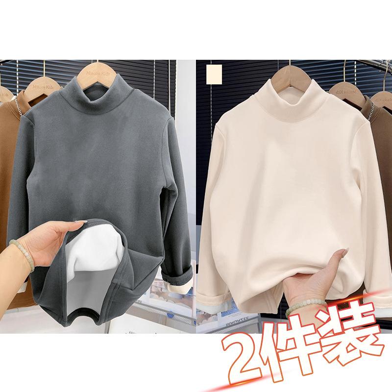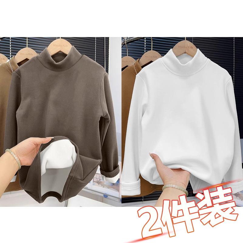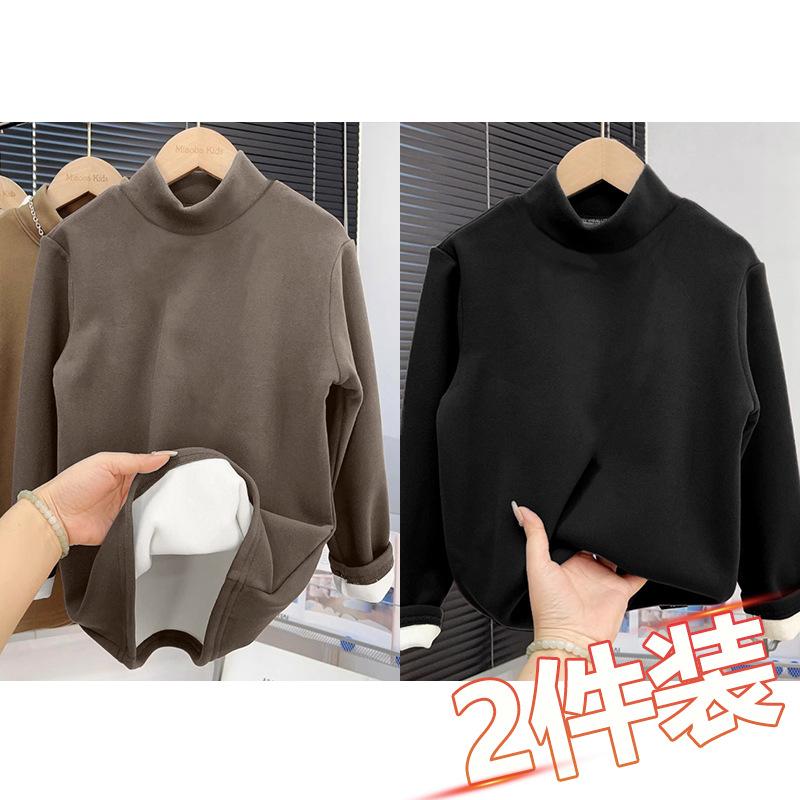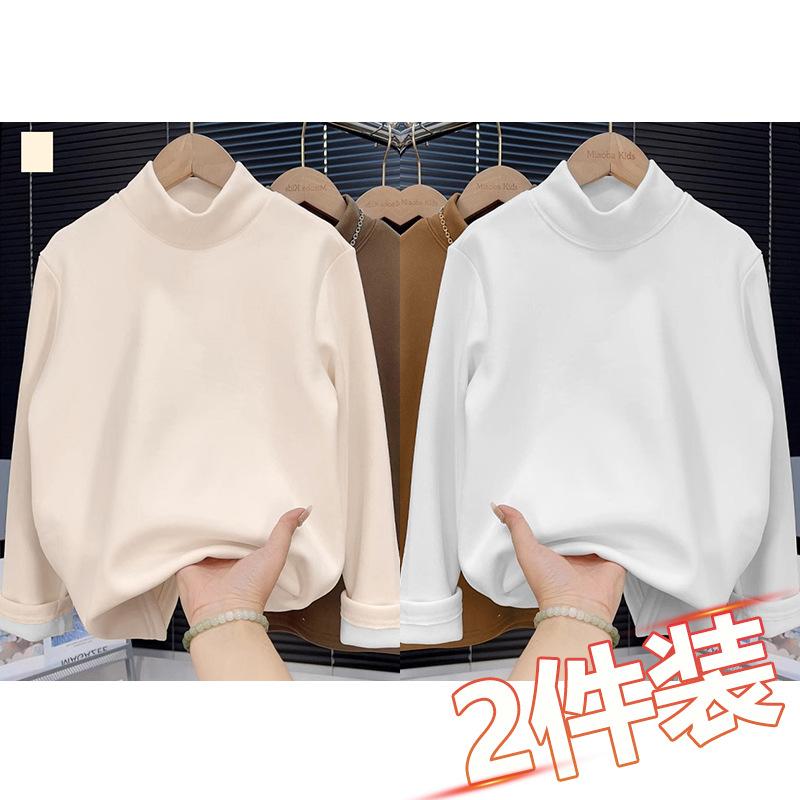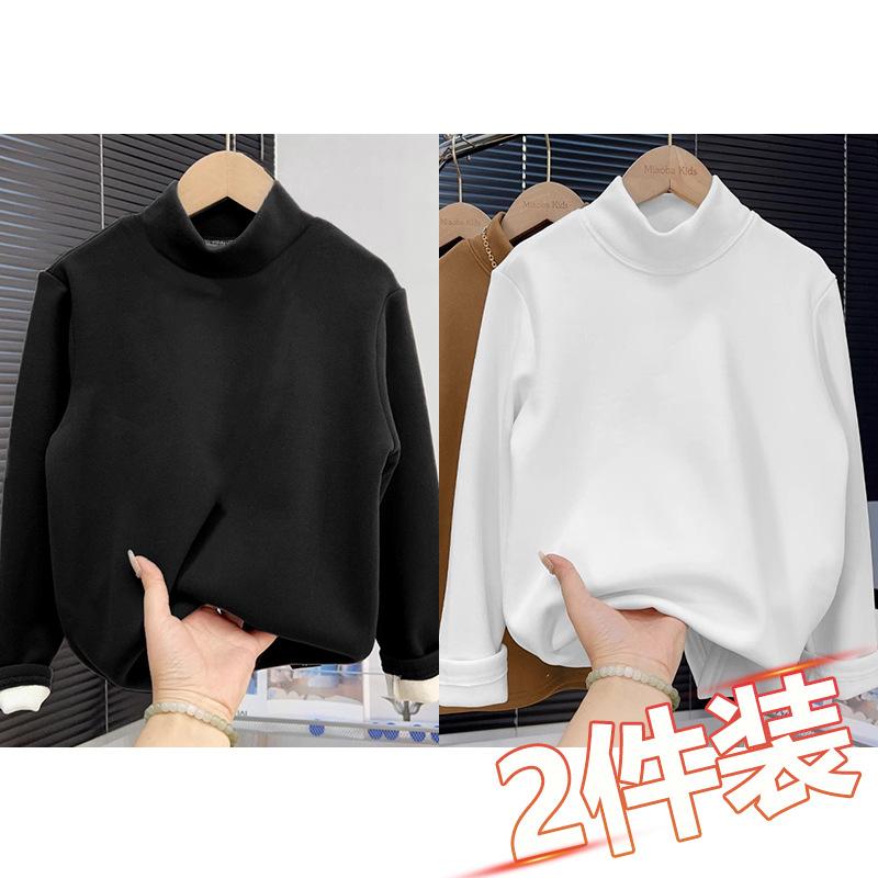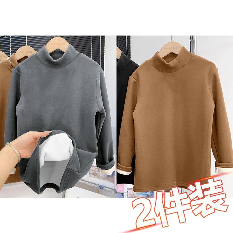 Camiseta base de terciopelo grueso de color sólido para otoño e invierno para hombre y niño, camiseta casual cálida de cuello alto con forro polar para mujer y niño, paquete de dos piezas