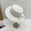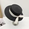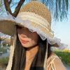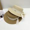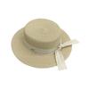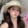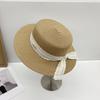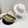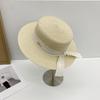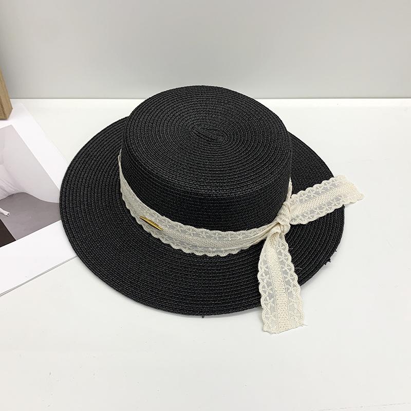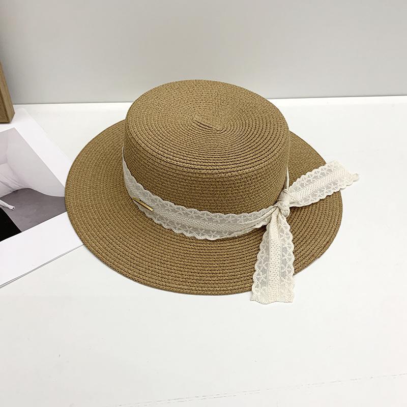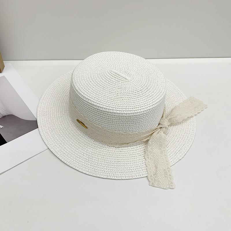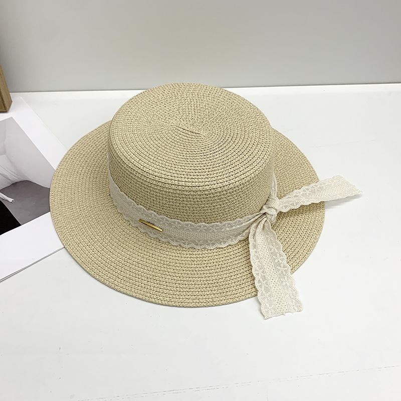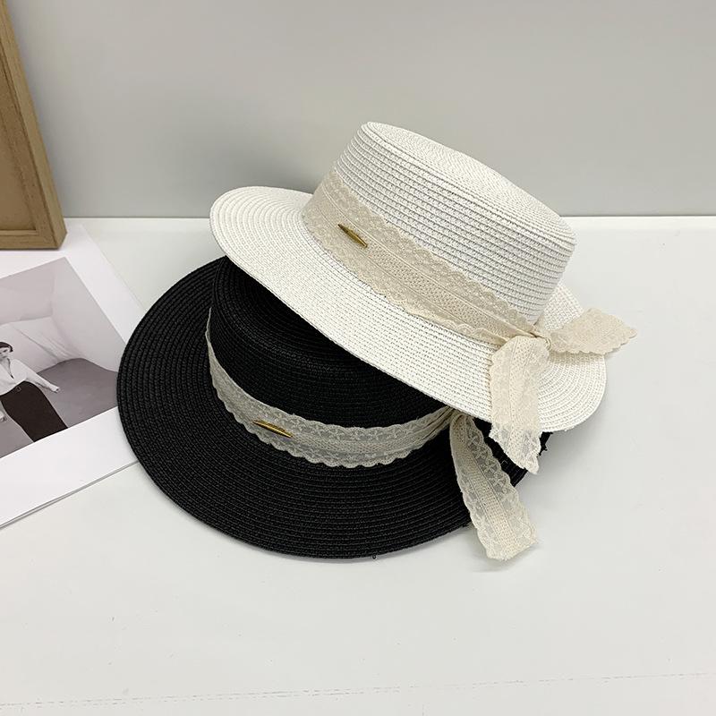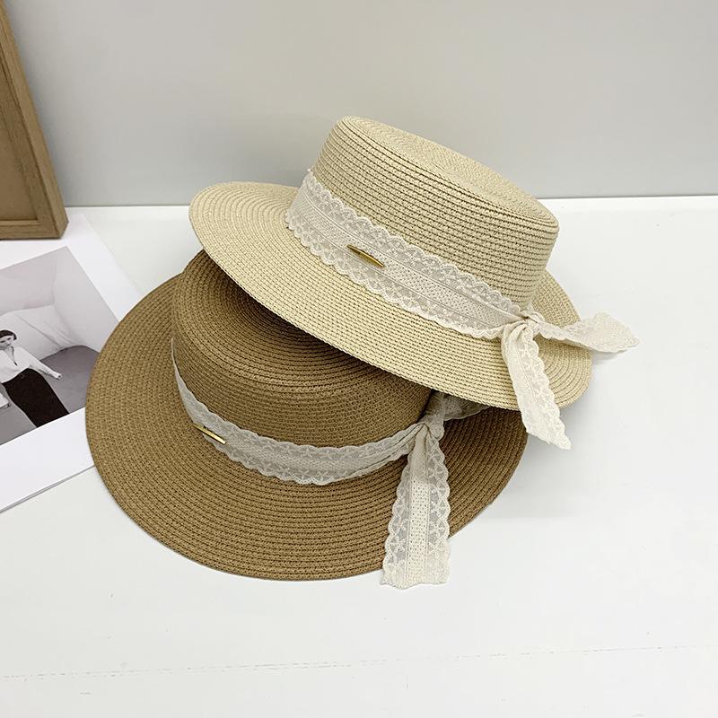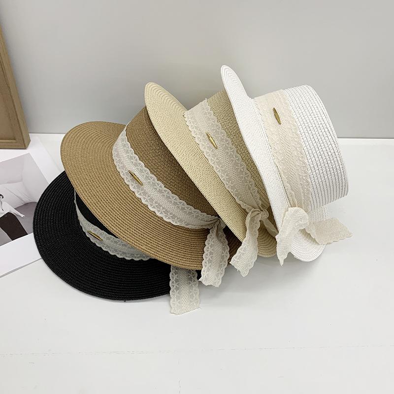 2025 Nuevo Sombrero de Paja de Playa con Cinta de Encaje y Lazo para Mujer Verano Sombrero Parasol Vacaciones Sombrero Plano de Paja