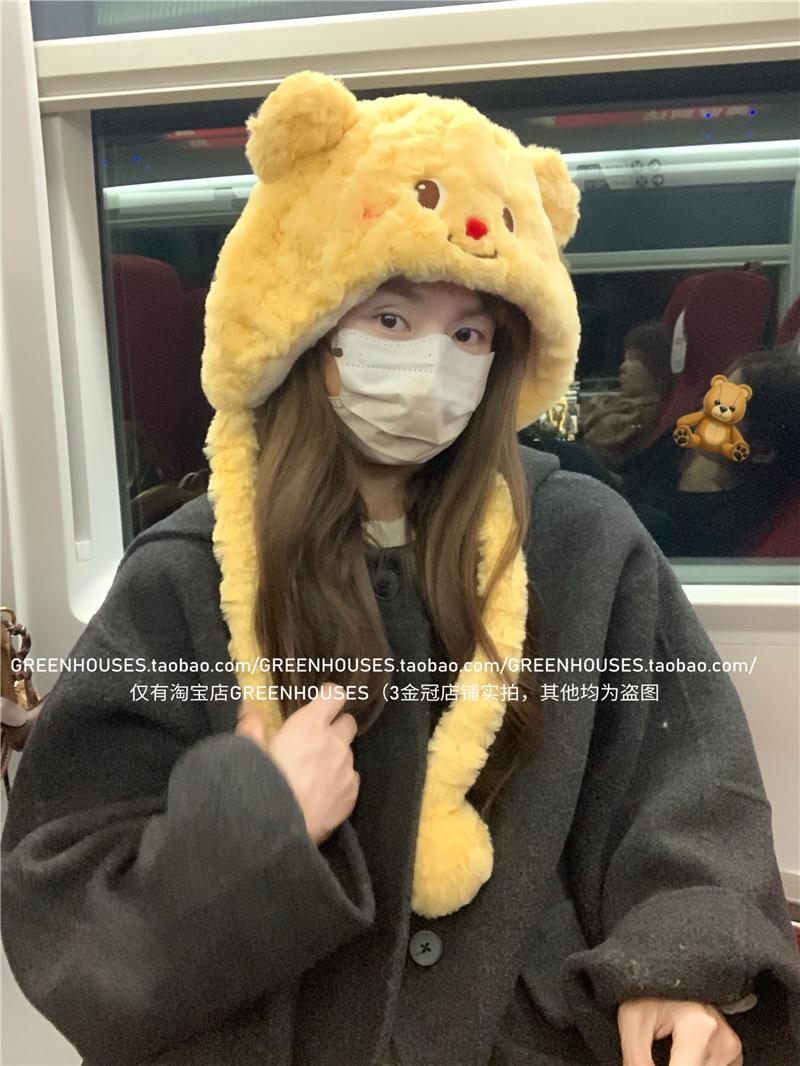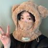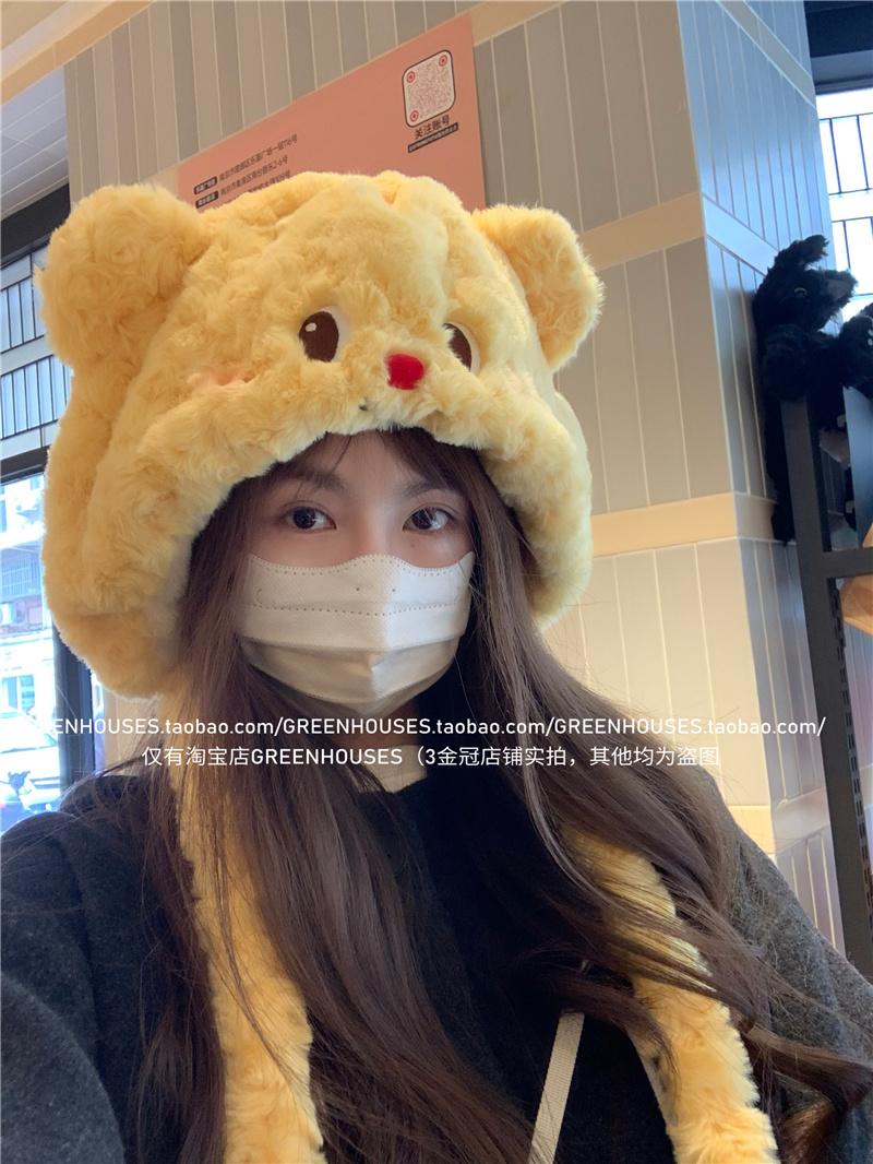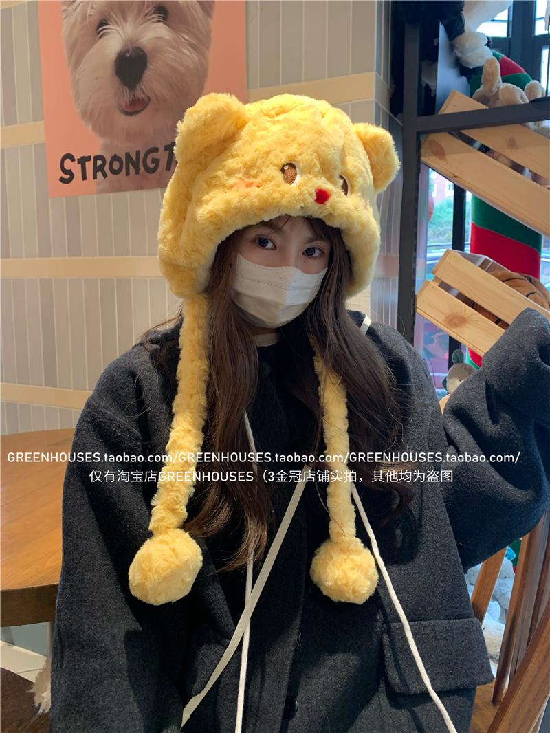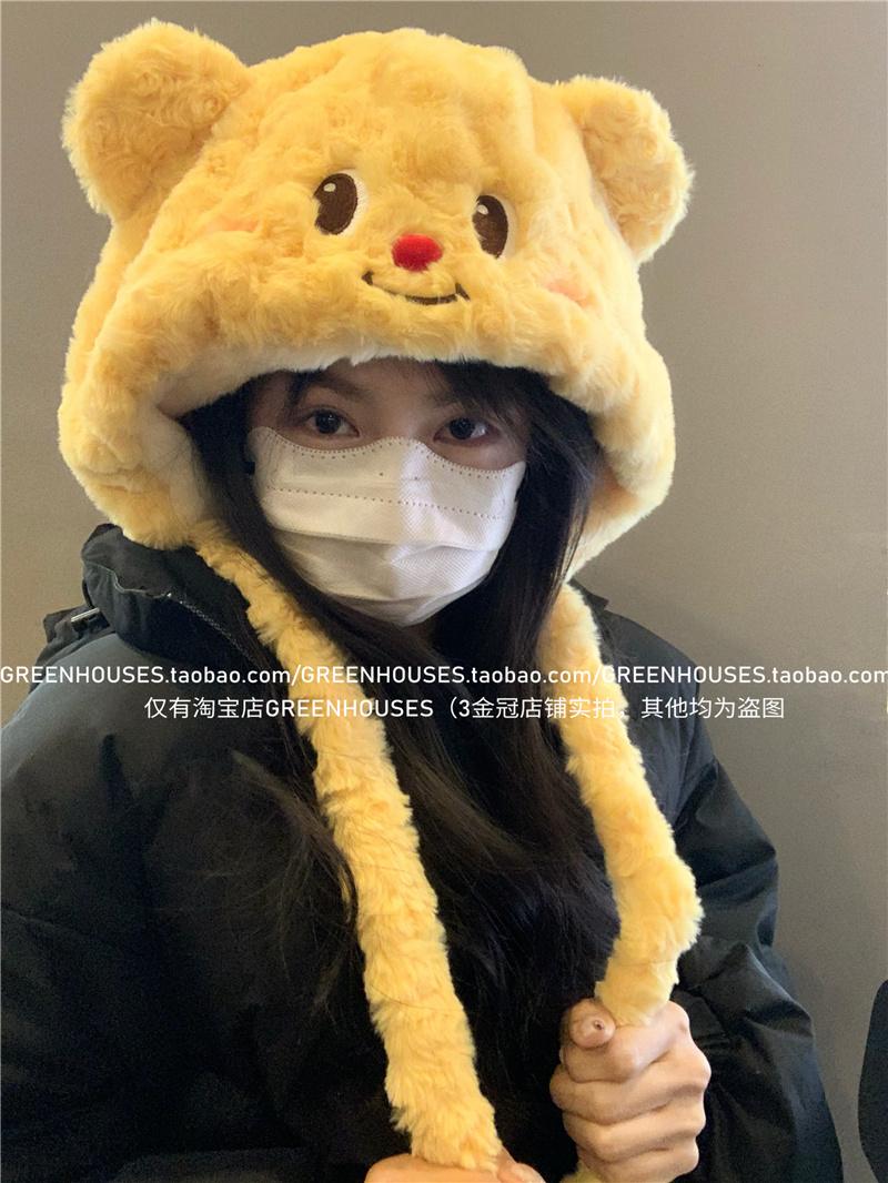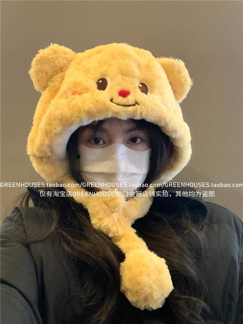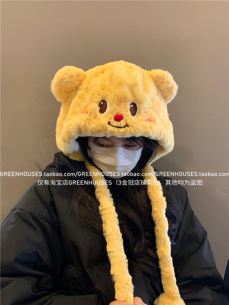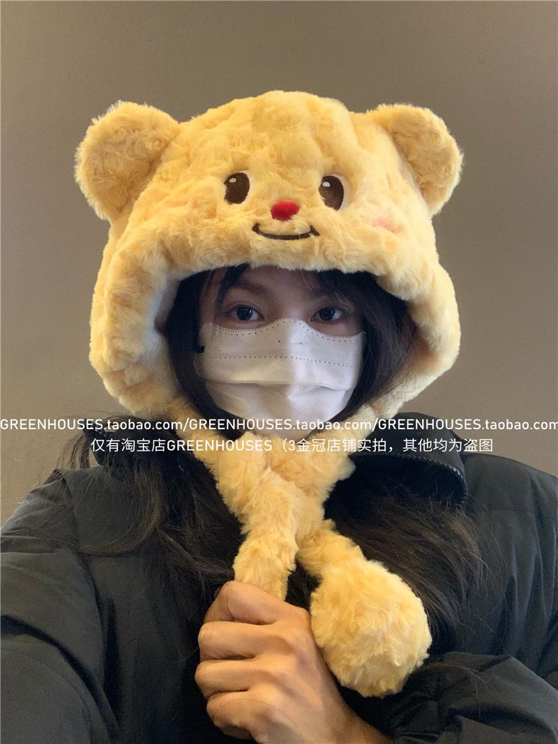 Lindo Oso de Mantequilla de Dibujos Animados Felpa Sombrero Lei Feng para Mujer Invierno Cálido Protección Profunda para las Orejas Gorro para Fotos de Equitación