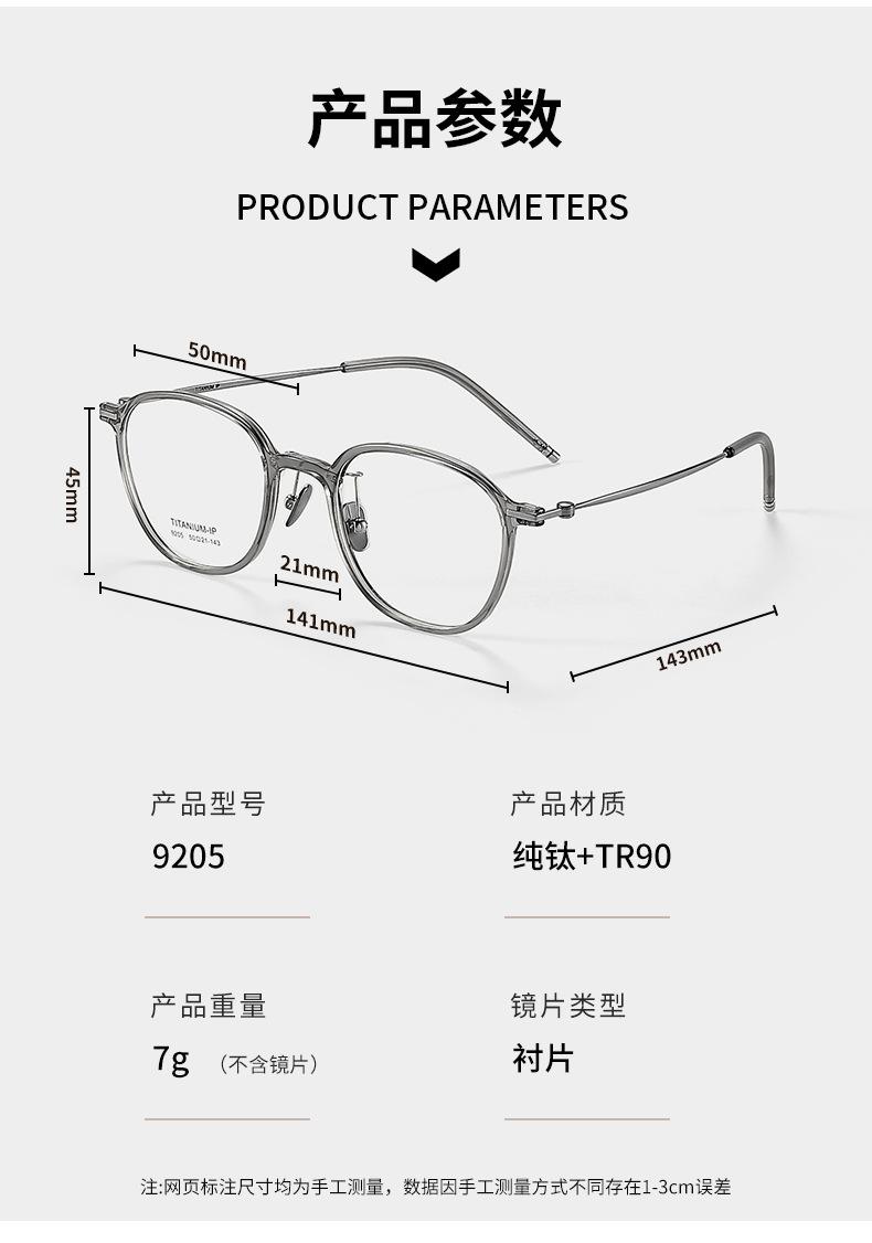 Gafas de Moda de Estilo Coreano con Montura Cuadrada, Montura para Miopía para Mujer, Estilo Ins 9205, Montura Ultraligera de Titanio Puro, Fábrica de Danyang con Graduación