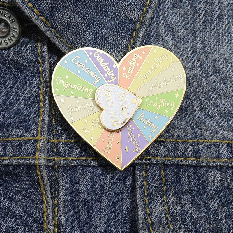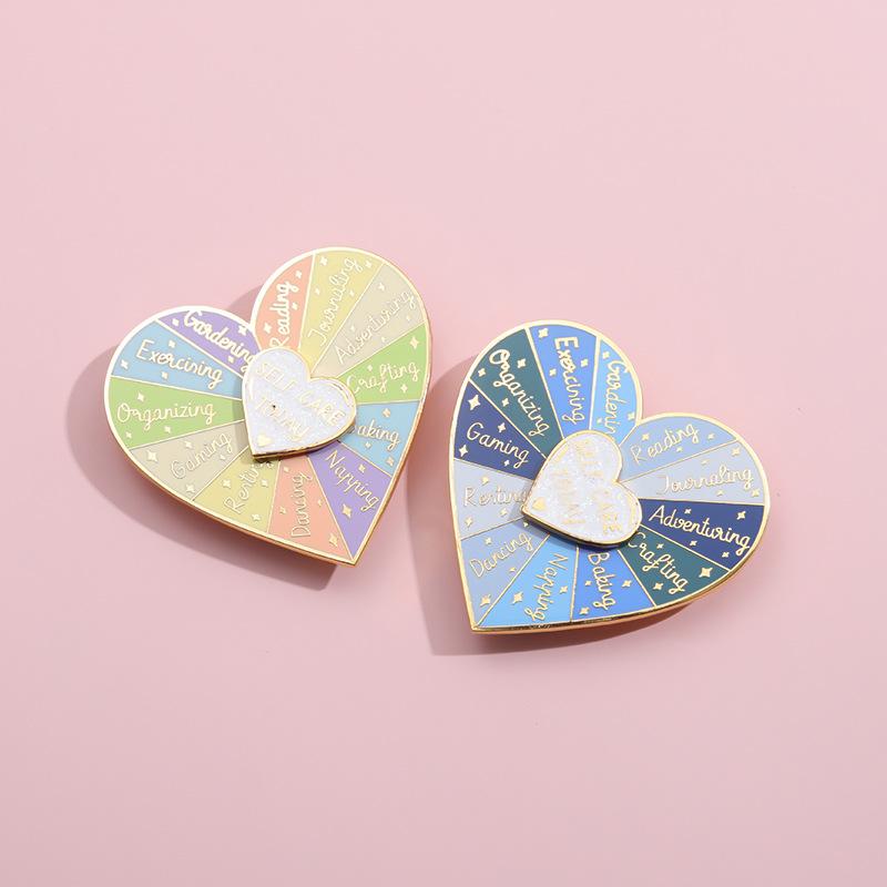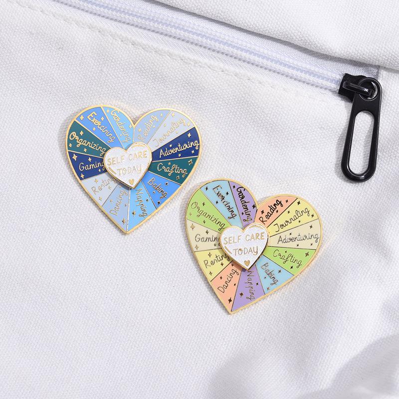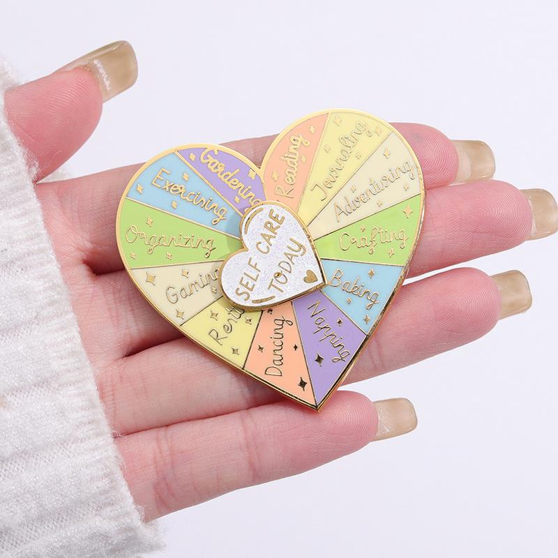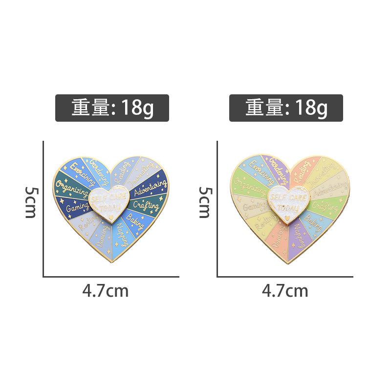 Broche de metal giratorio con forma de corazón, muy vendido en Amazon, con letras en inglés divertidas y decorativas.