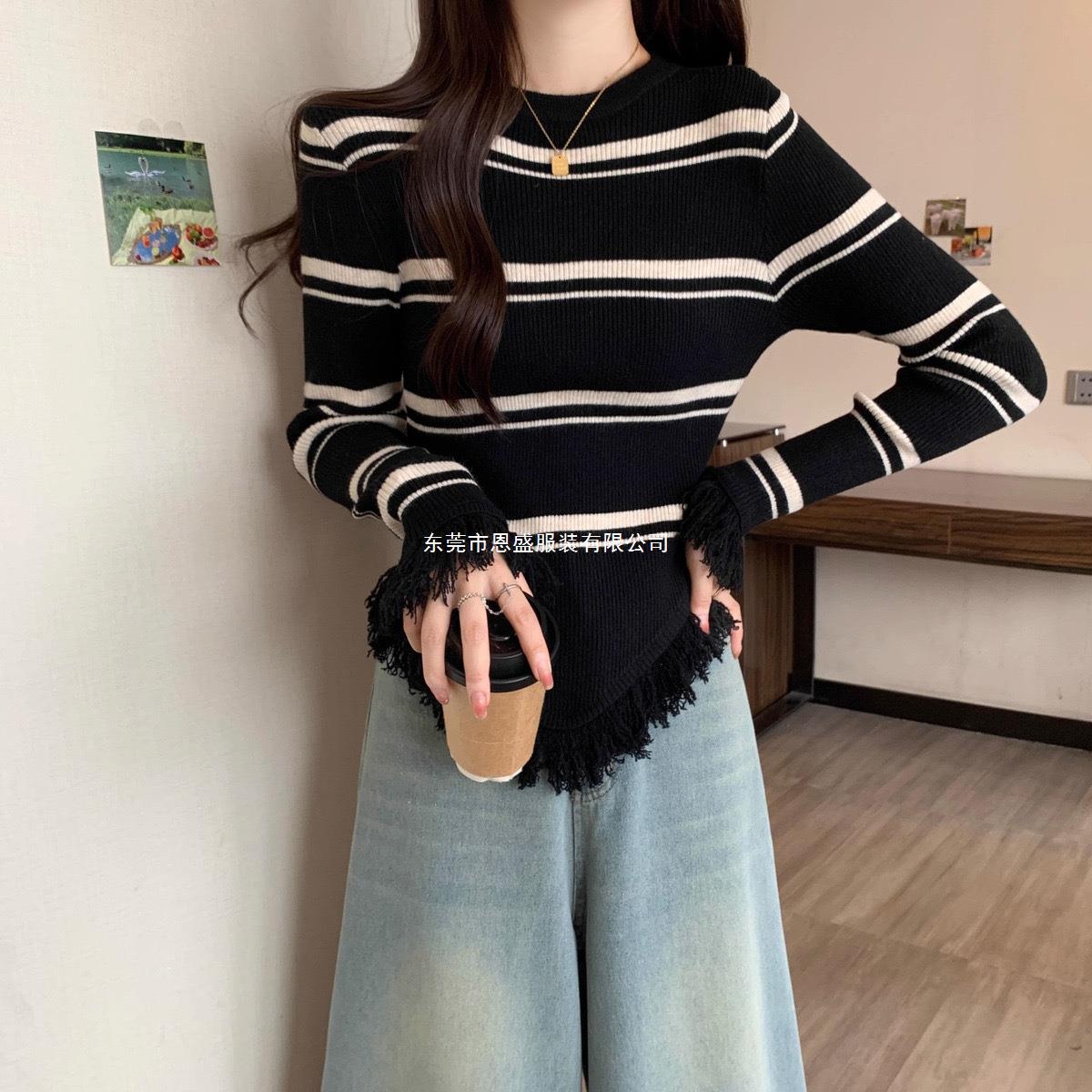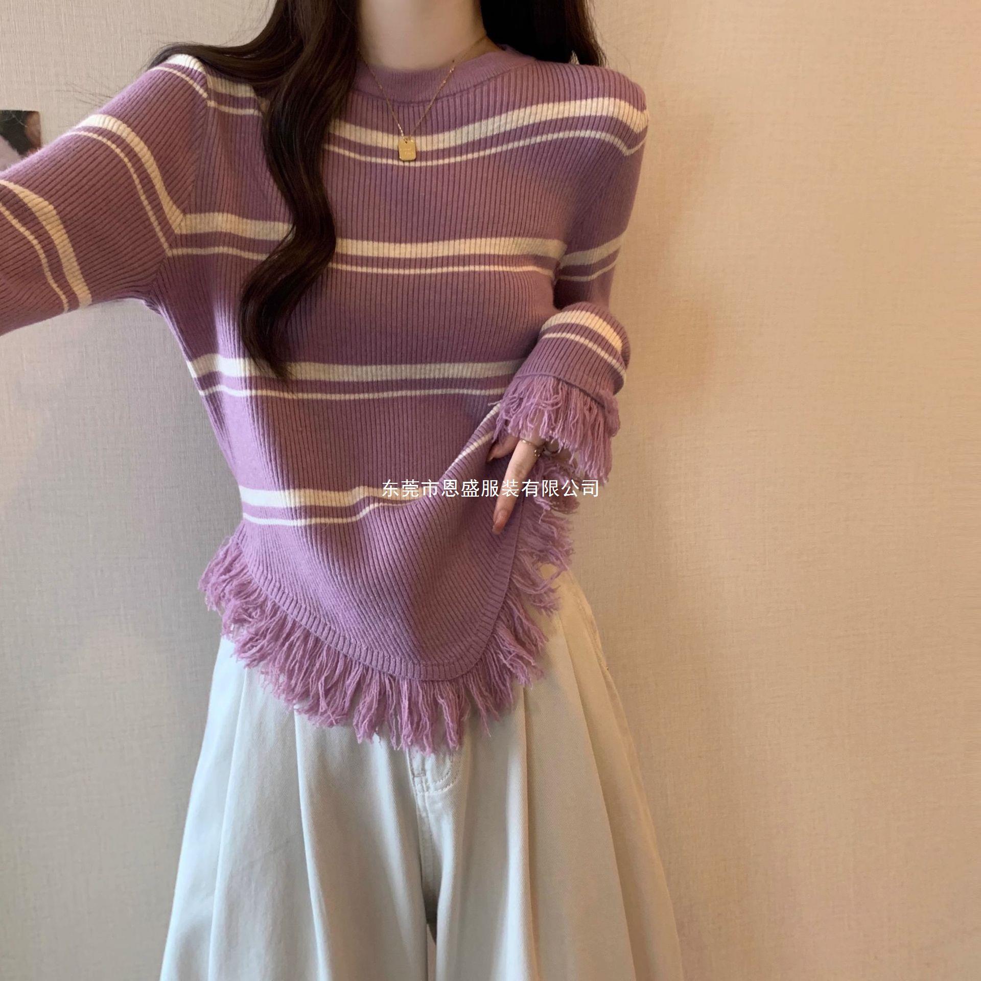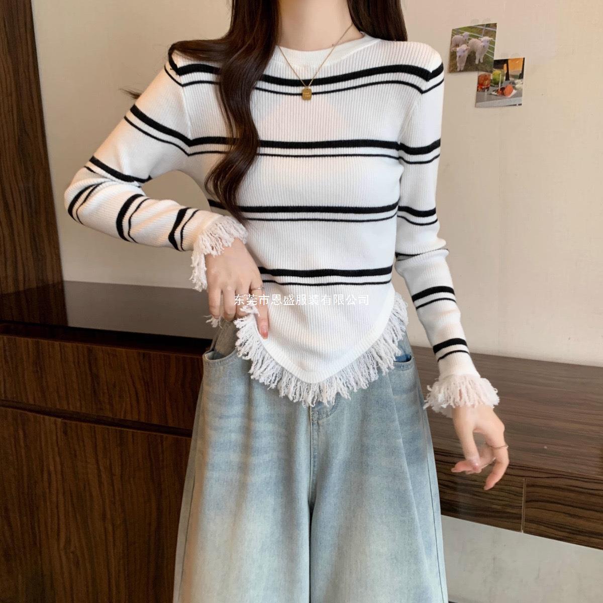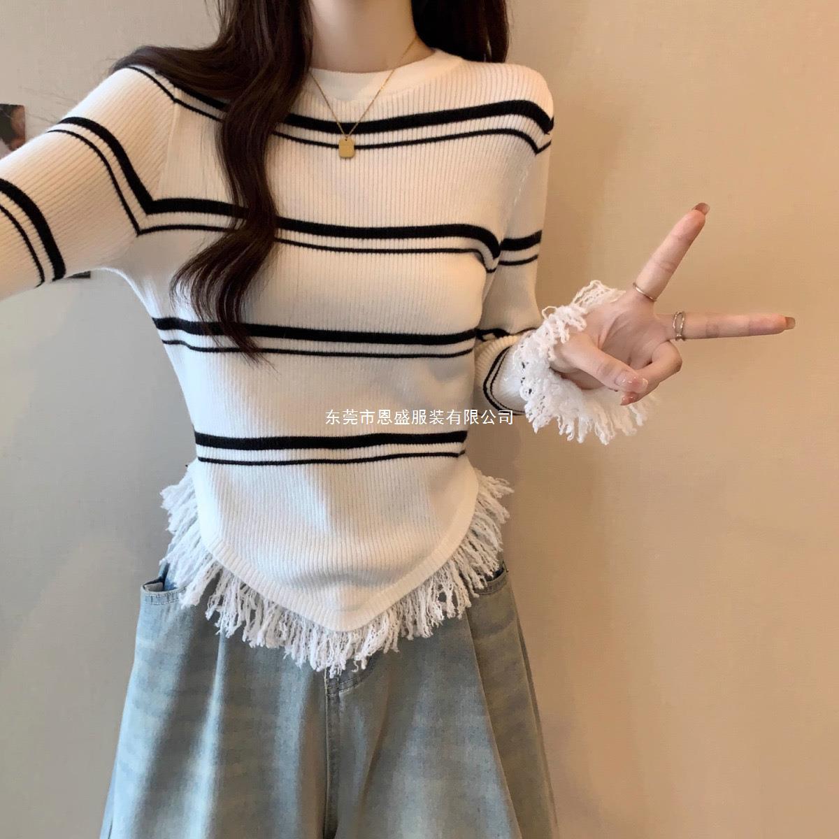 Suéter de cuello redondo con borlas irregulares y rayas, camisa de punto con diseño Sense Niche para mujer, otoño de 2024