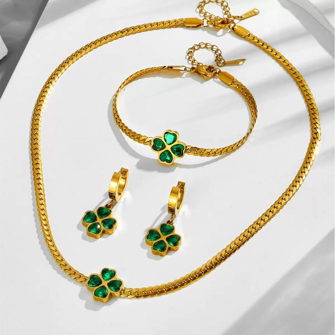 Collar para Mujer Transfronterizo Flor de Cuatro Hojas Corazón Esmeralda 18K Set Nuevo Europeo y Americano Aretes Collar Pulsera Set