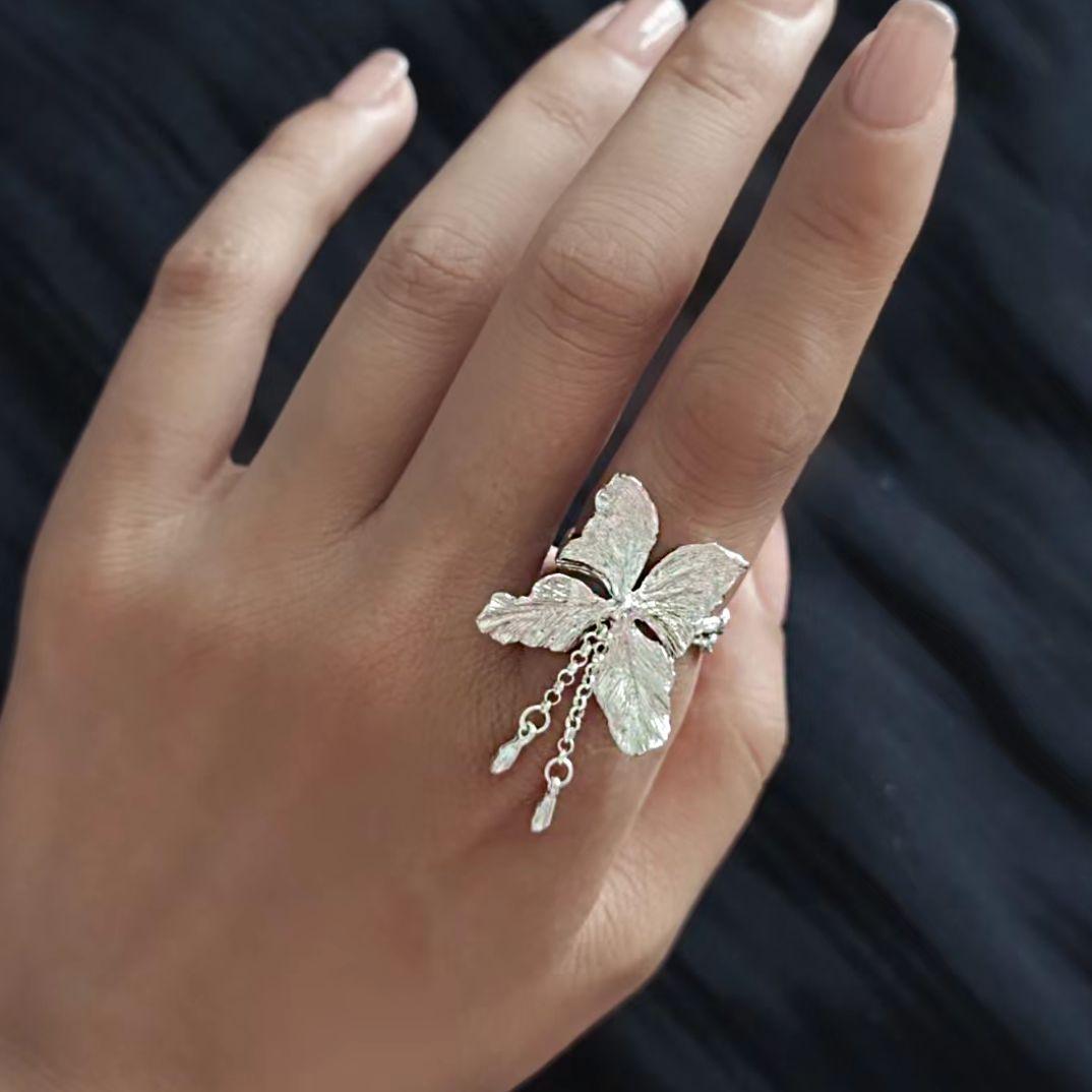 Anillo de Borla con Flor de Jengibre y Hoja de Estilo Chino Nuevo para Mujer, Diseño de Borla Cool, Elegante, Abierto, Ajustable, Anillo de Flor