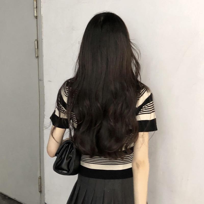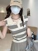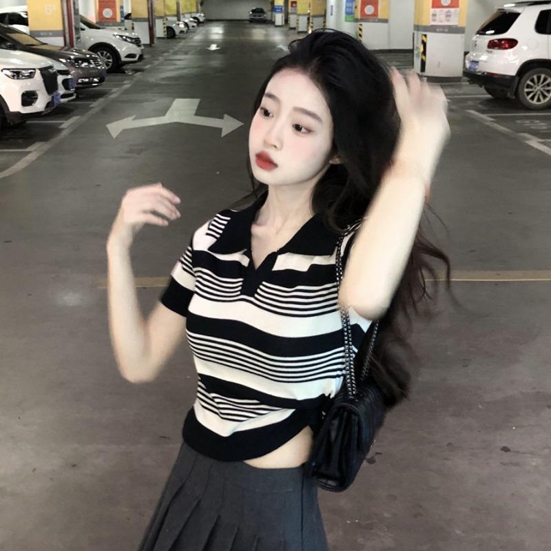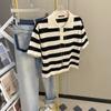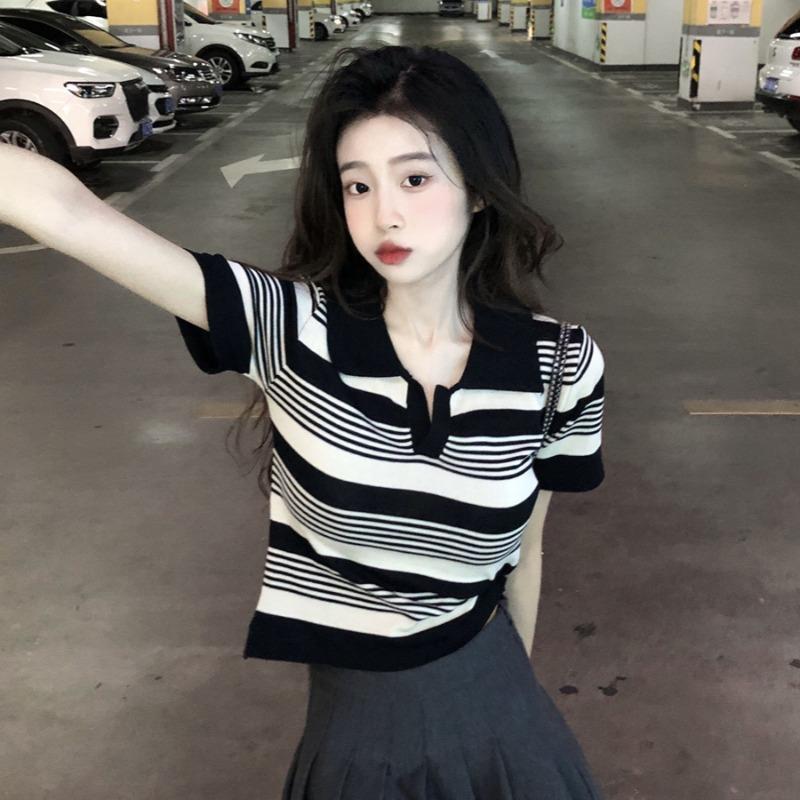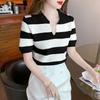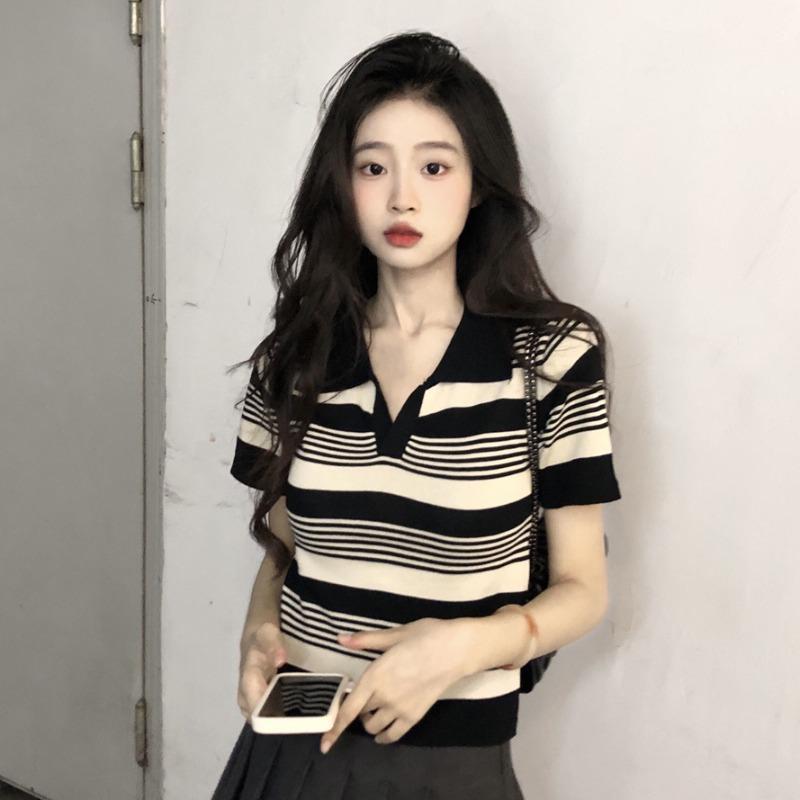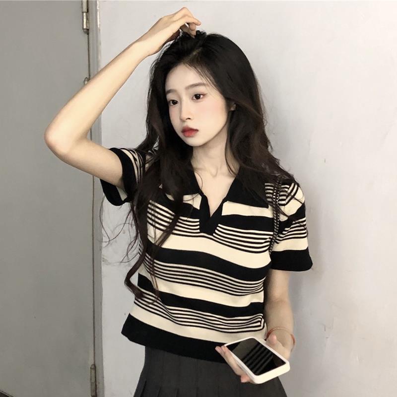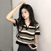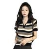 Camiseta de manga corta a rayas con cuello POLO a juego de colores para mujer, nueva camiseta de verano de corte entallado para estudiantes, adelgazante, versátil, con cuello abierto.