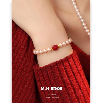 Pulsera de cuentas de perlas rosas retro para mujer, nueva pulsera elástica china, exquisita joyería de alta gama al por mayor
