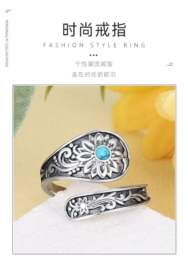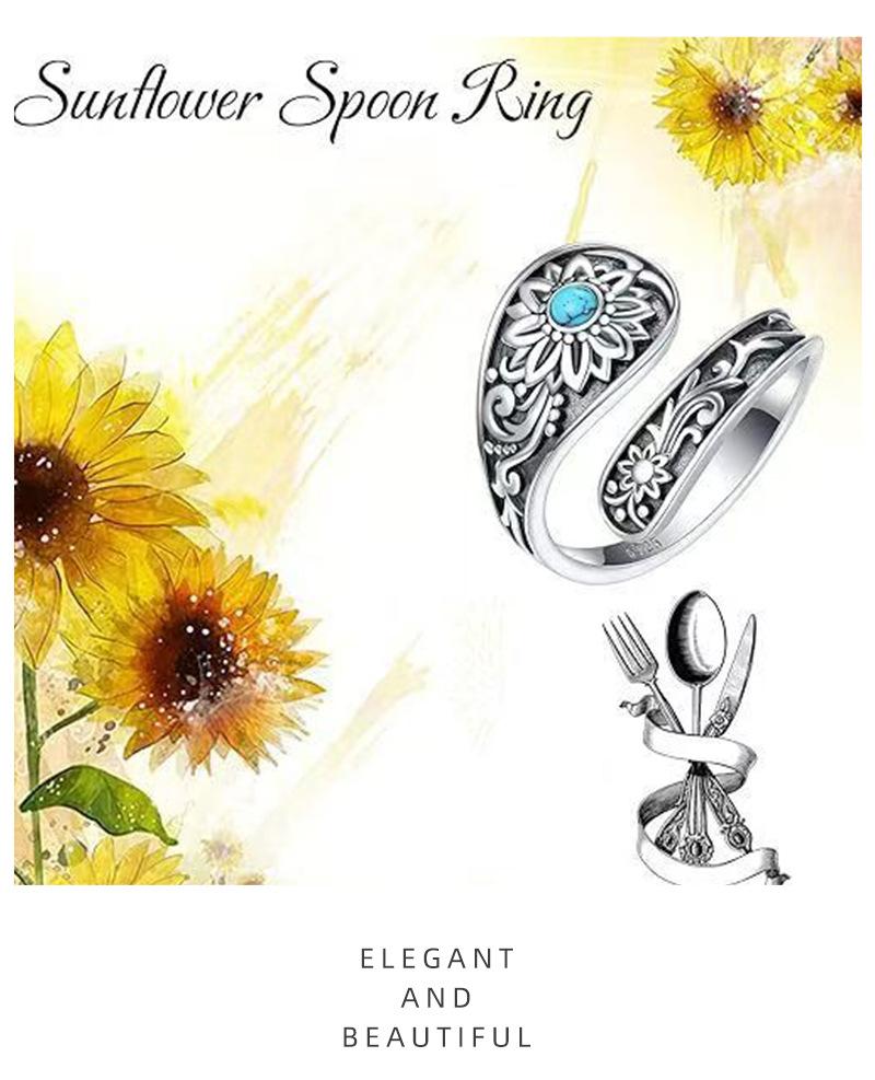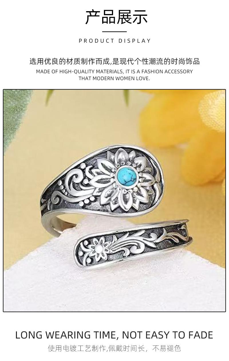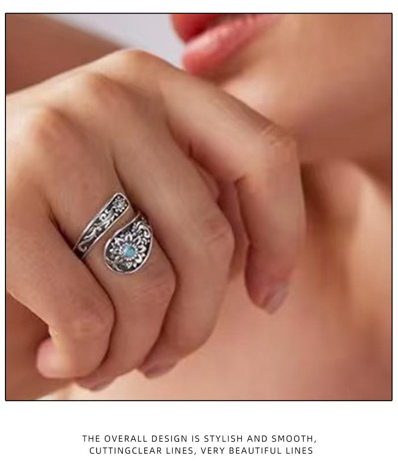 Anillo Nuevo Bohemio Transfronterizo Vintage Girasol Turquesa Anillo para Mujer Flor Apertura Anillo Ajustable