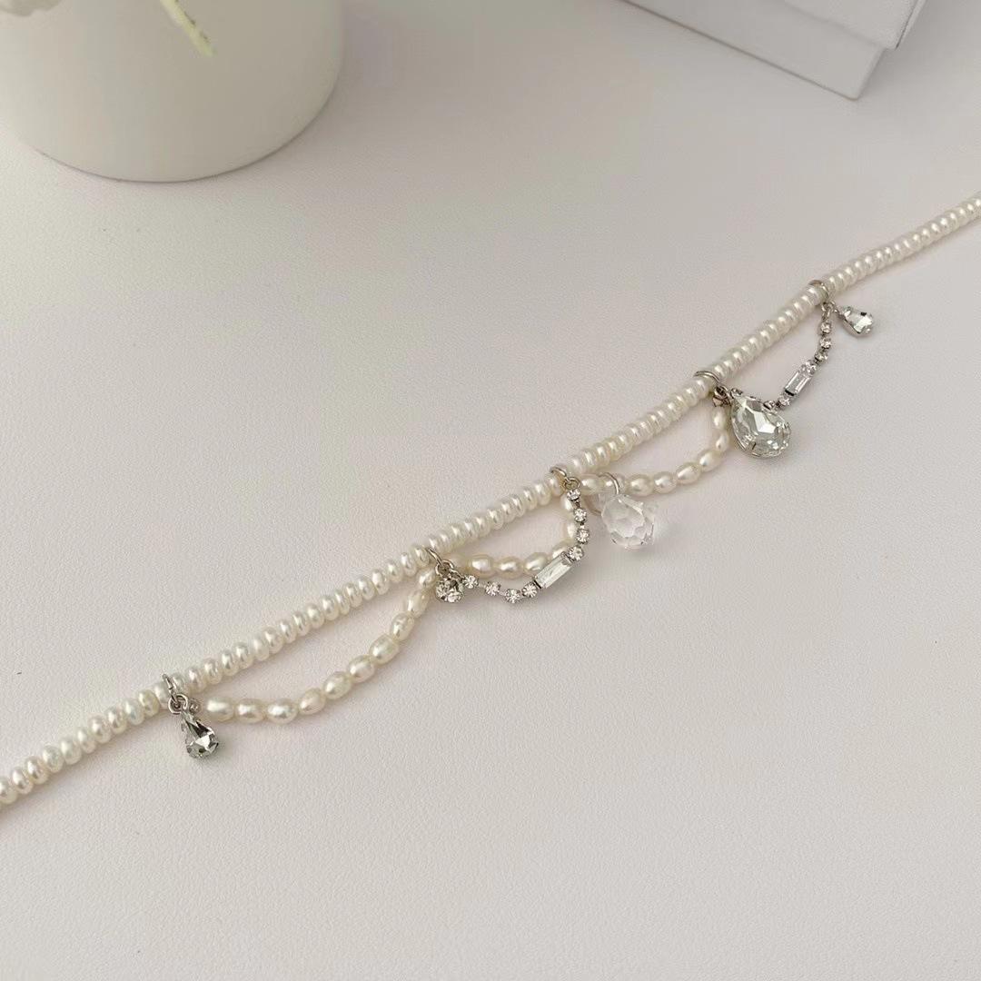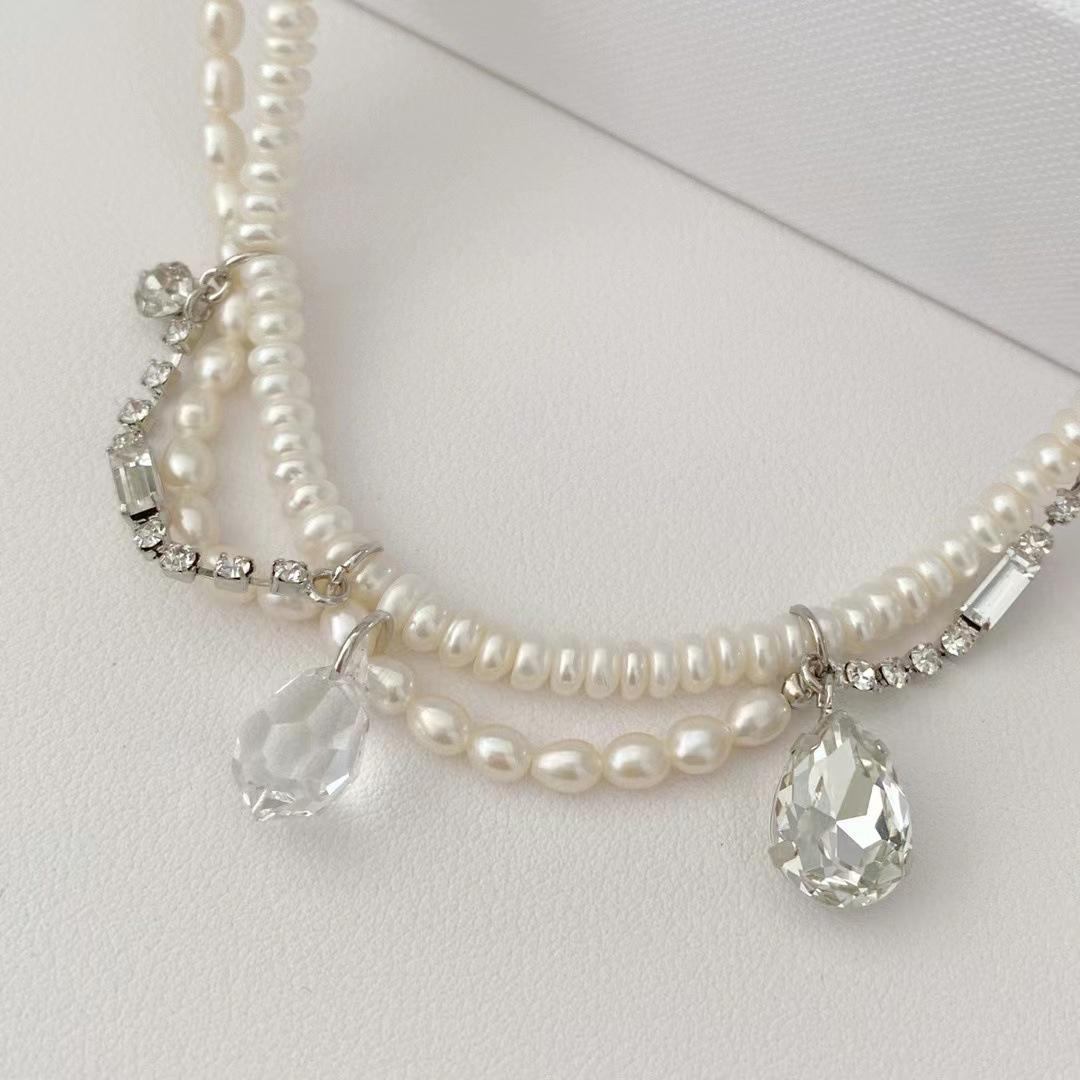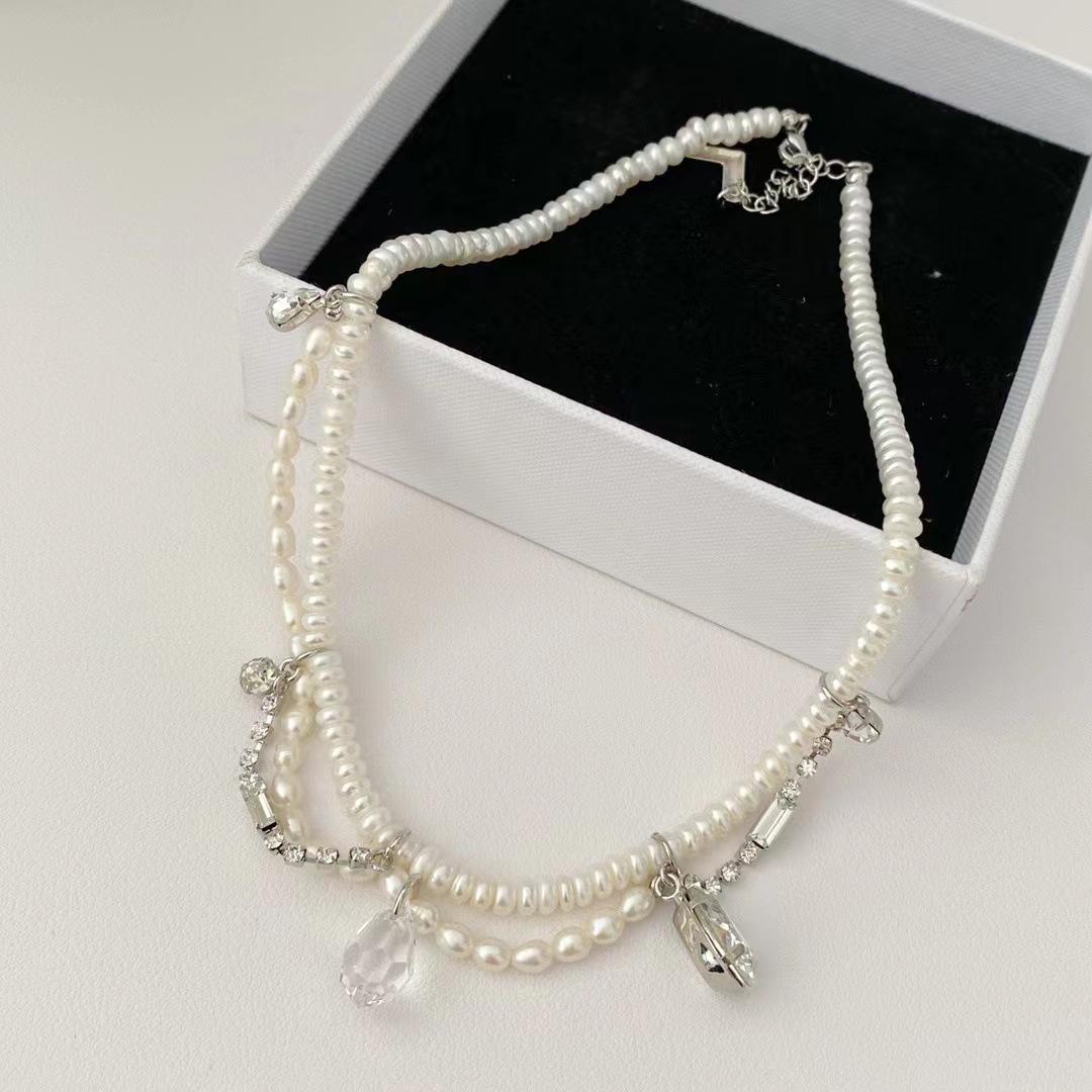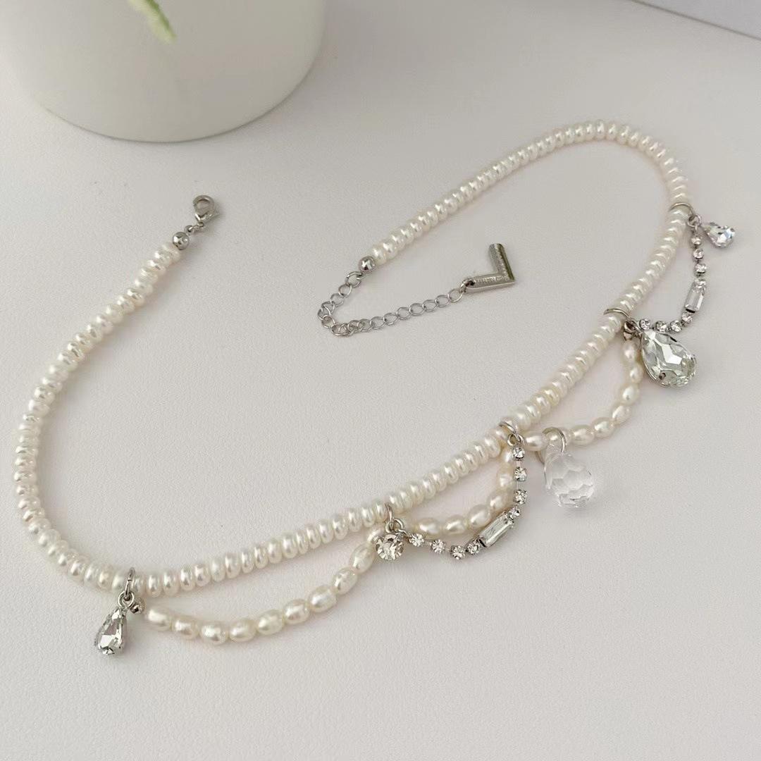 VH Colgantes de Perlas Pequeñas de Agua Dulce Diamante Collar Cadena Clavícula Retro de Alta Gama Lujo Ligero Cadena Elegante