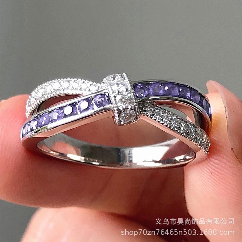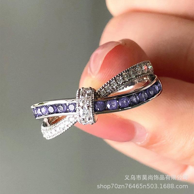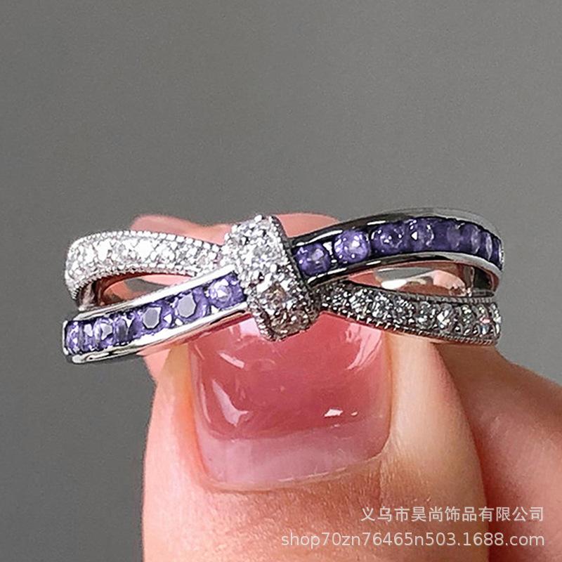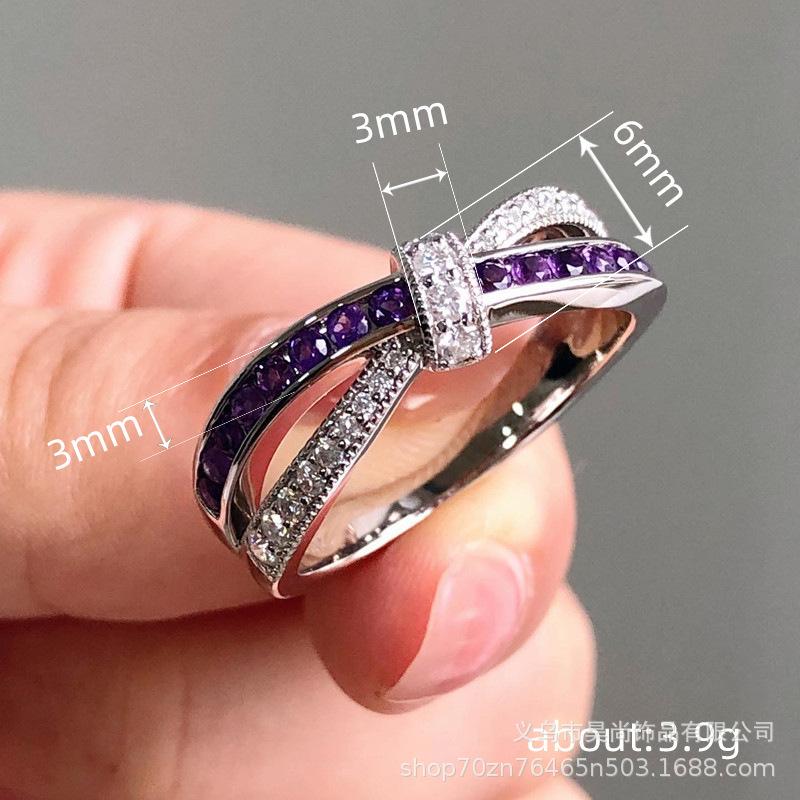 Anillo europeo y americano de moda cruz diamante púrpura cerrado circonita anillo para mujer romántico anillo de lazo joyería al por mayor