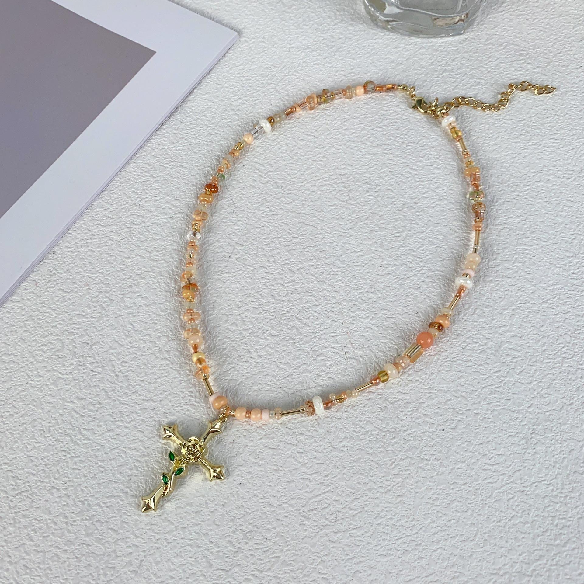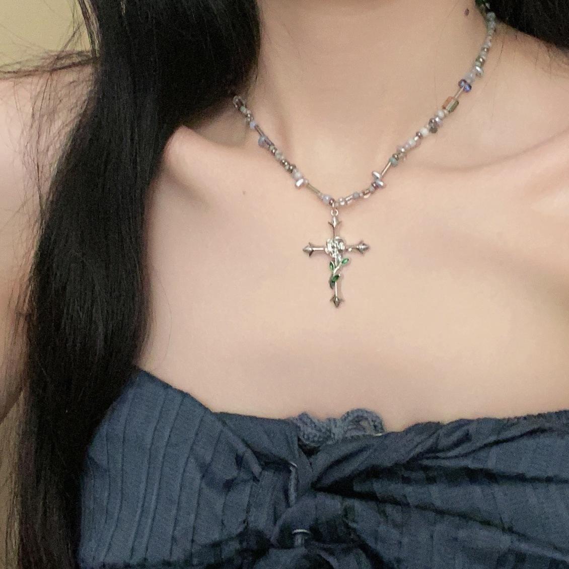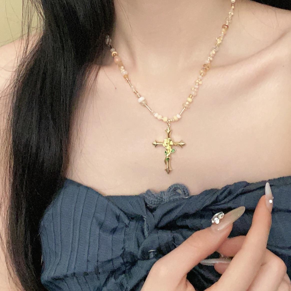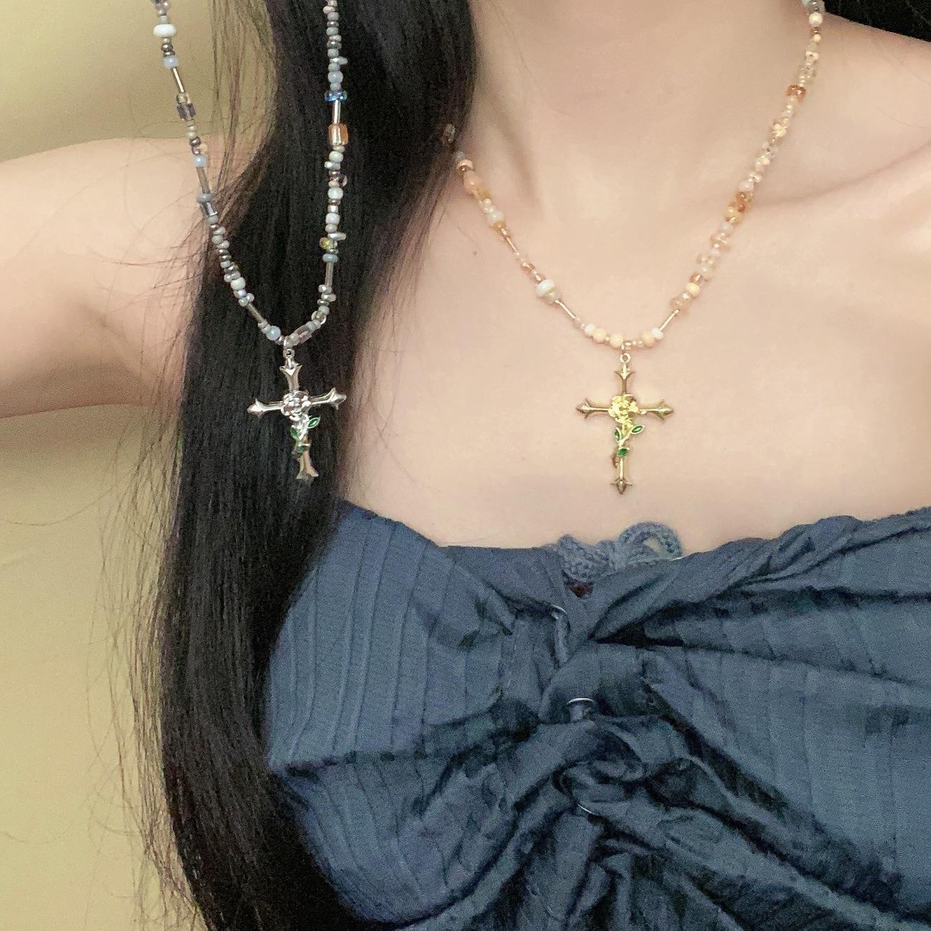 Collar con colgante de cruz de rosa de mosaico Cadena de clavícula de moda europea y americana transfronteriza Collar de diseño de nicho de alta gama