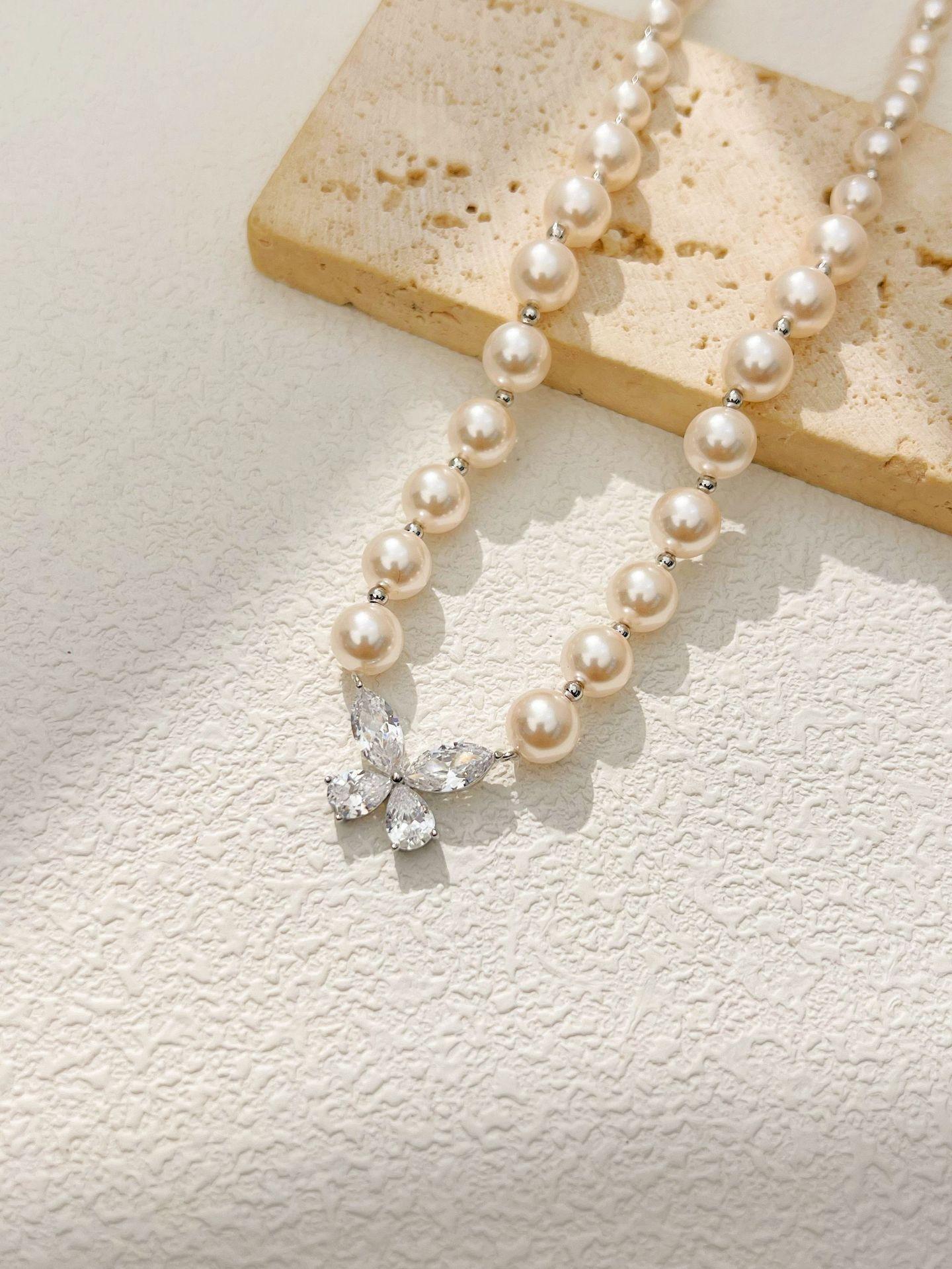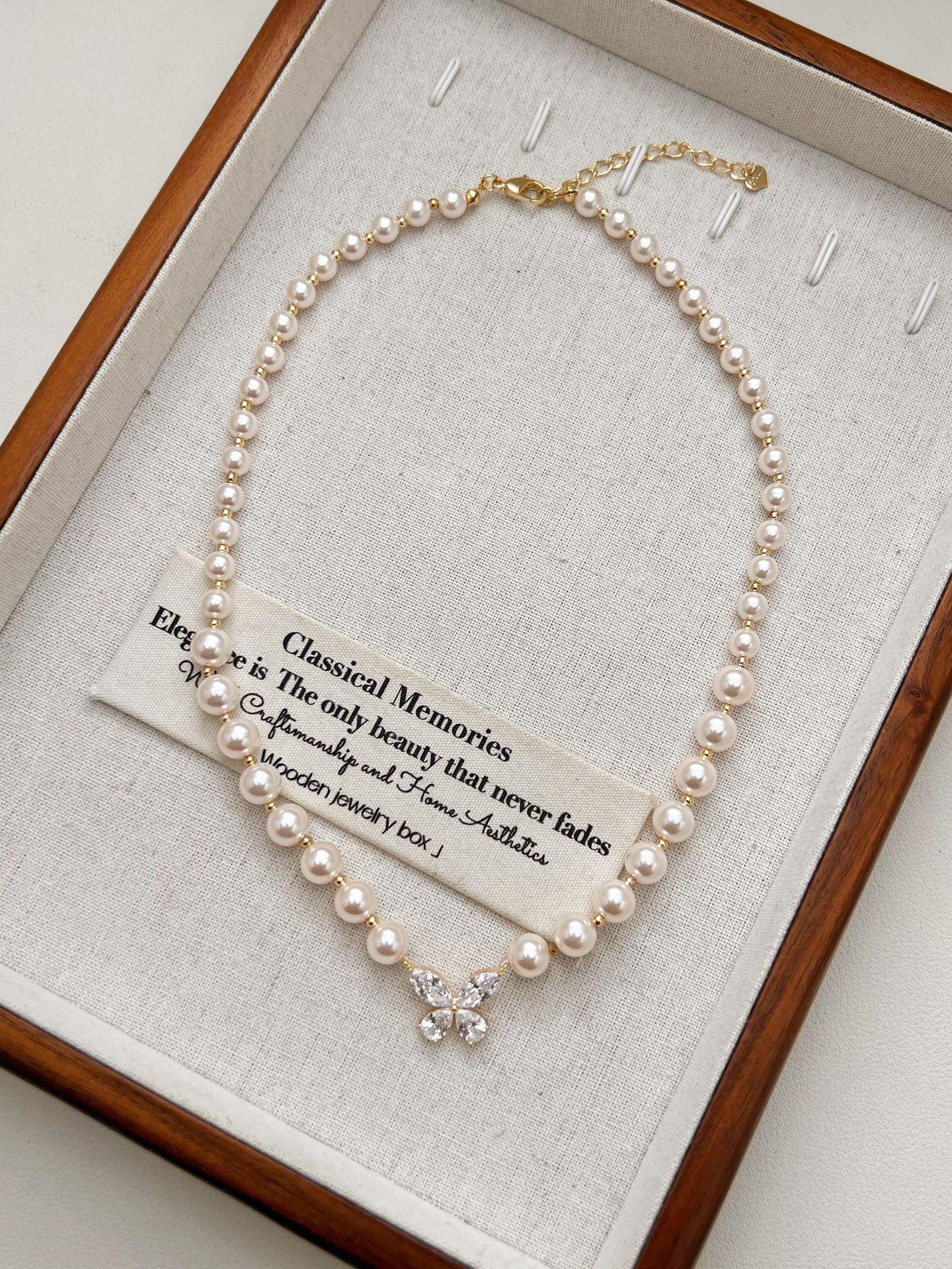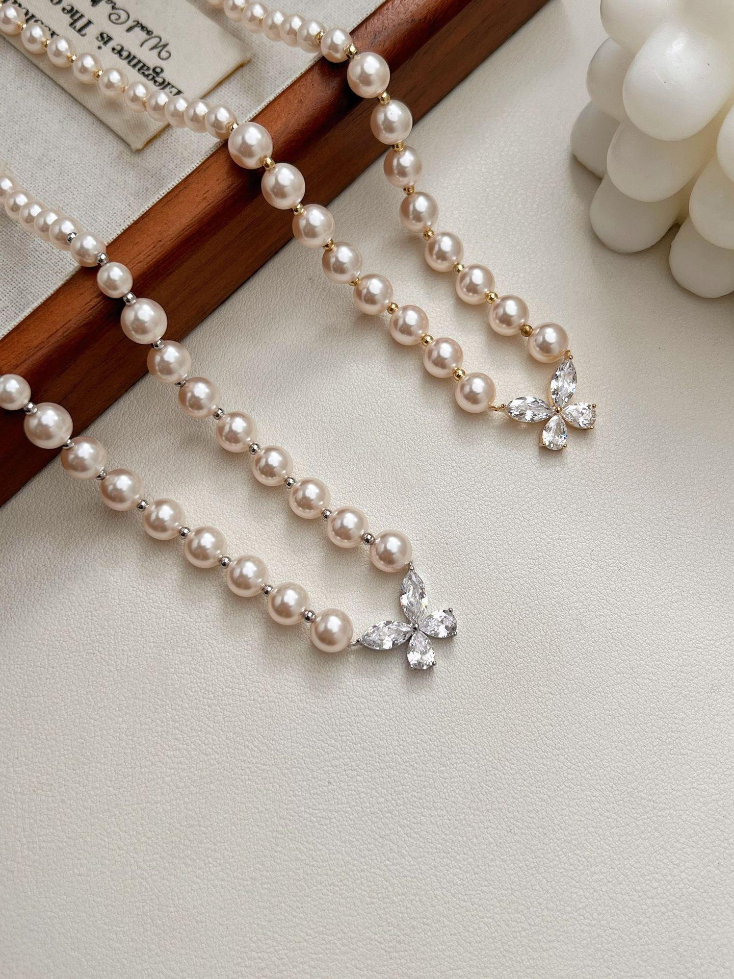 Collar de perlas con colgante de mariposa y circonita, joyería de diseño de nicho de alta gama, accesorios de viaje para mujer que combinan con todo.
