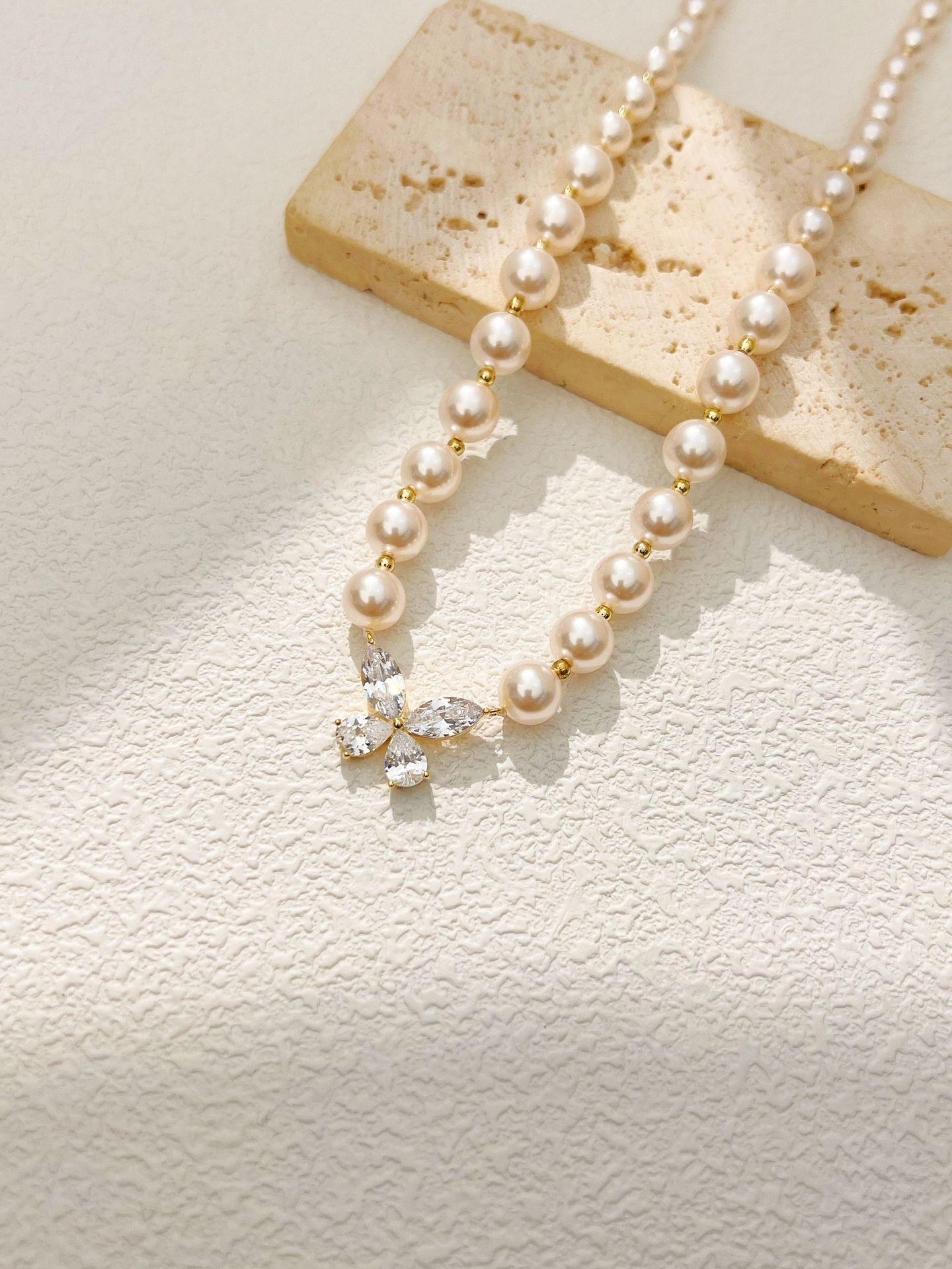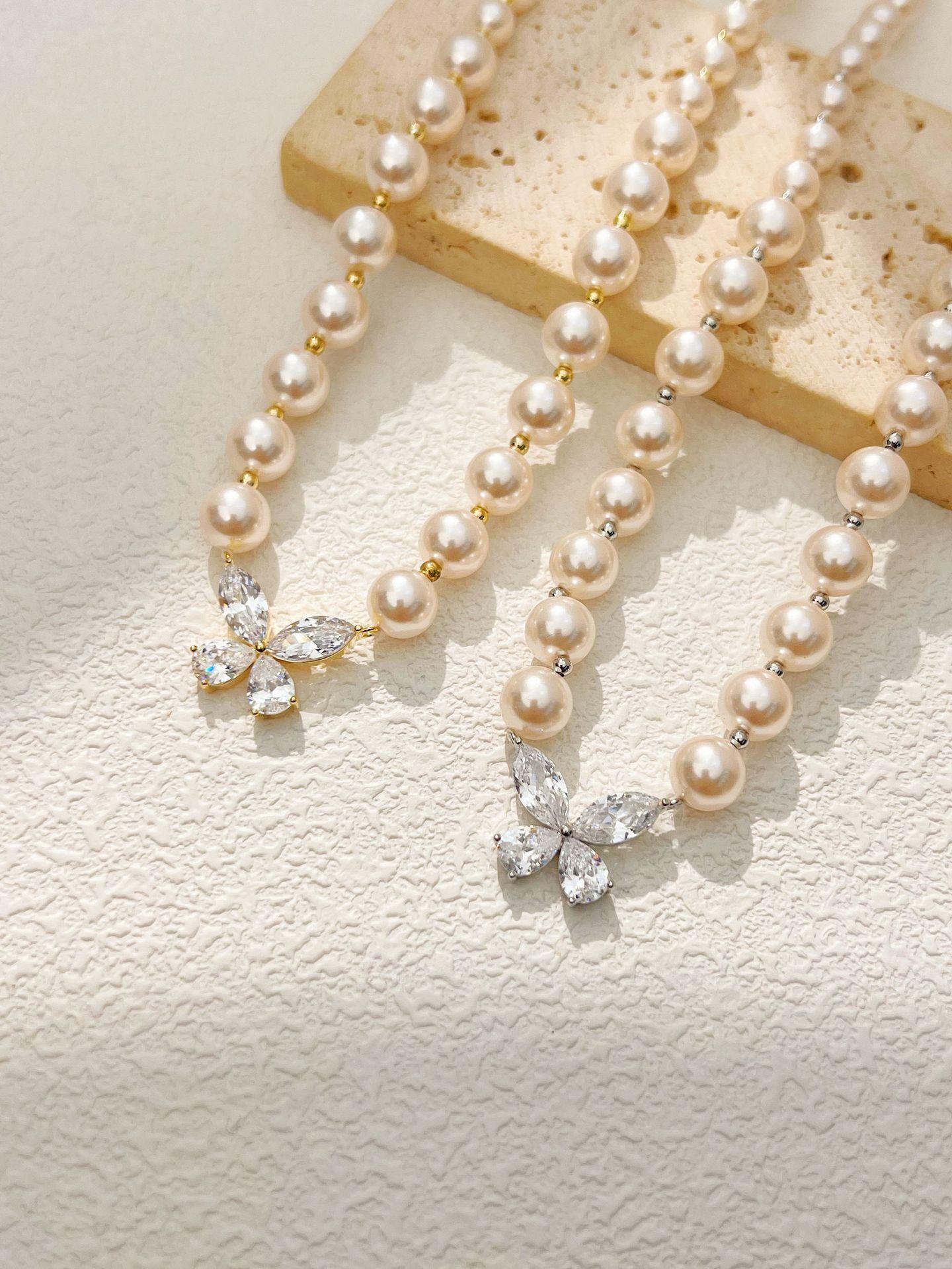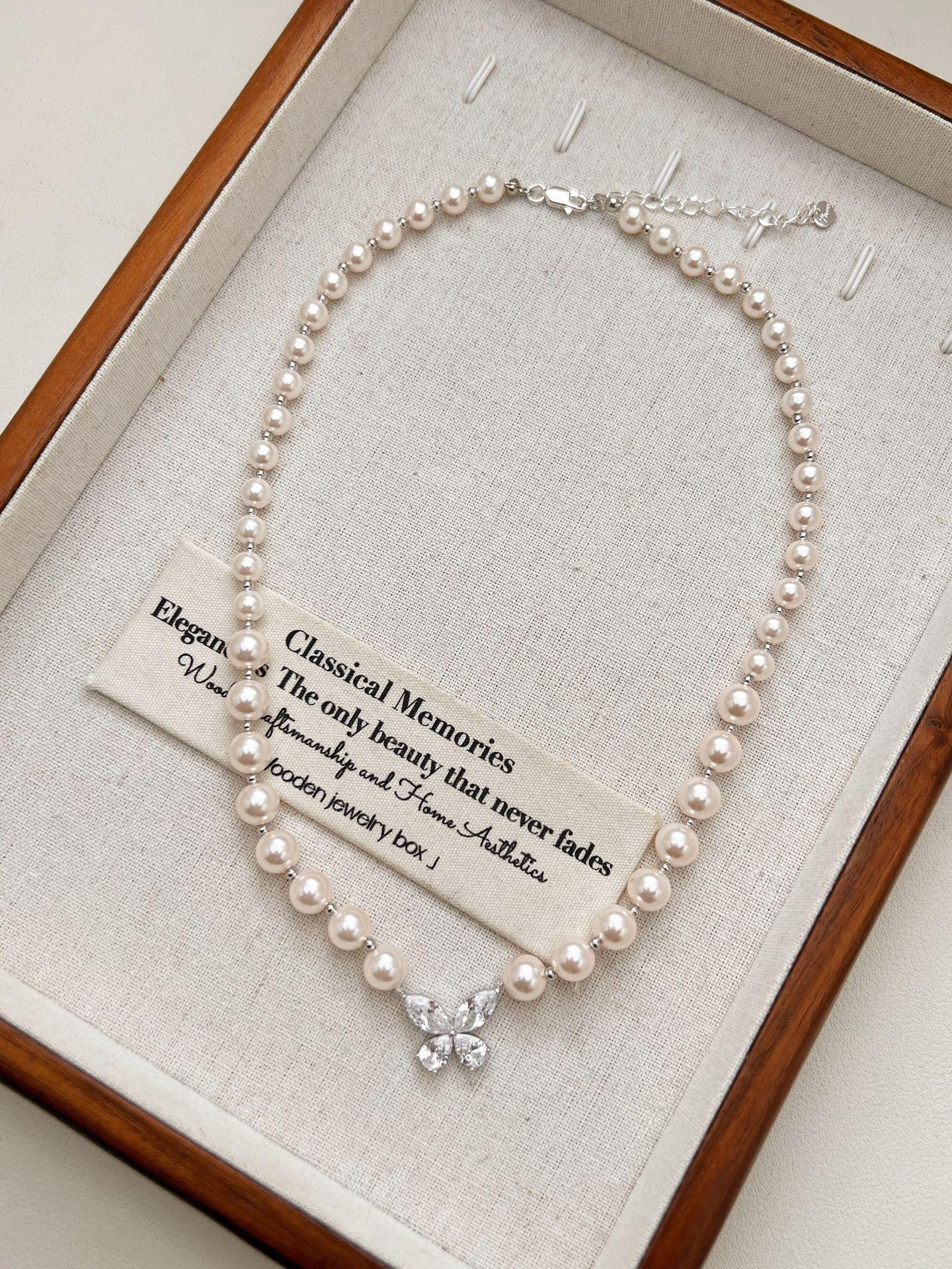 Collar de perlas con colgante de mariposa y circonita, joyería de diseño de nicho de alta gama, accesorios de viaje para mujer que combinan con todo.