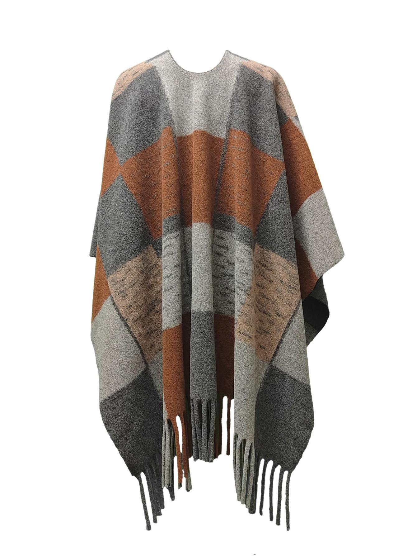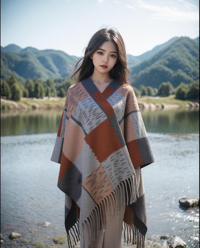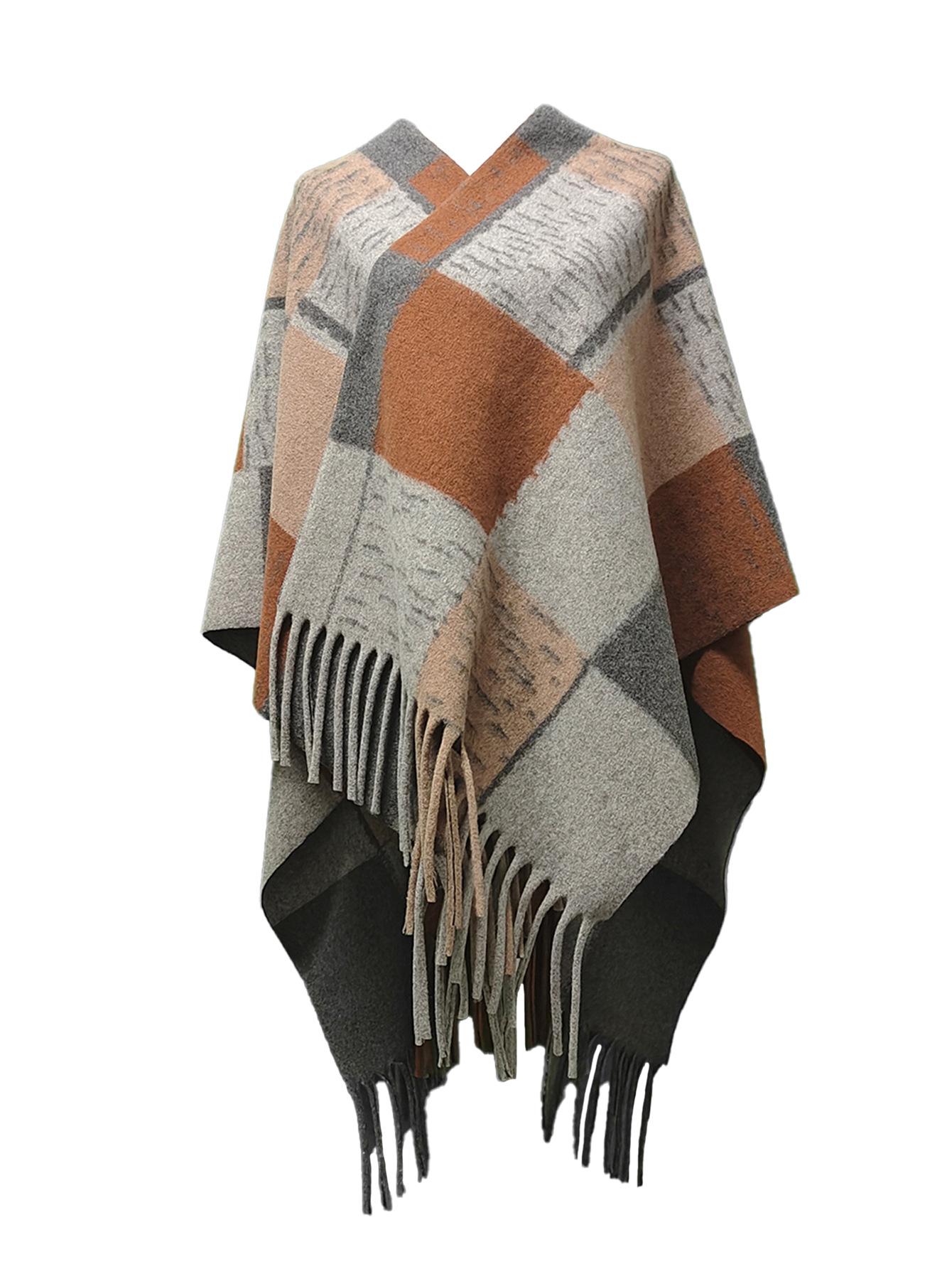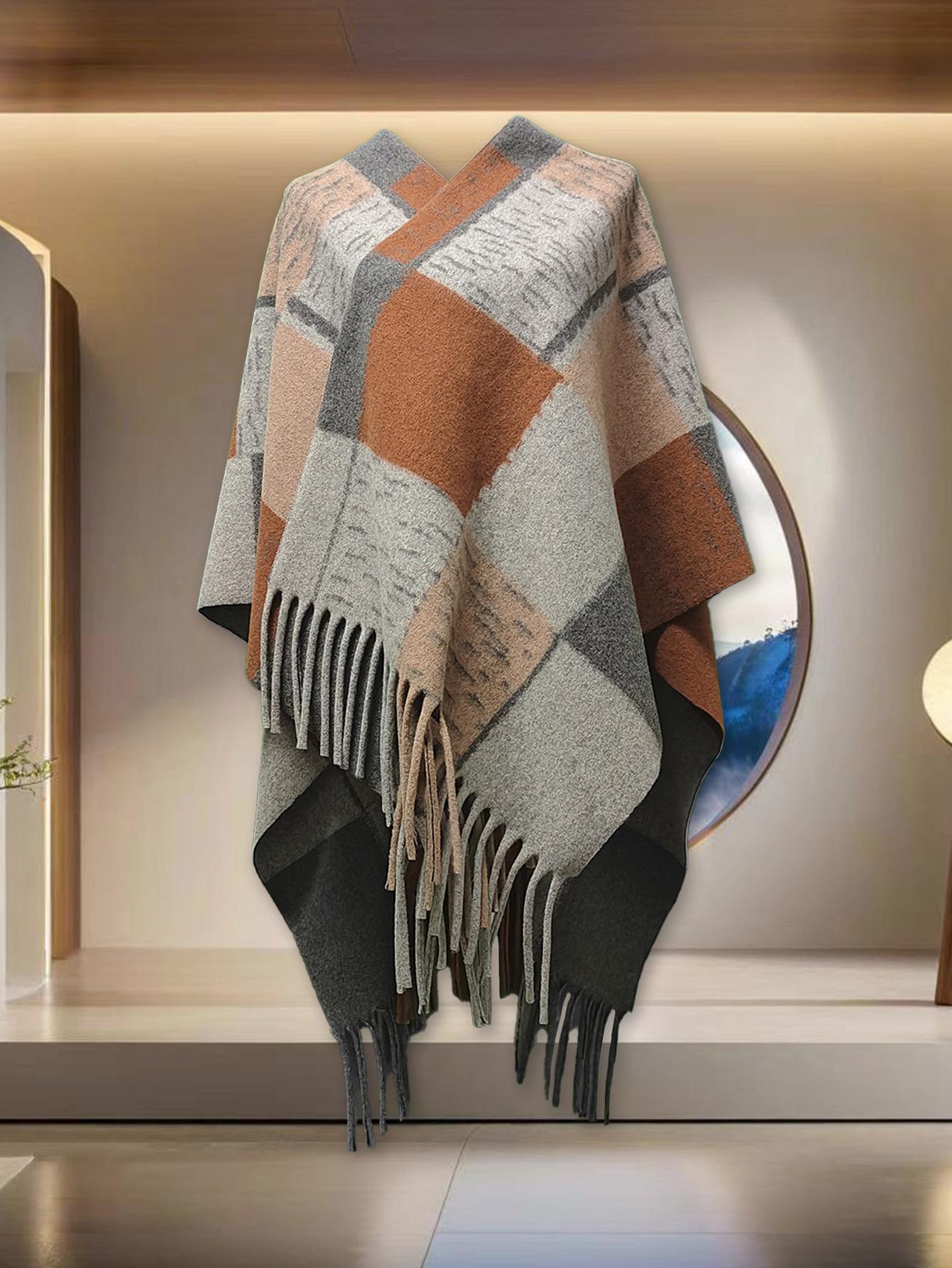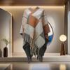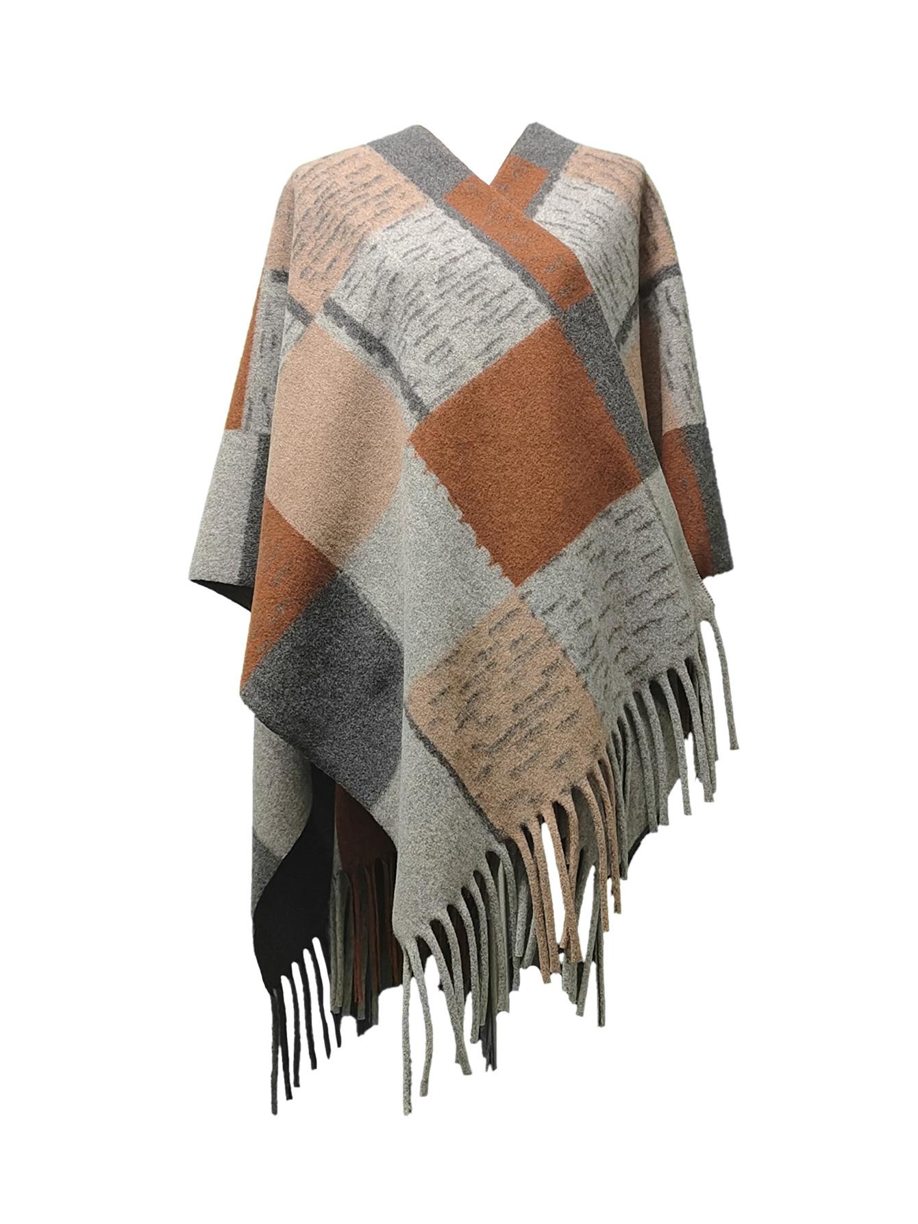 Fábrica de origen chal con flecos capa retro otoño e invierno impresión de alta gama en capas nueva moda chaqueta de doble vista para mujer otoño suelta combinable top cálido prenda exterior