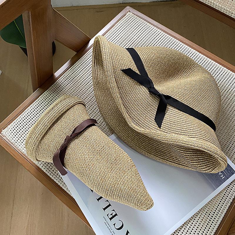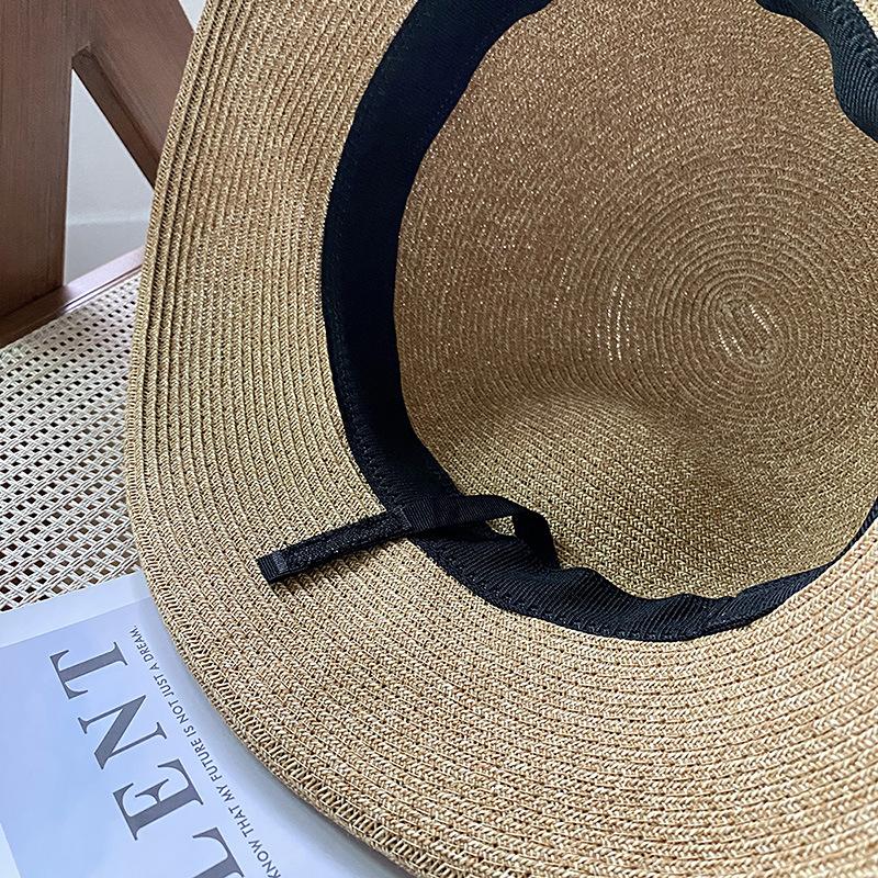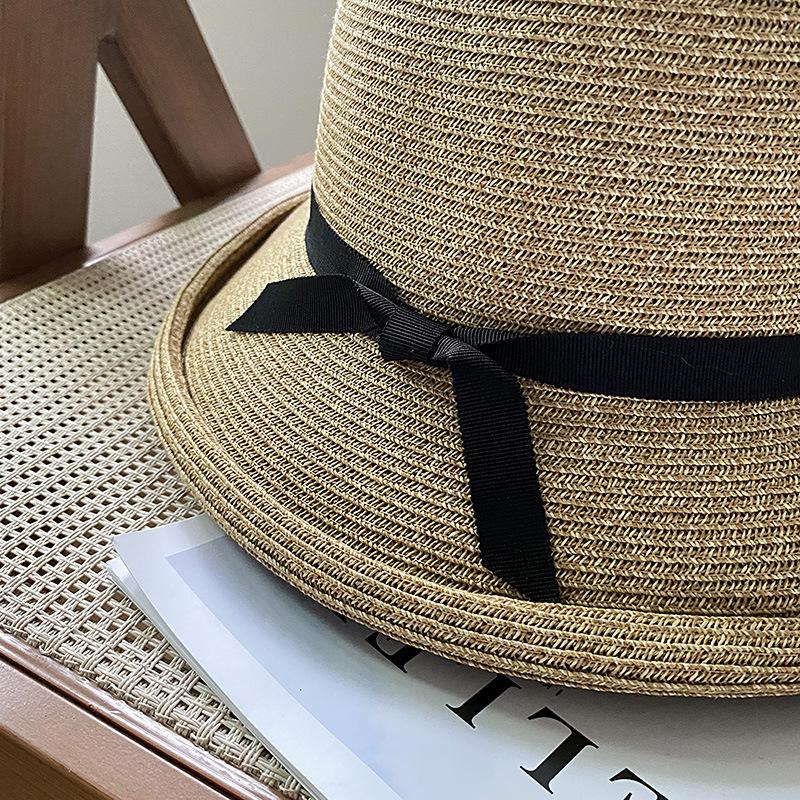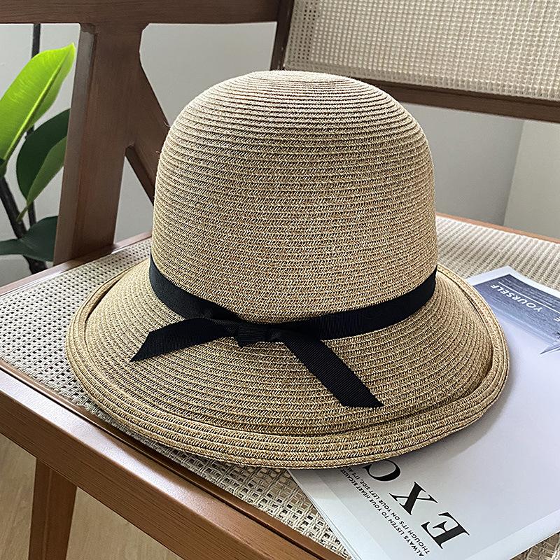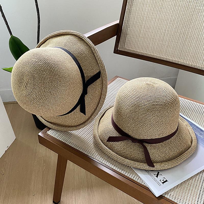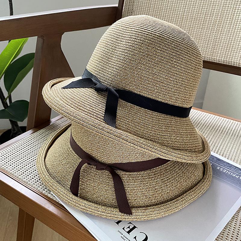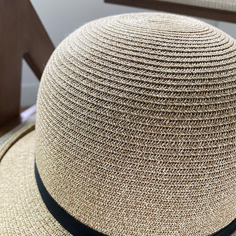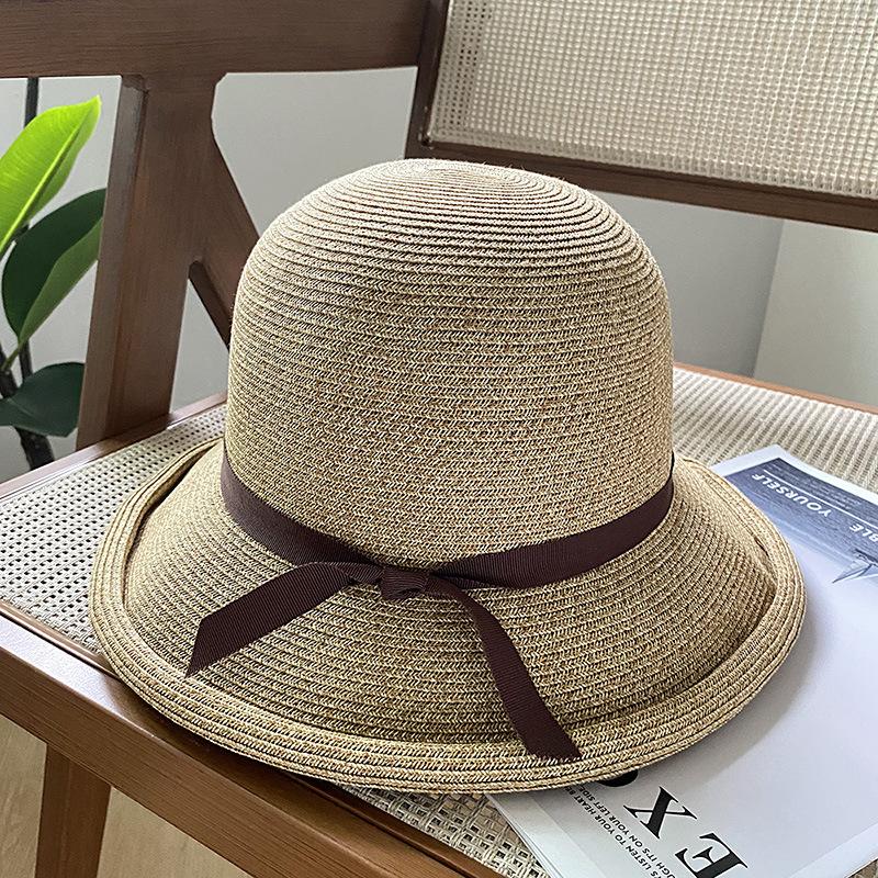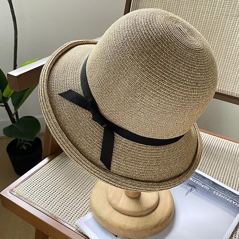 Sombrero de pescador con lazo fino y rizado para mujer, gorro de paja versátil e informal, a prueba de sol, para playa y vacaciones, de verano