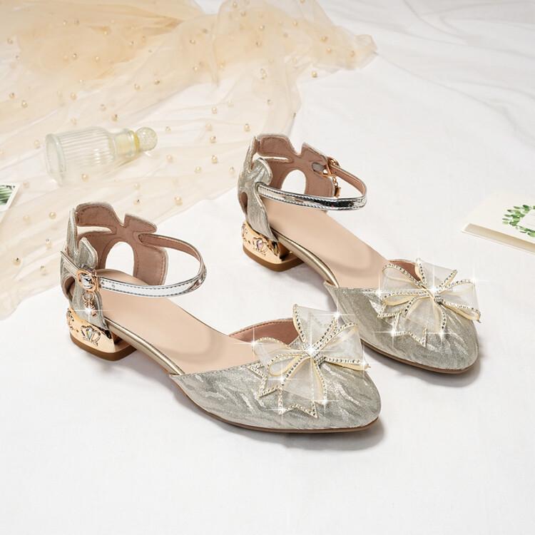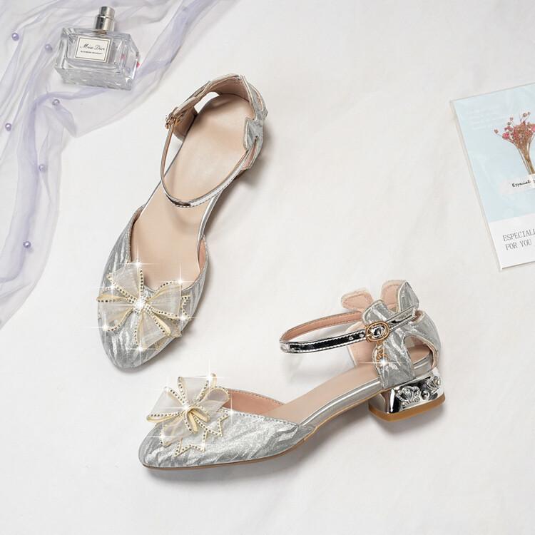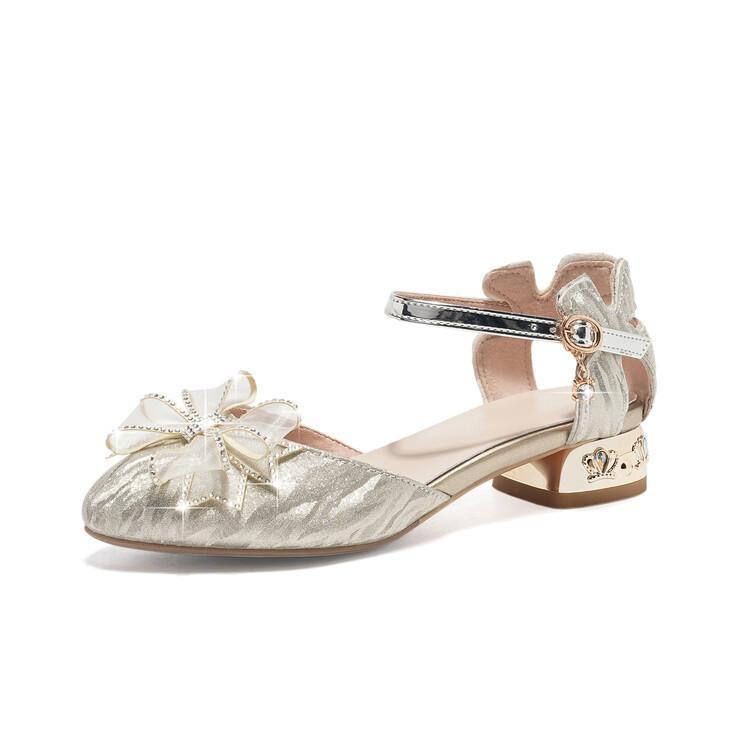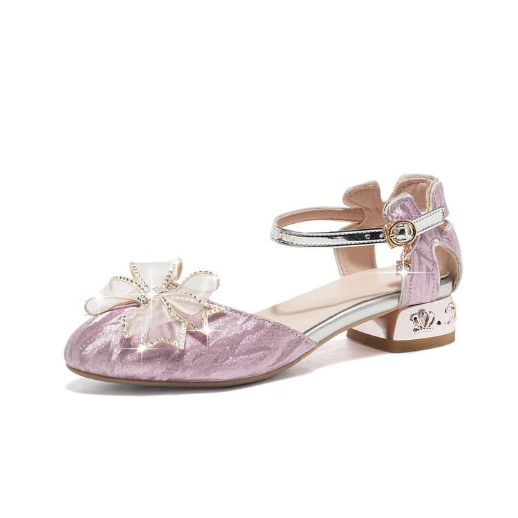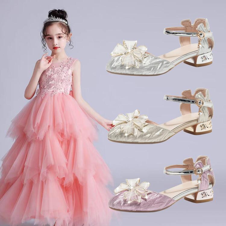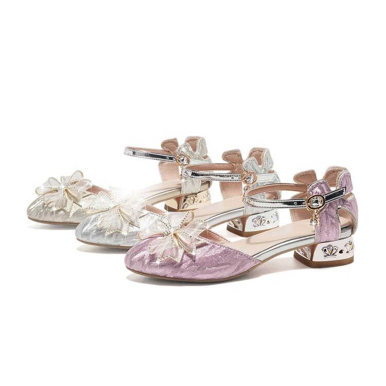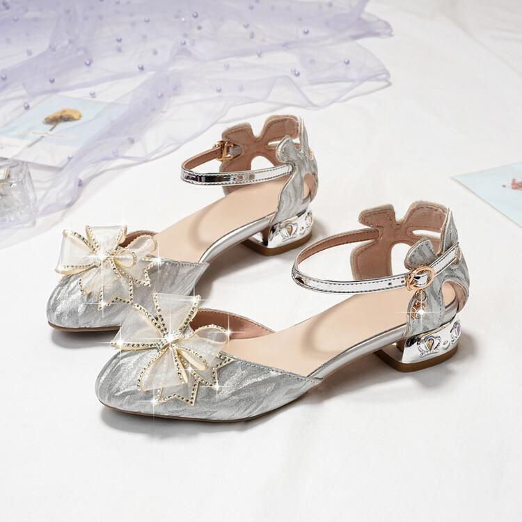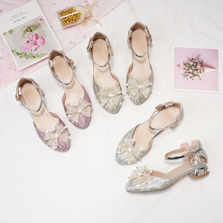 Sandalias de verano para niñas, nuevas sandalias con hebilla de color liso y lazo, zapatos para estudiantes de talla mediana y grande, sandalias de tacón alto de princesa