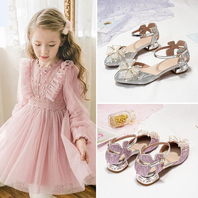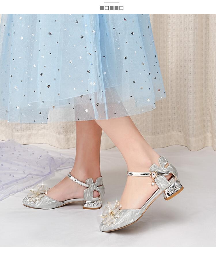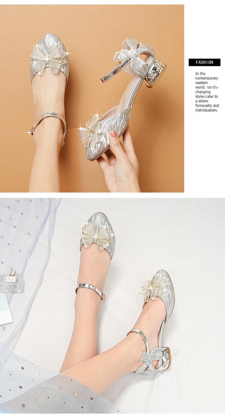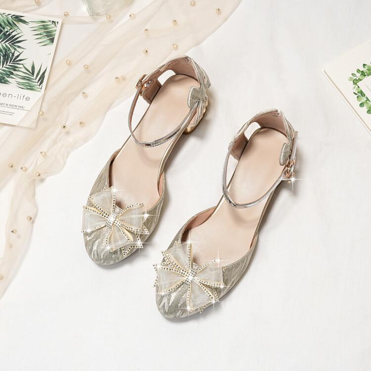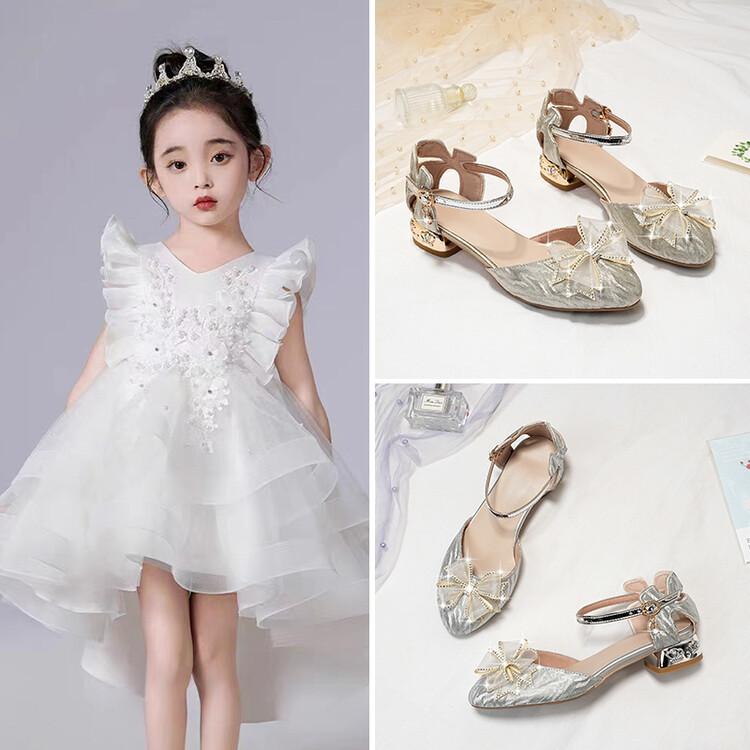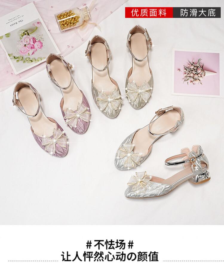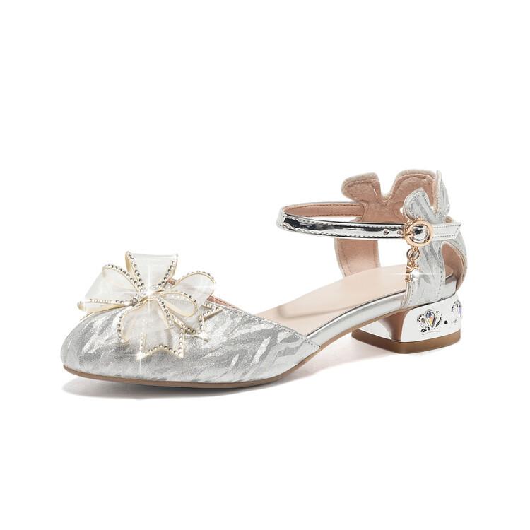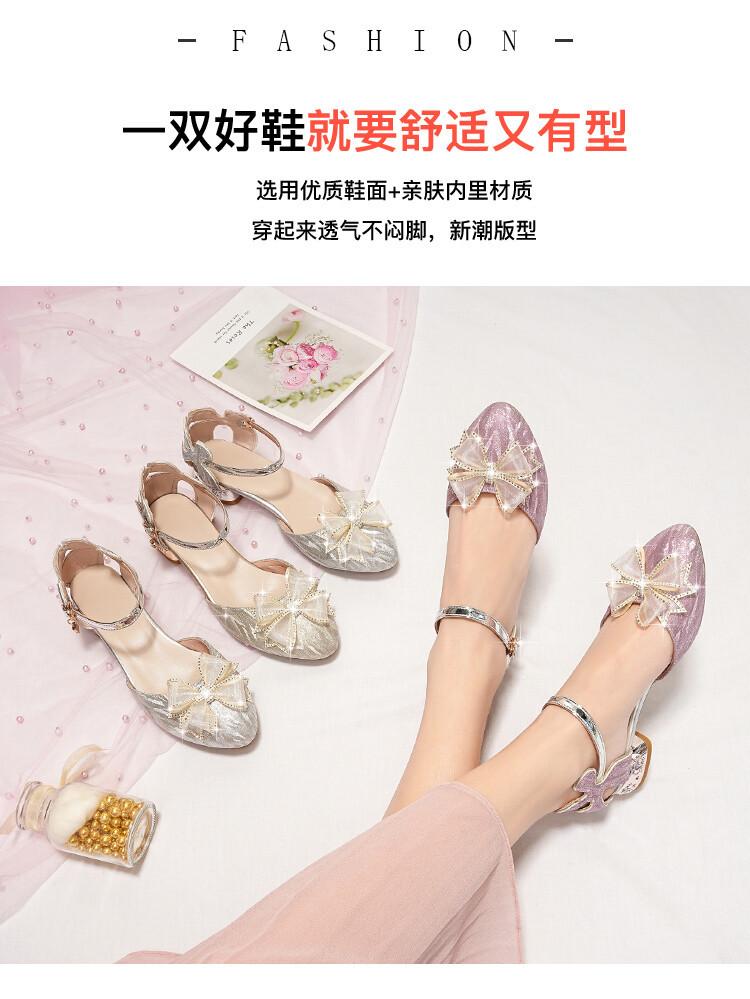 Sandalias de verano para niñas, nuevas sandalias con hebilla de color liso y lazo, zapatos para estudiantes de talla mediana y grande, sandalias de tacón alto de princesa