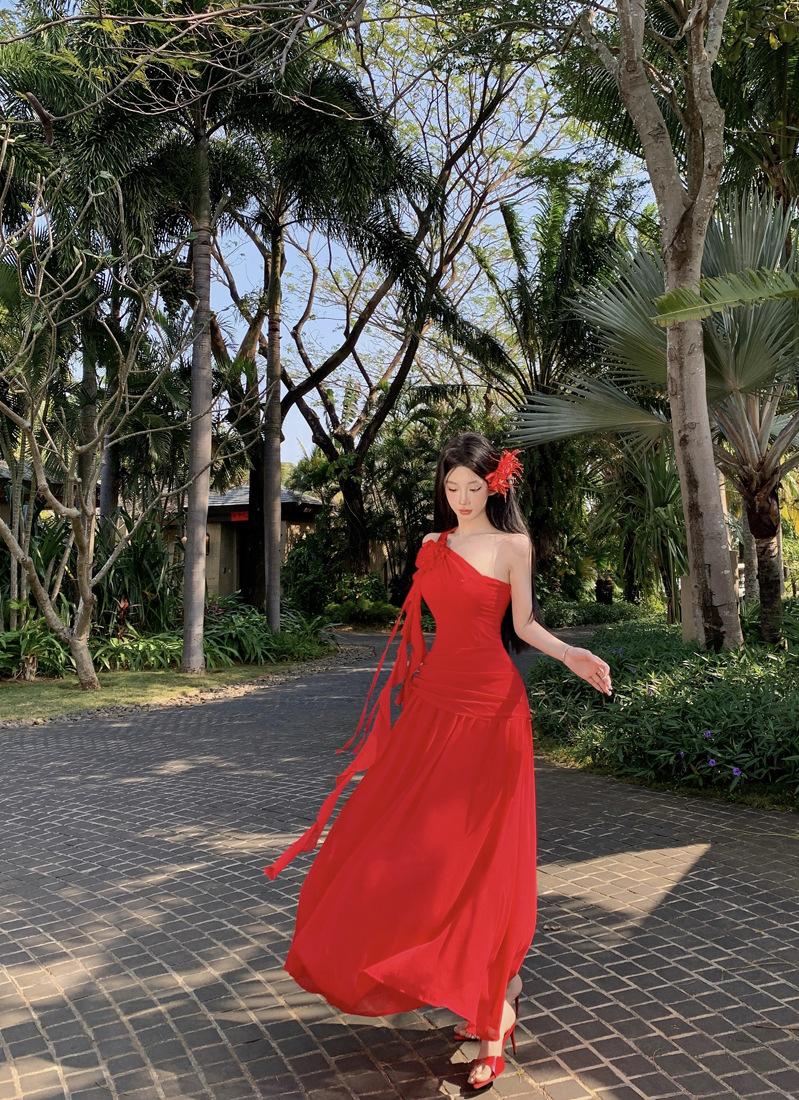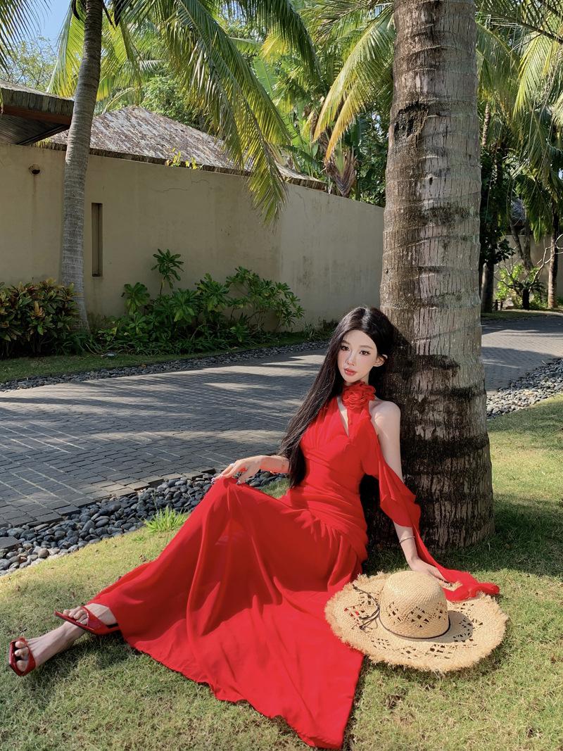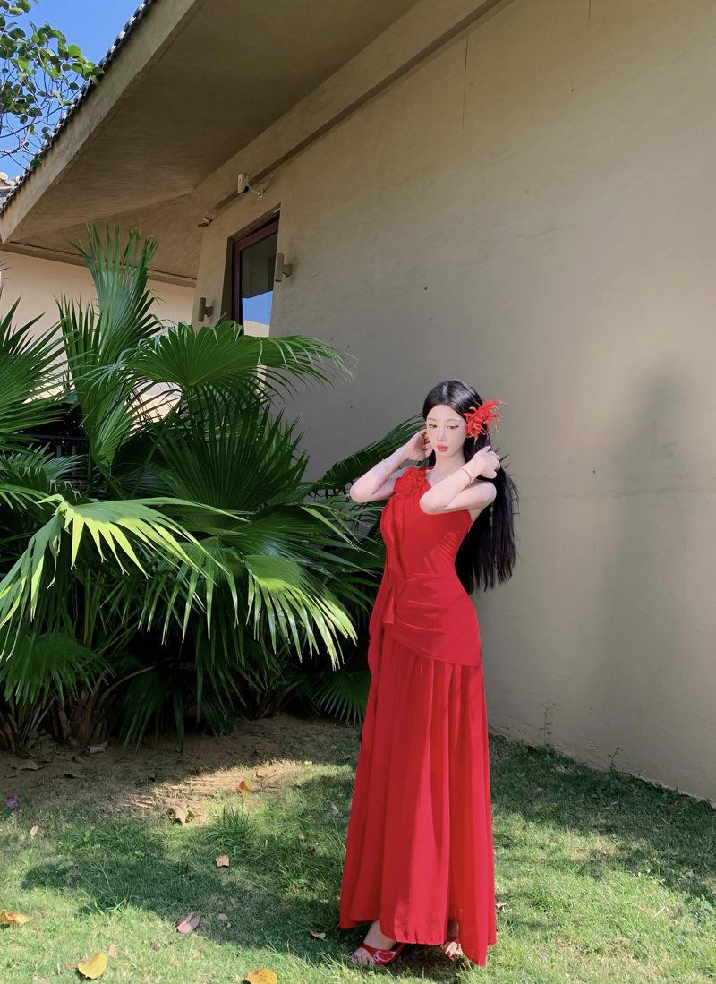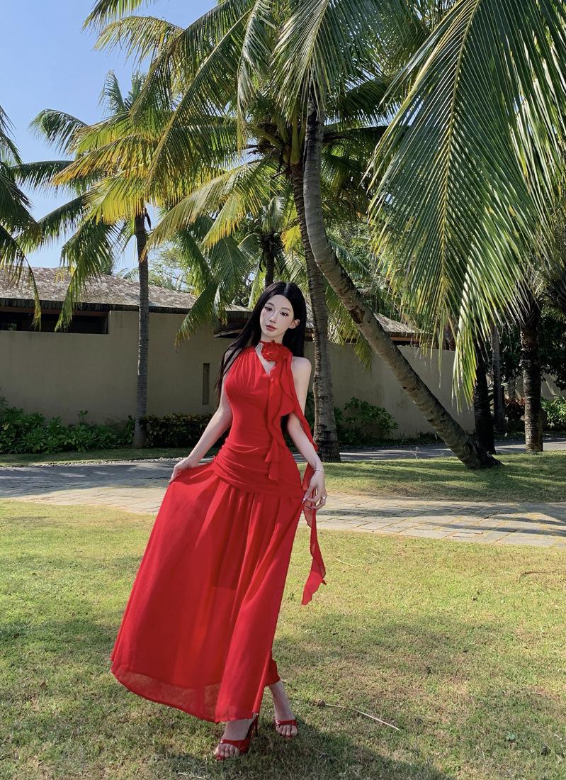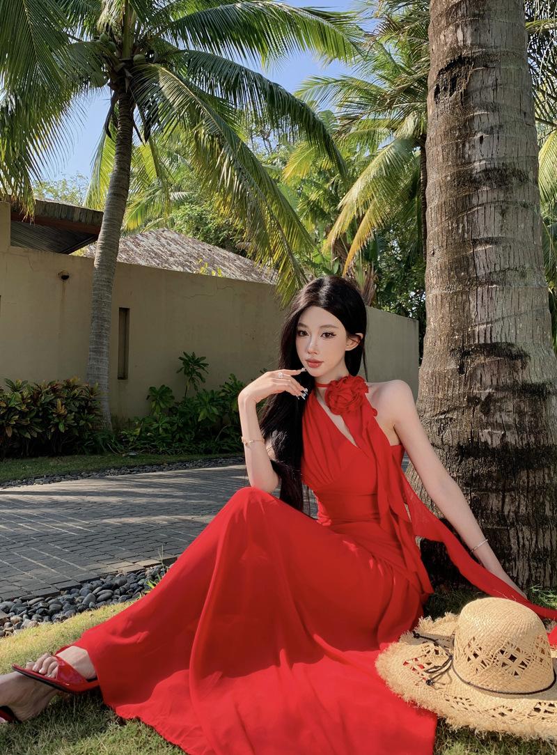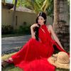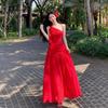 En stock Vestido Vacaciones en la Playa Blanco Rojo Vestido de Tirantes Vestido de Gasa Vestido Espejo de Viaje