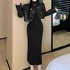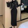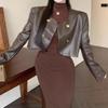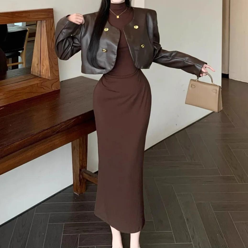 Chaqueta Corta de Cuero Maillard Abrigo Traje Spice Girls Vestido de Otoño para Mujer Cuello Alto a la Cintura Vestido Largo Conjunto de Dos Piezas