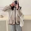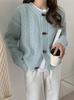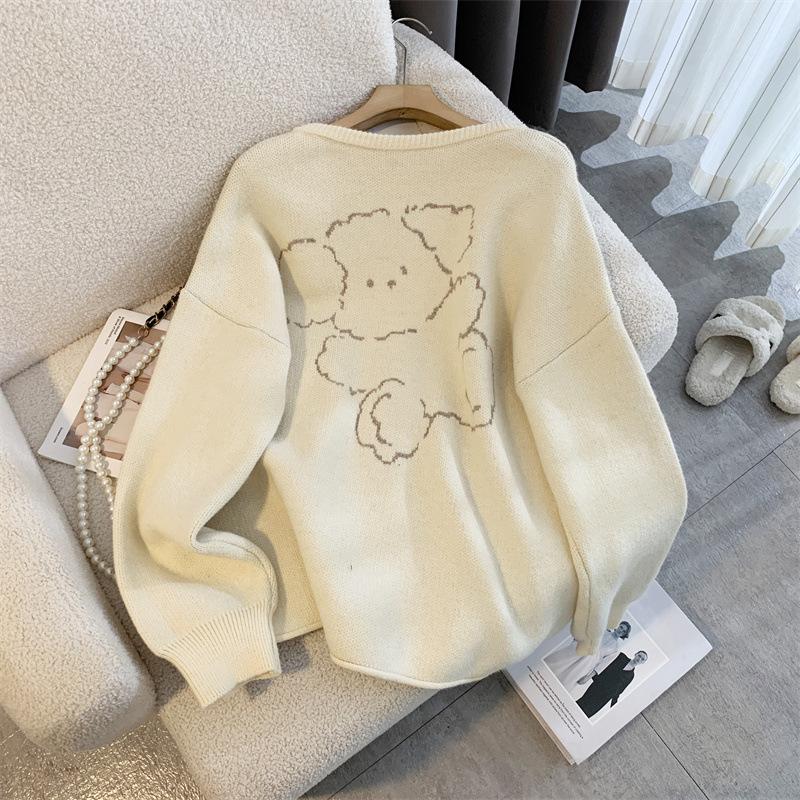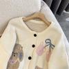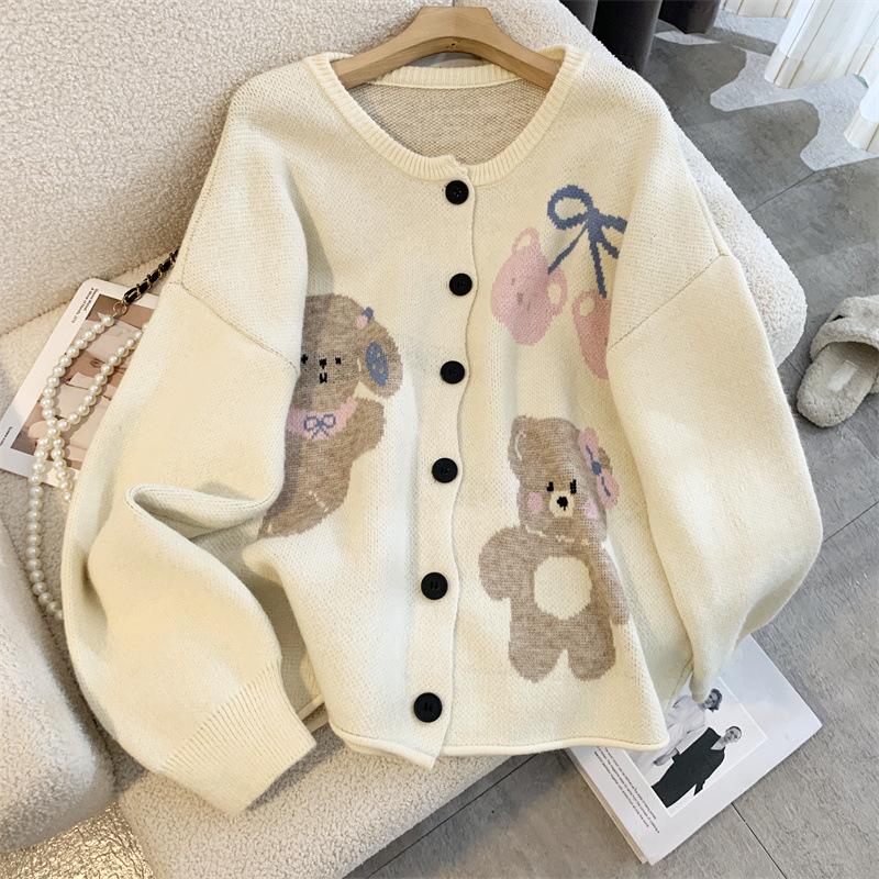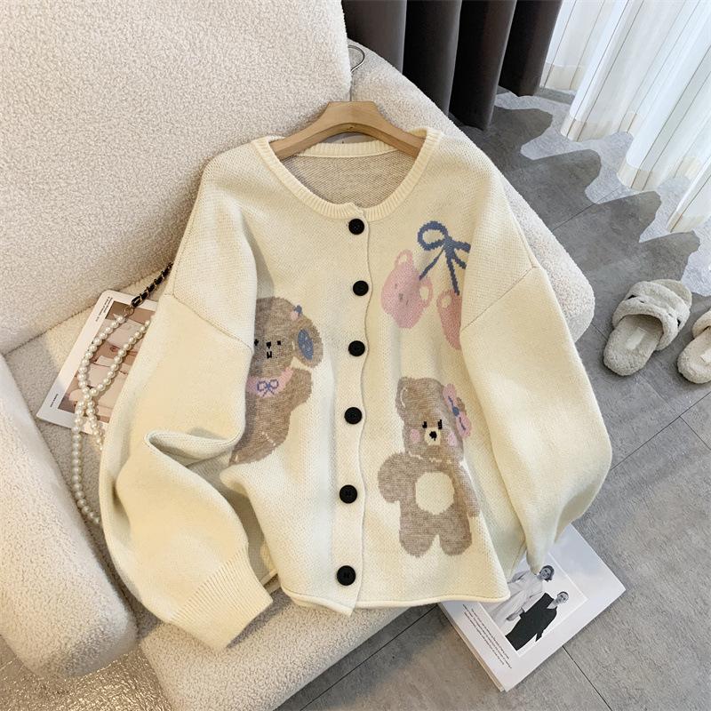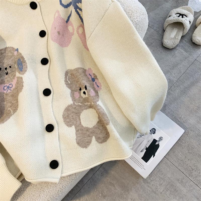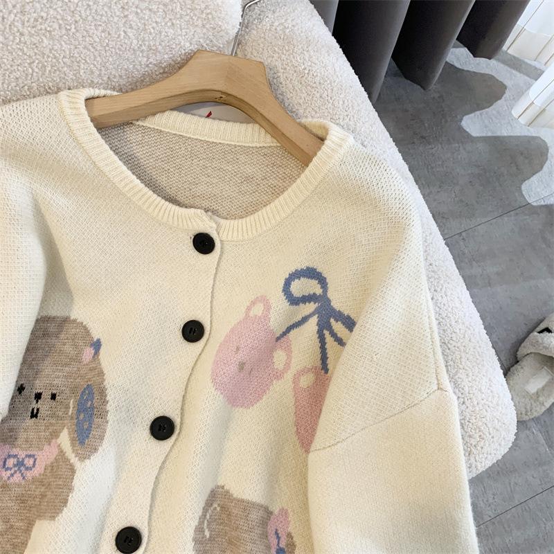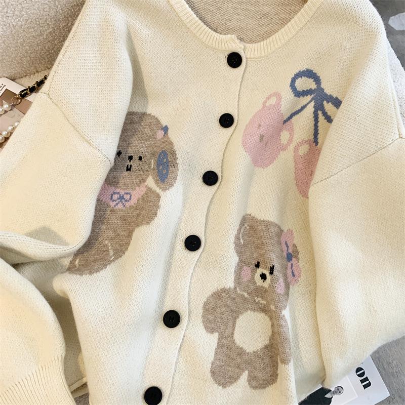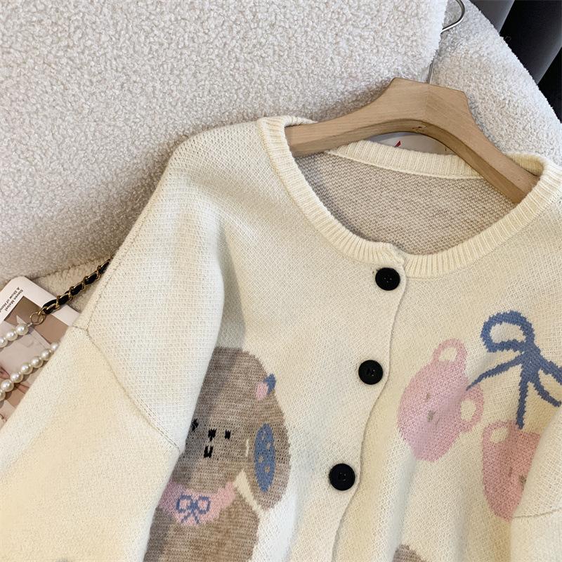 Cárdigan de punto jacquard de oso dulce para mujer, chaqueta tipo suéter versátil, estilo japonés, retro, pequeña y holgada, para principios de otoño