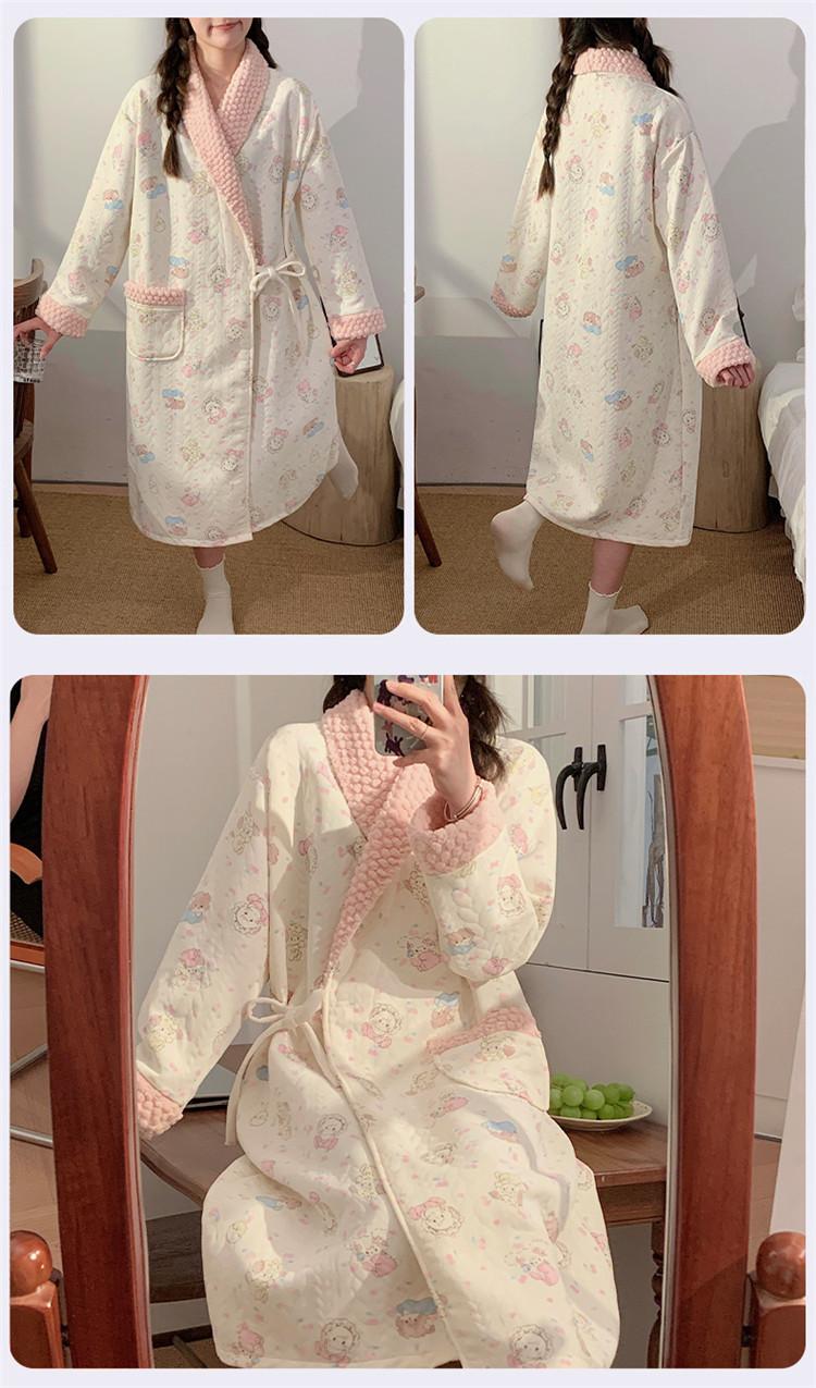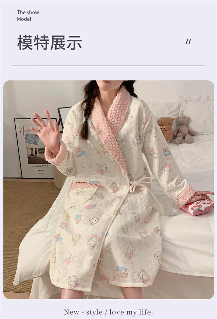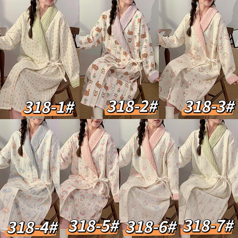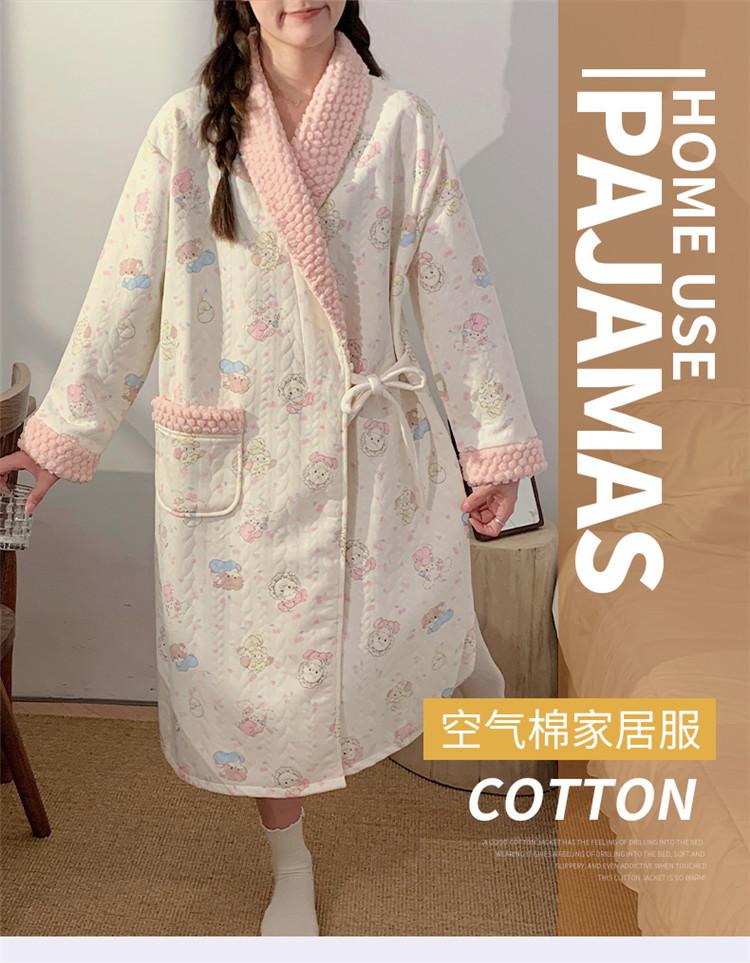 Pijama Sándwich de Algodón Aire para Mujer Otoño e Invierno Batín Grueso con Cordones Manga Larga Talla Grande Camisón Estilo Largo Ropa para el Hogar Camisón