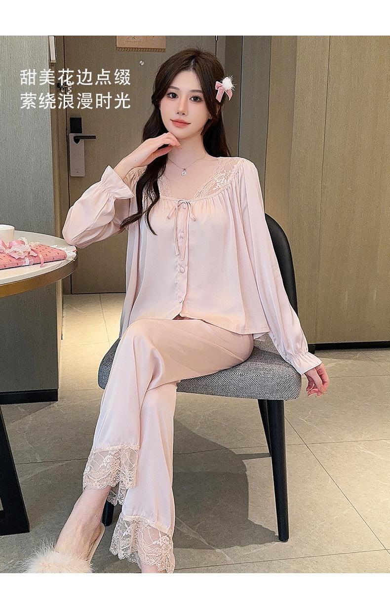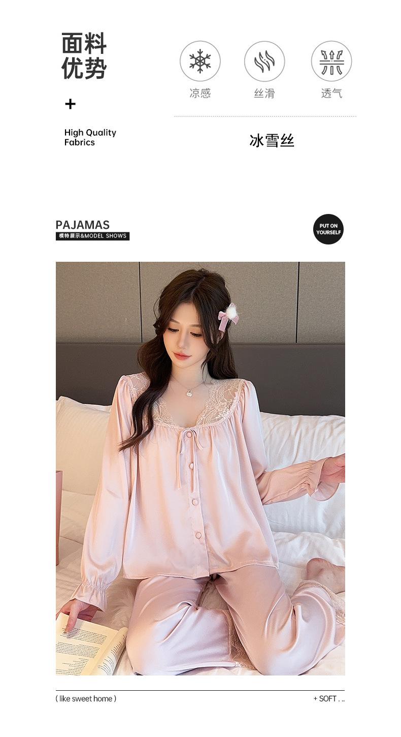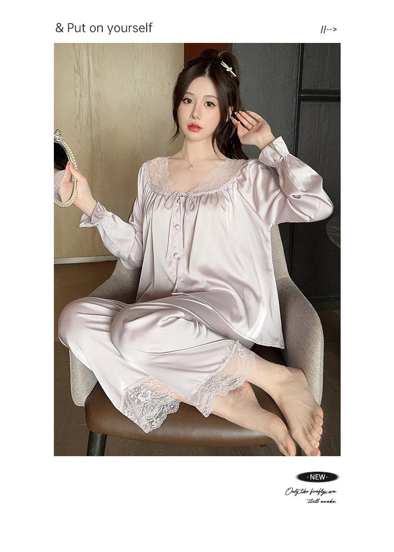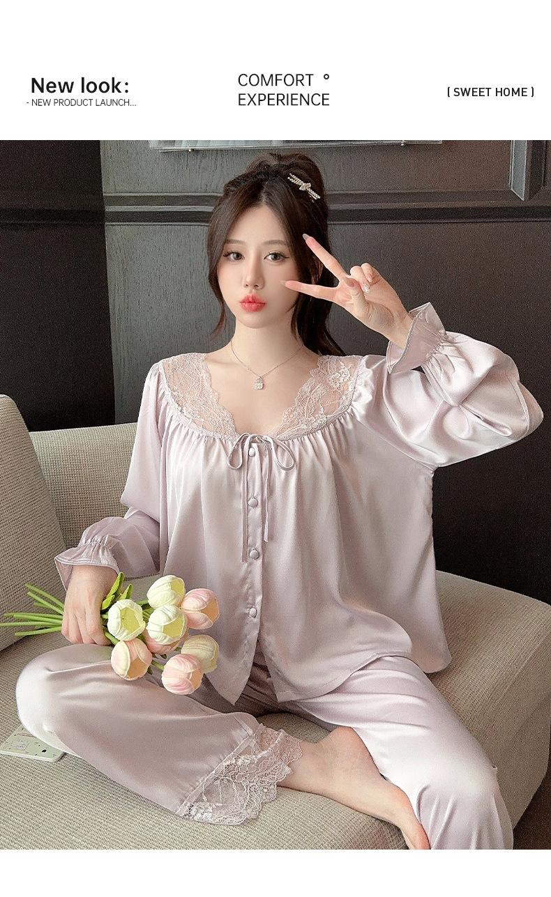 Pijamas de mujer estilo Pure Desire, otoño 2024, nuevos conjuntos de seda hielo y nieve de manga larga para el hogar, traje de corte con encaje dulce.
