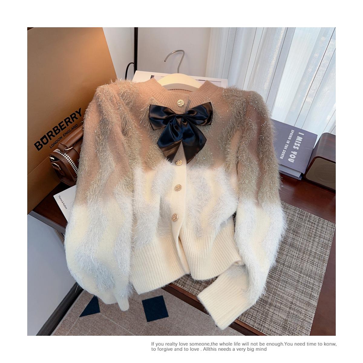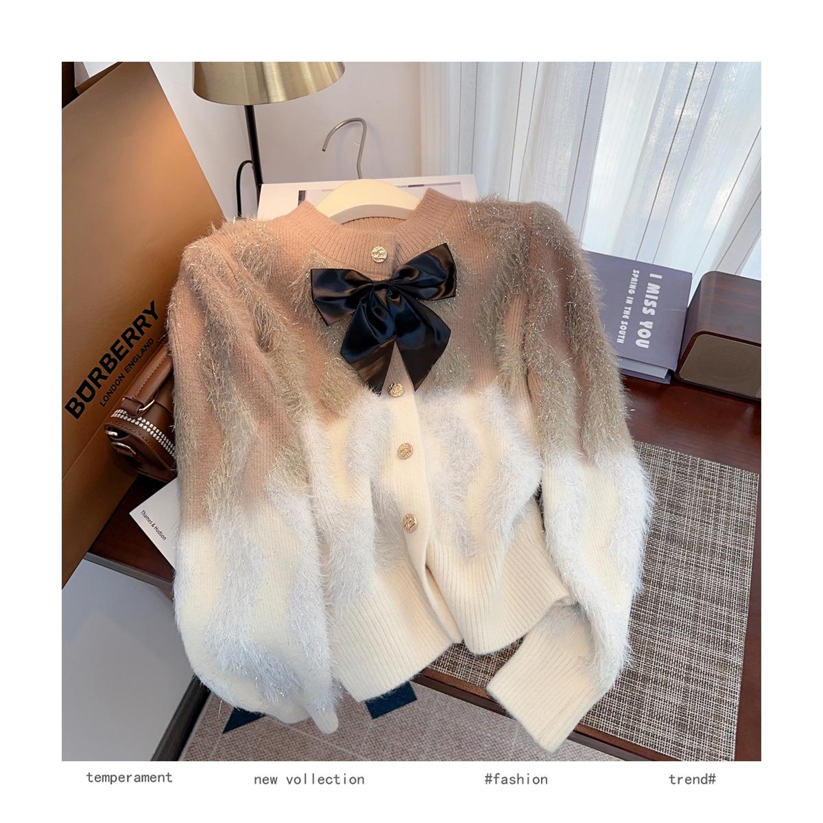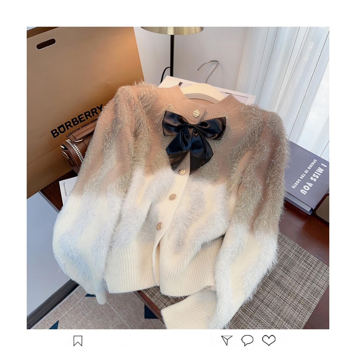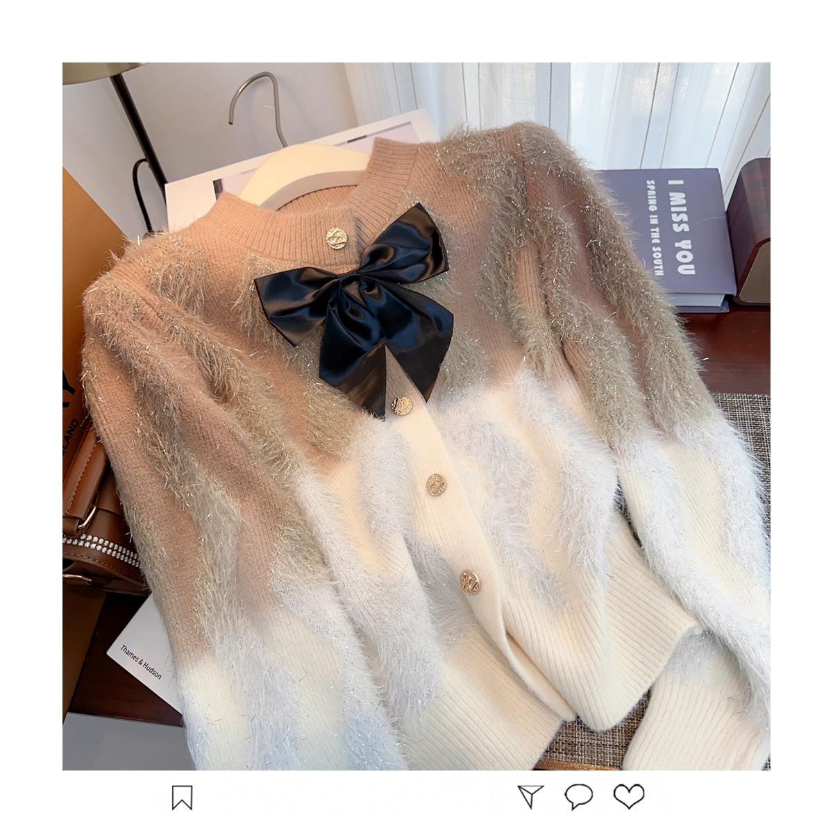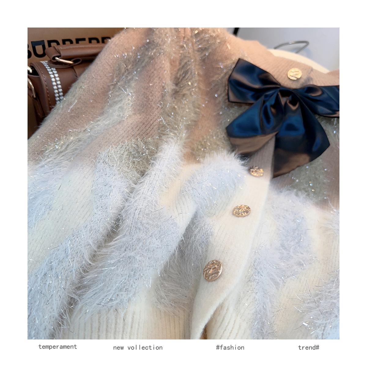 Abrigo de piel de visón con lazo, suéter de alta gama con borlas de seda dorada, rayas onduladas y degradado de color.