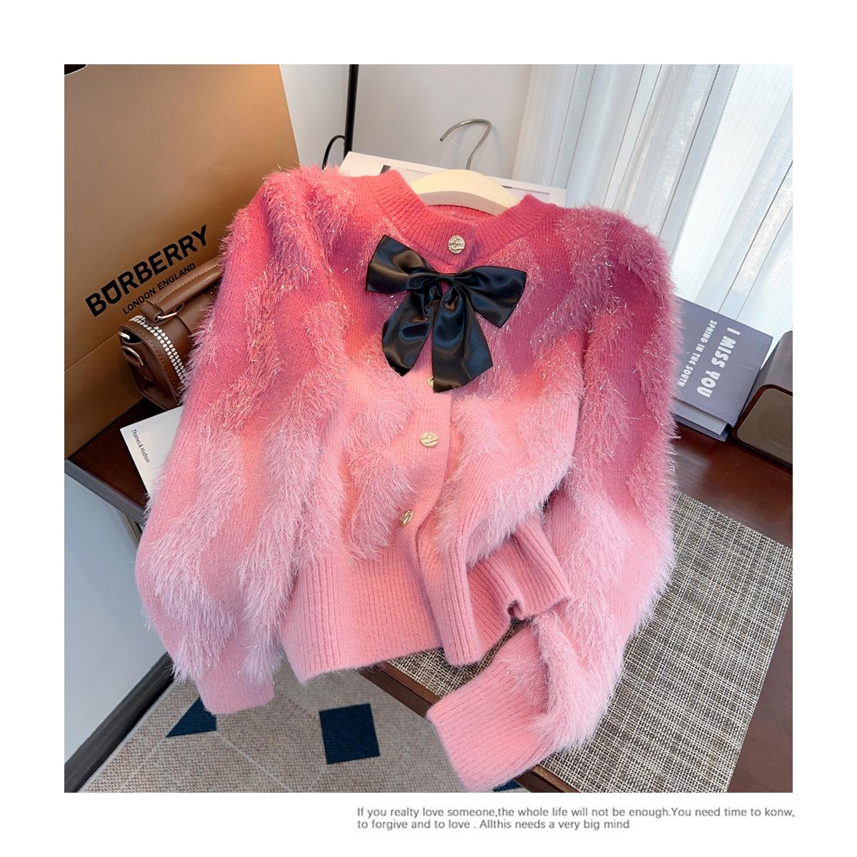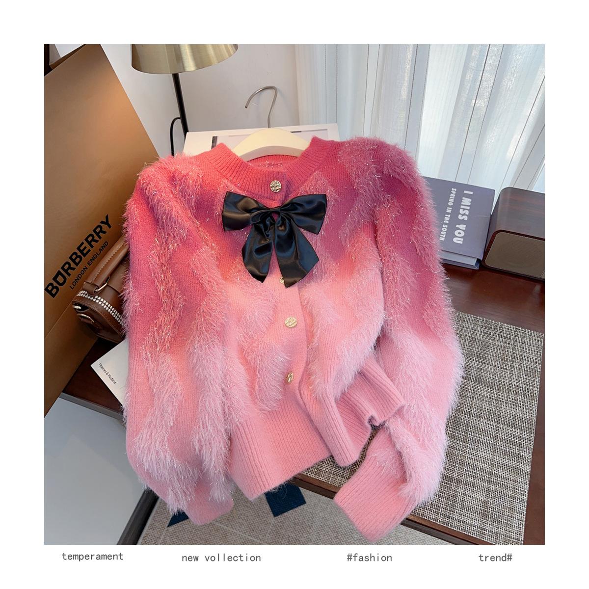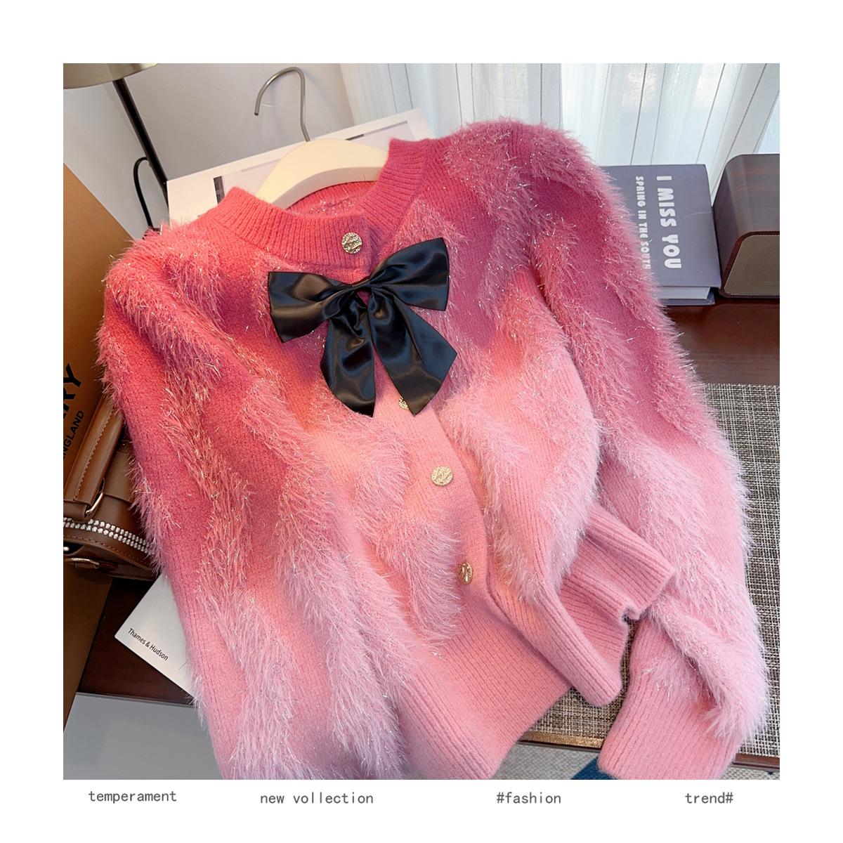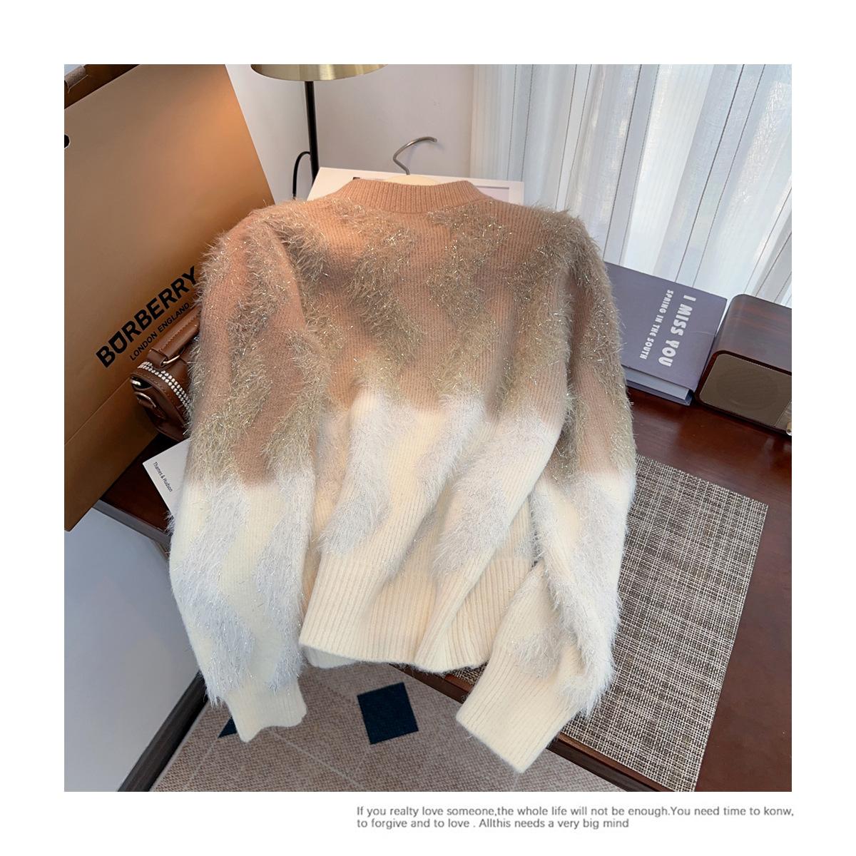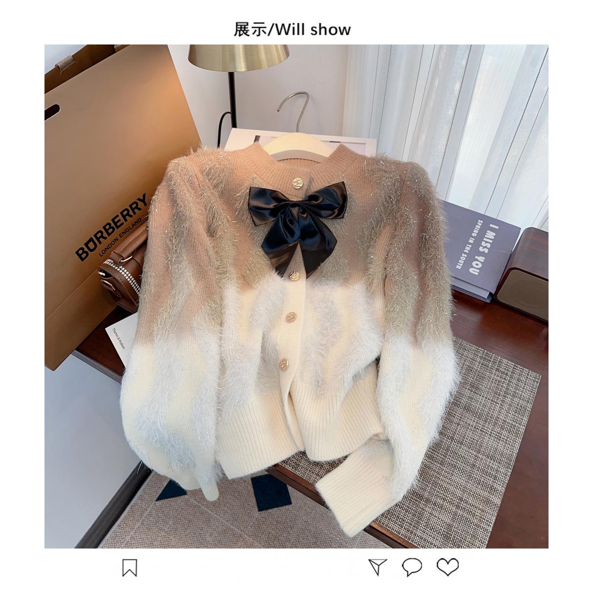 Abrigo de piel de visón con lazo, suéter de alta gama con borlas de seda dorada, rayas onduladas y degradado de color.