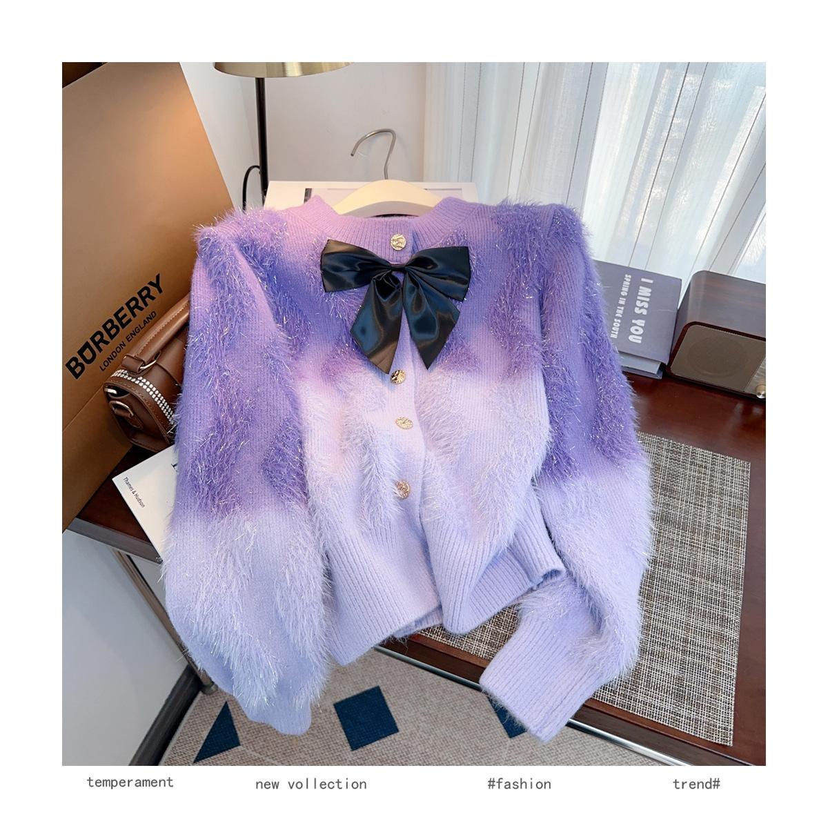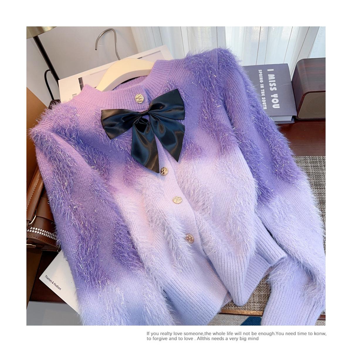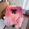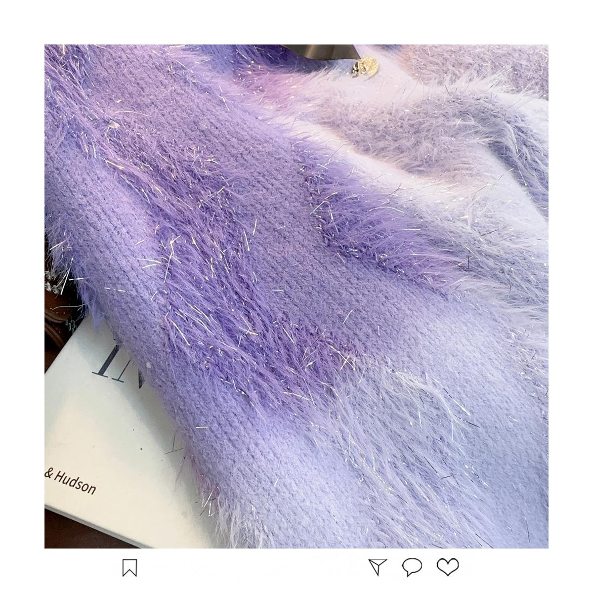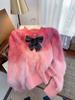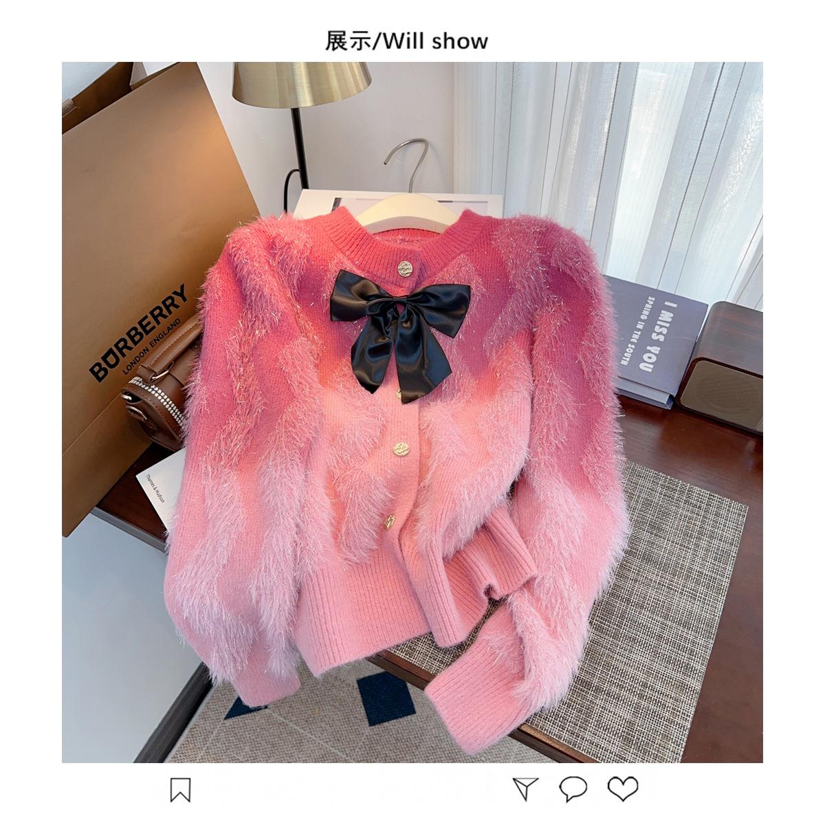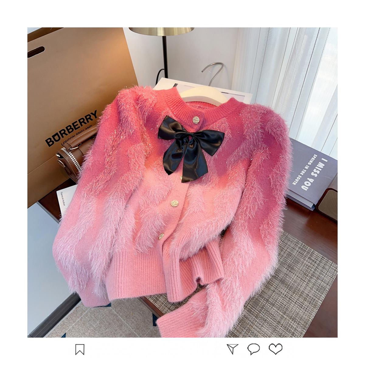 Abrigo de piel de visón con lazo, suéter de alta gama con borlas de seda dorada, rayas onduladas y degradado de color.