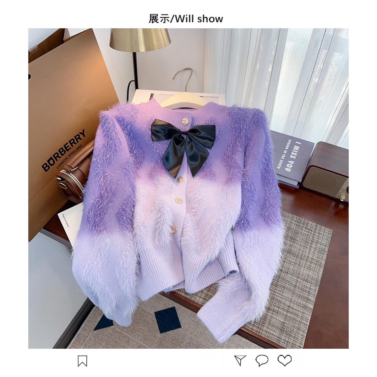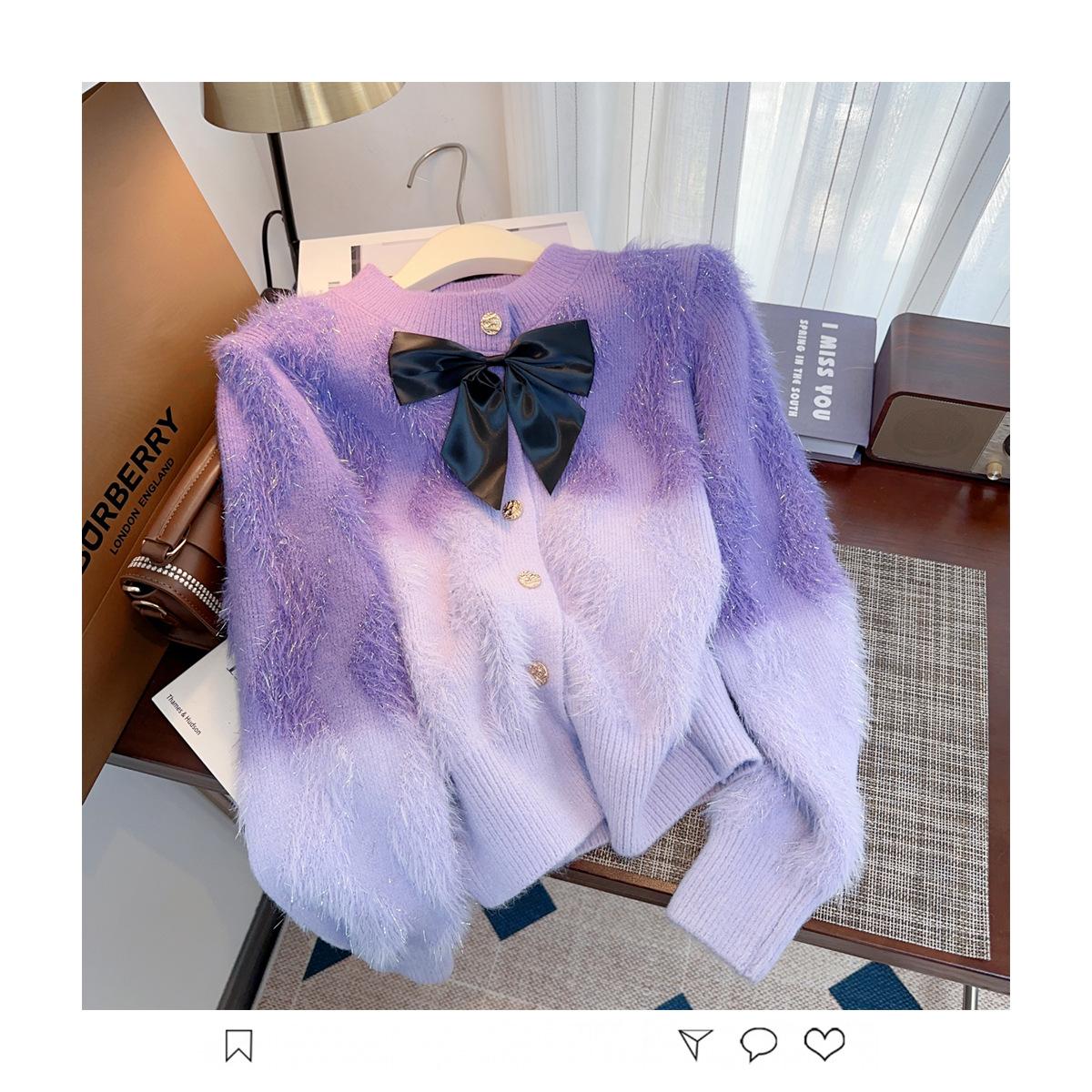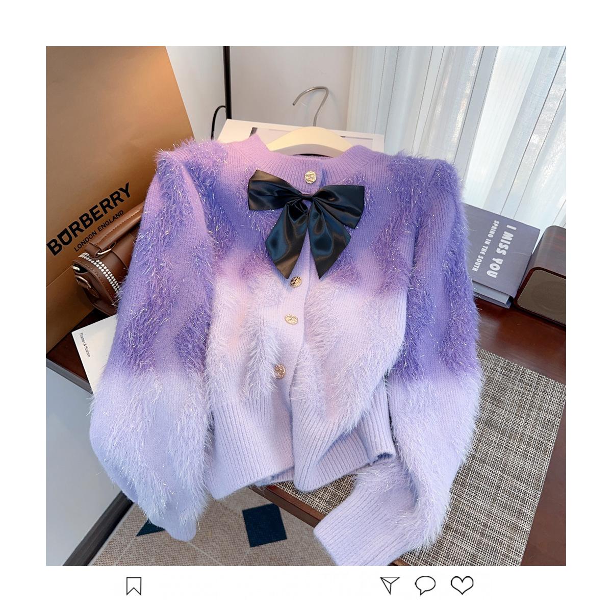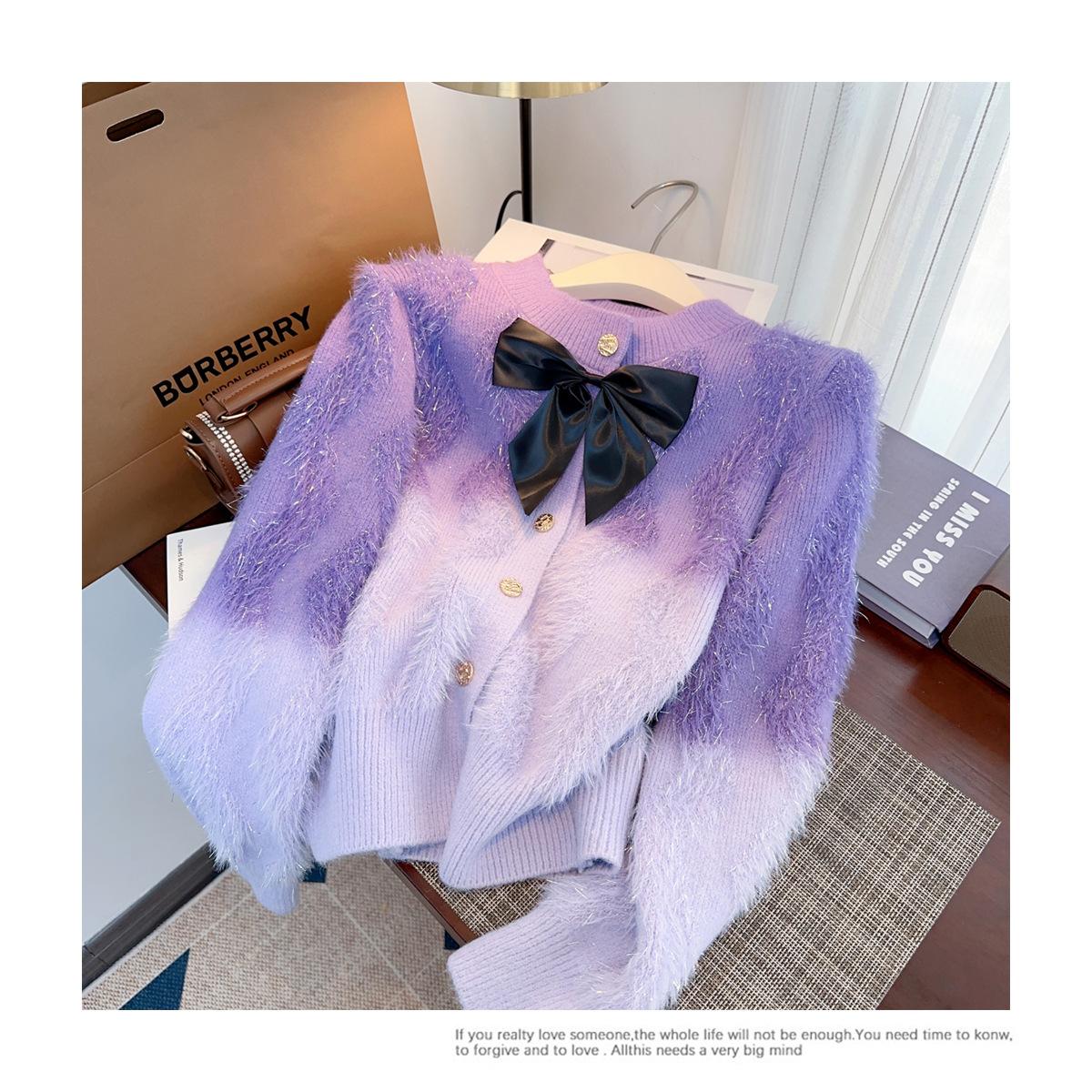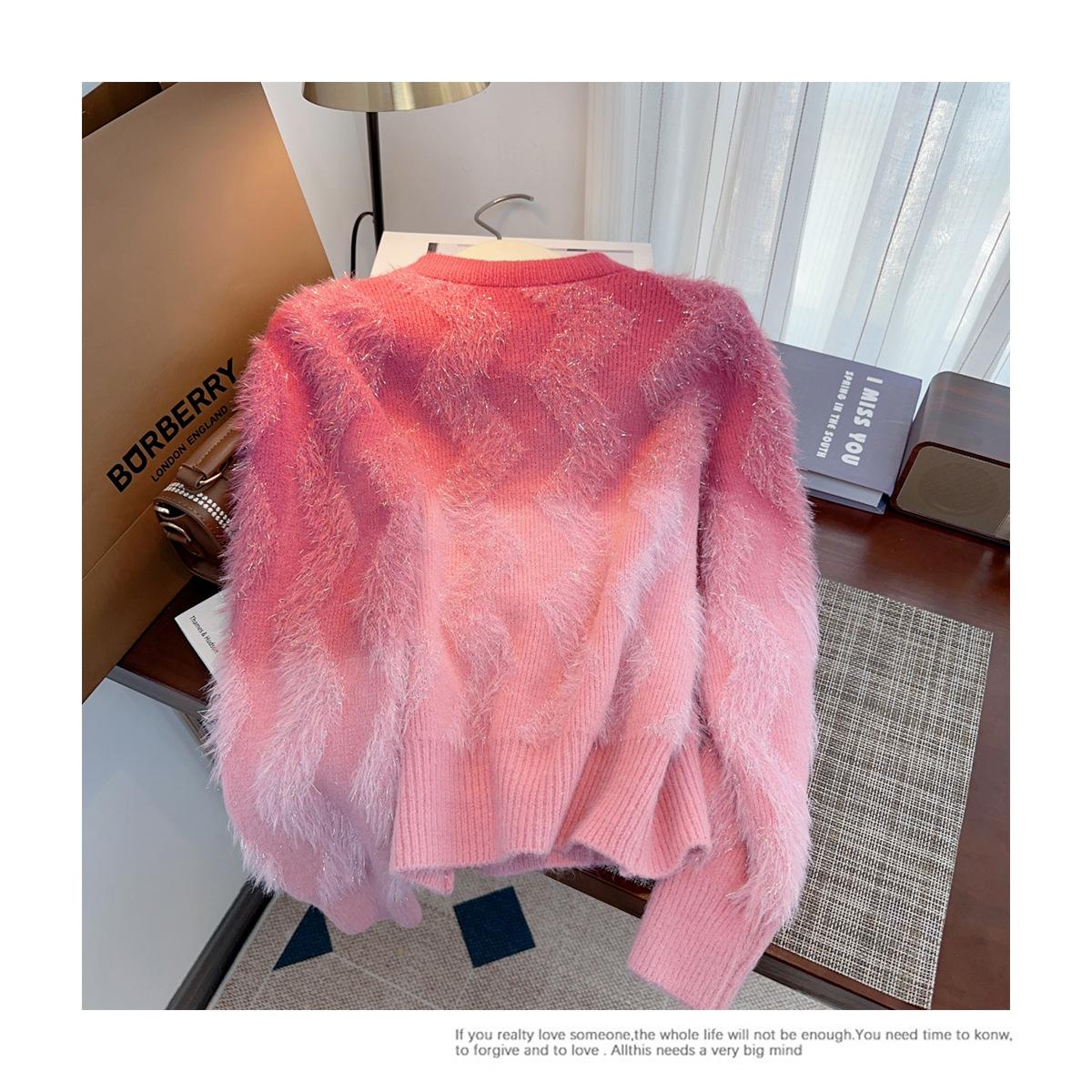 Abrigo de piel de visón con lazo, suéter de alta gama con borlas de seda dorada, rayas onduladas y degradado de color.
