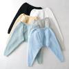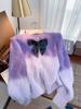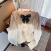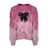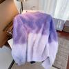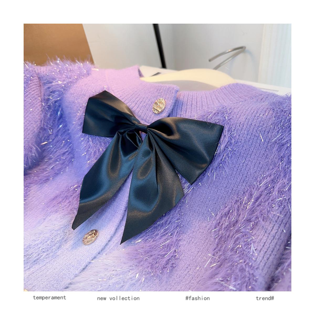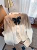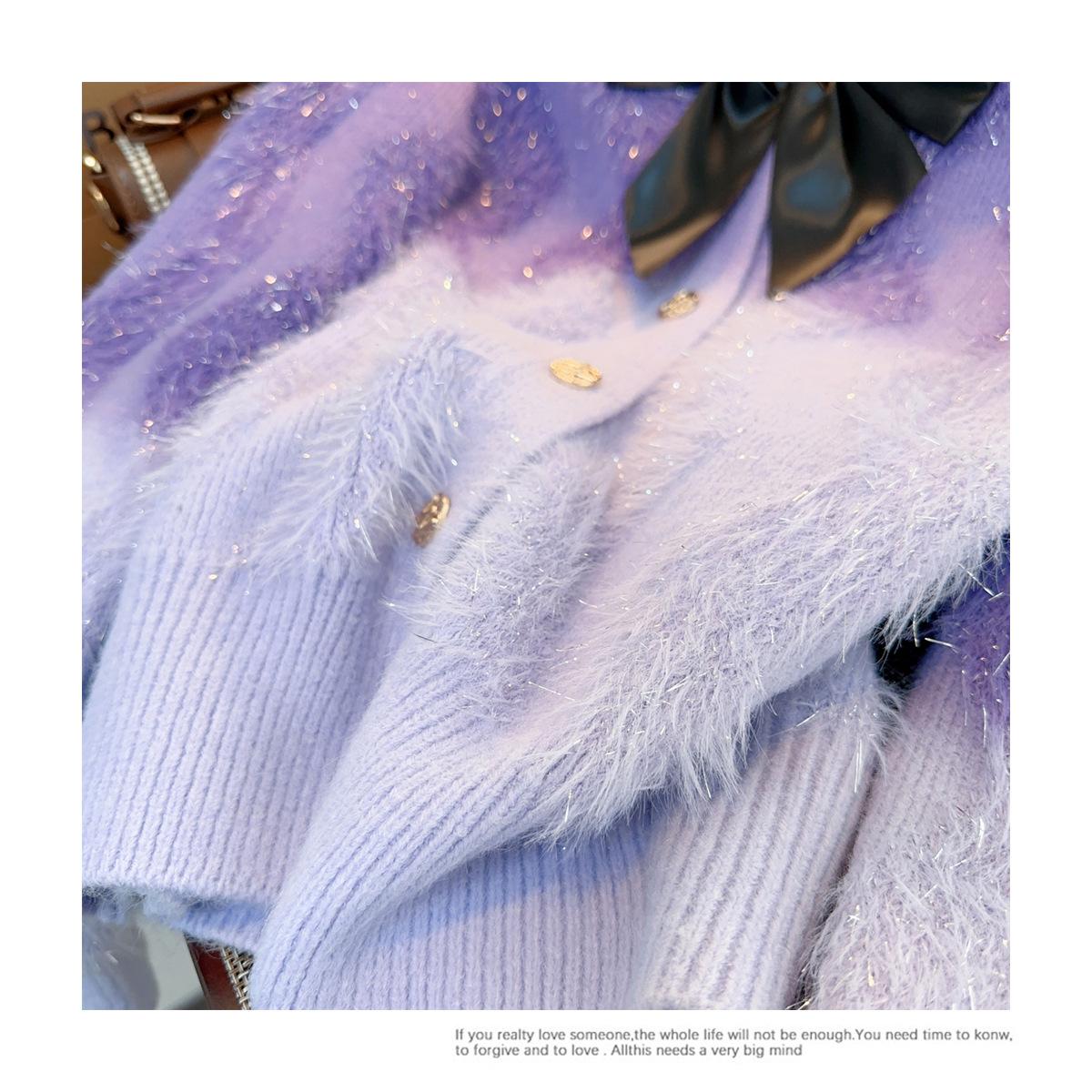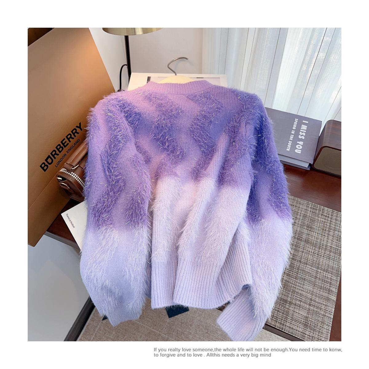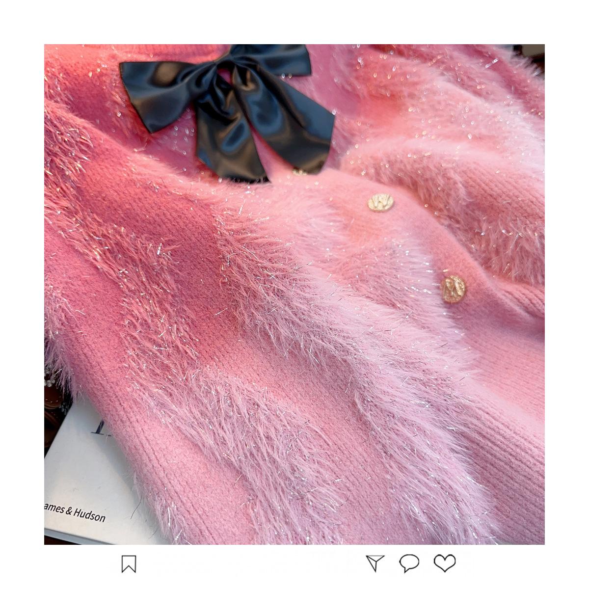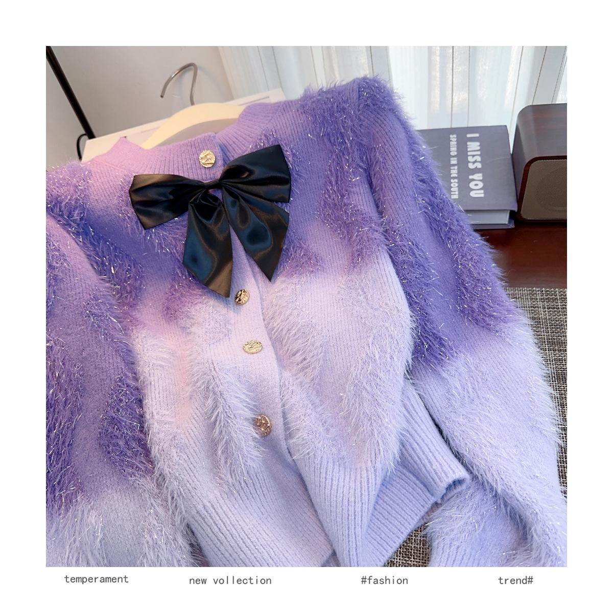 Abrigo de piel de visón con lazo, suéter de alta gama con borlas de seda dorada, rayas onduladas y degradado de color.