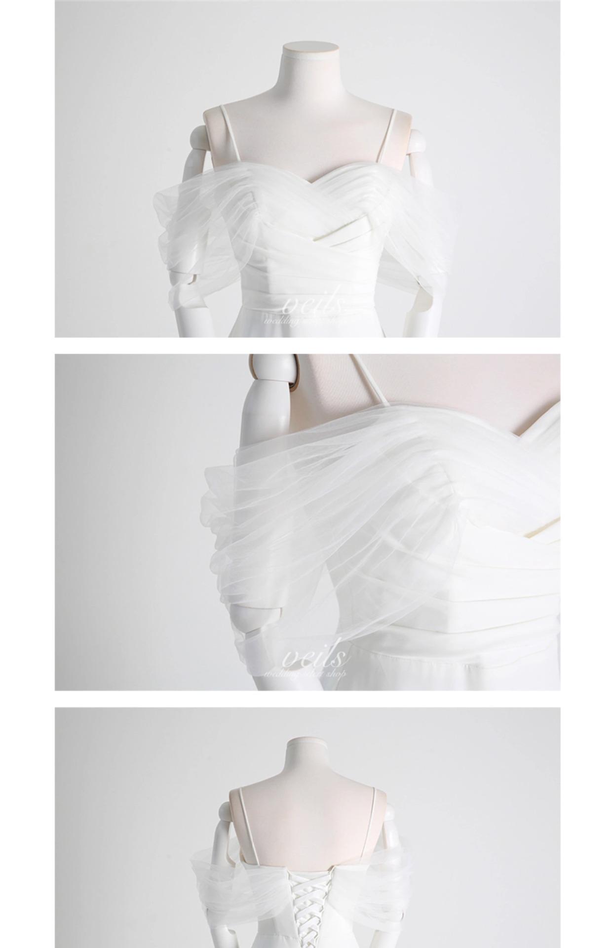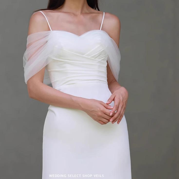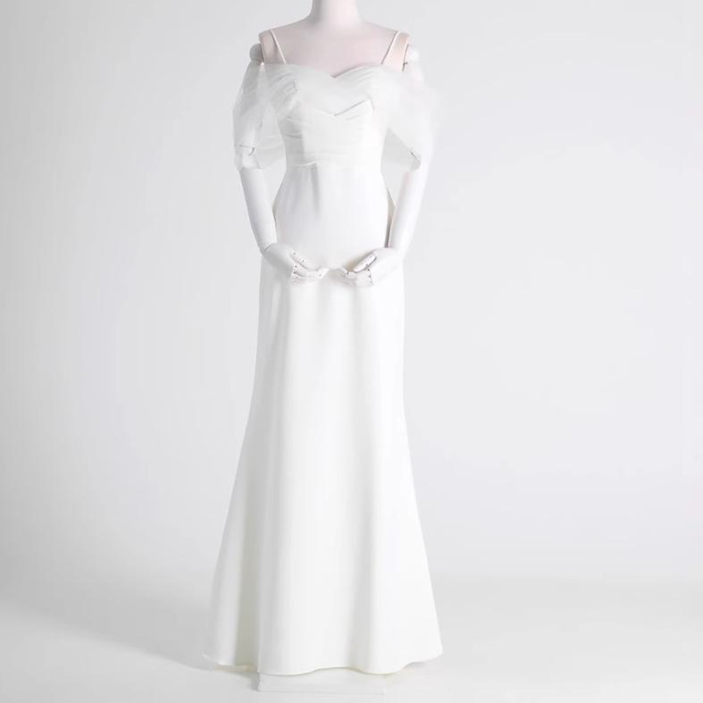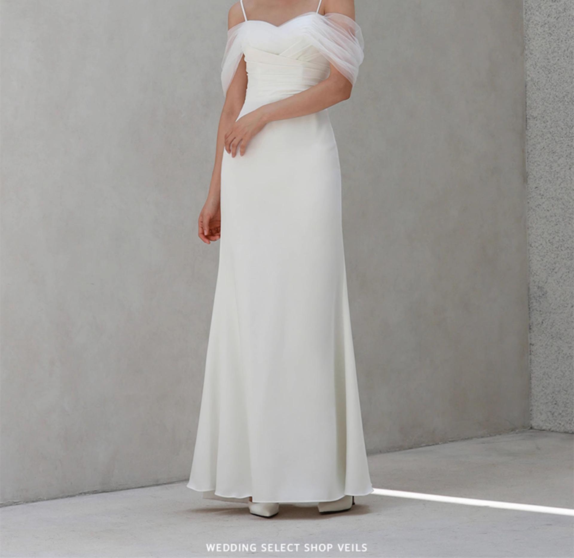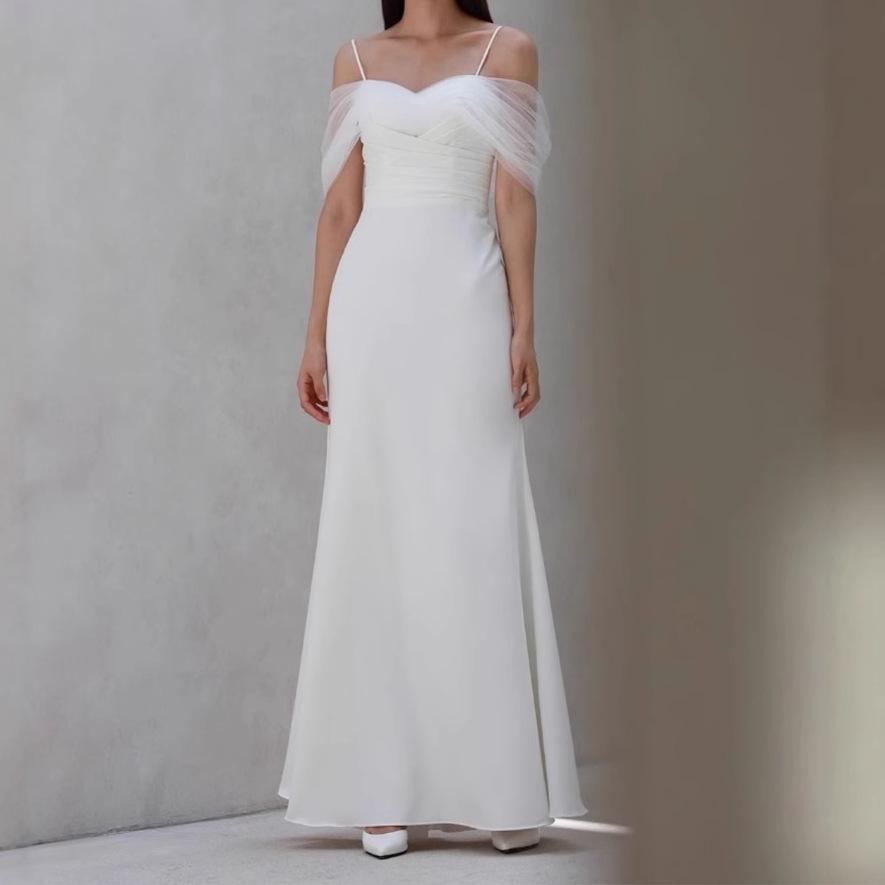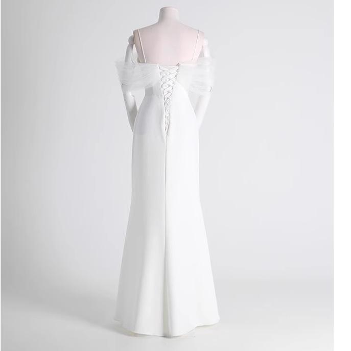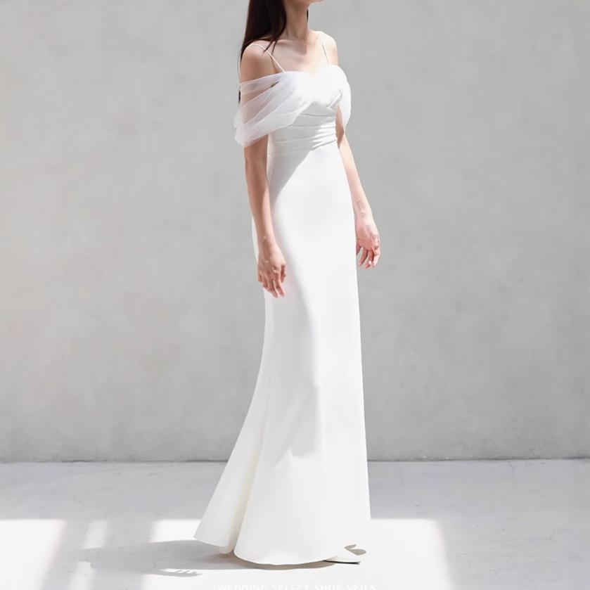 Vestido de Novia Ligero Blanco Simple con Tirantes Descubiertos Ajustado Adelgazante Elegante Cola de Pez Vestido de Novia Ligero para Boda en Jardín