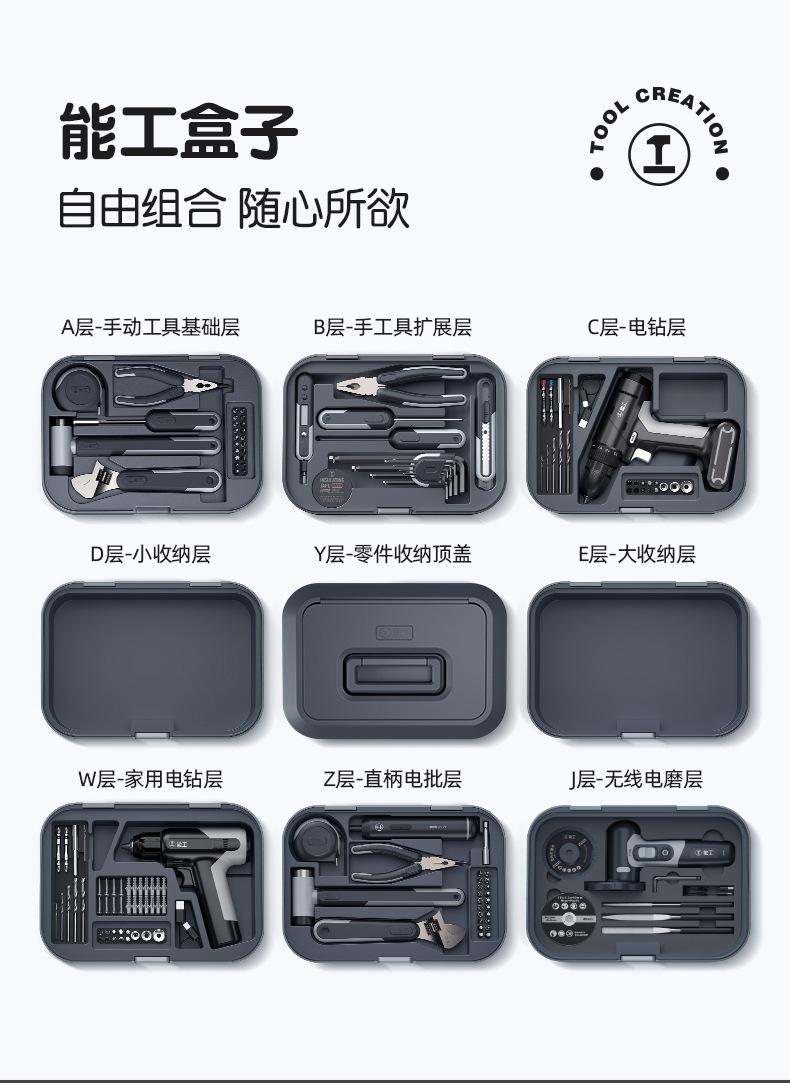 Y2-ab (manual set), Y3-abe (hand tools + large storage layer), Y3-abw (home version package), Y4-abwd (home ed...